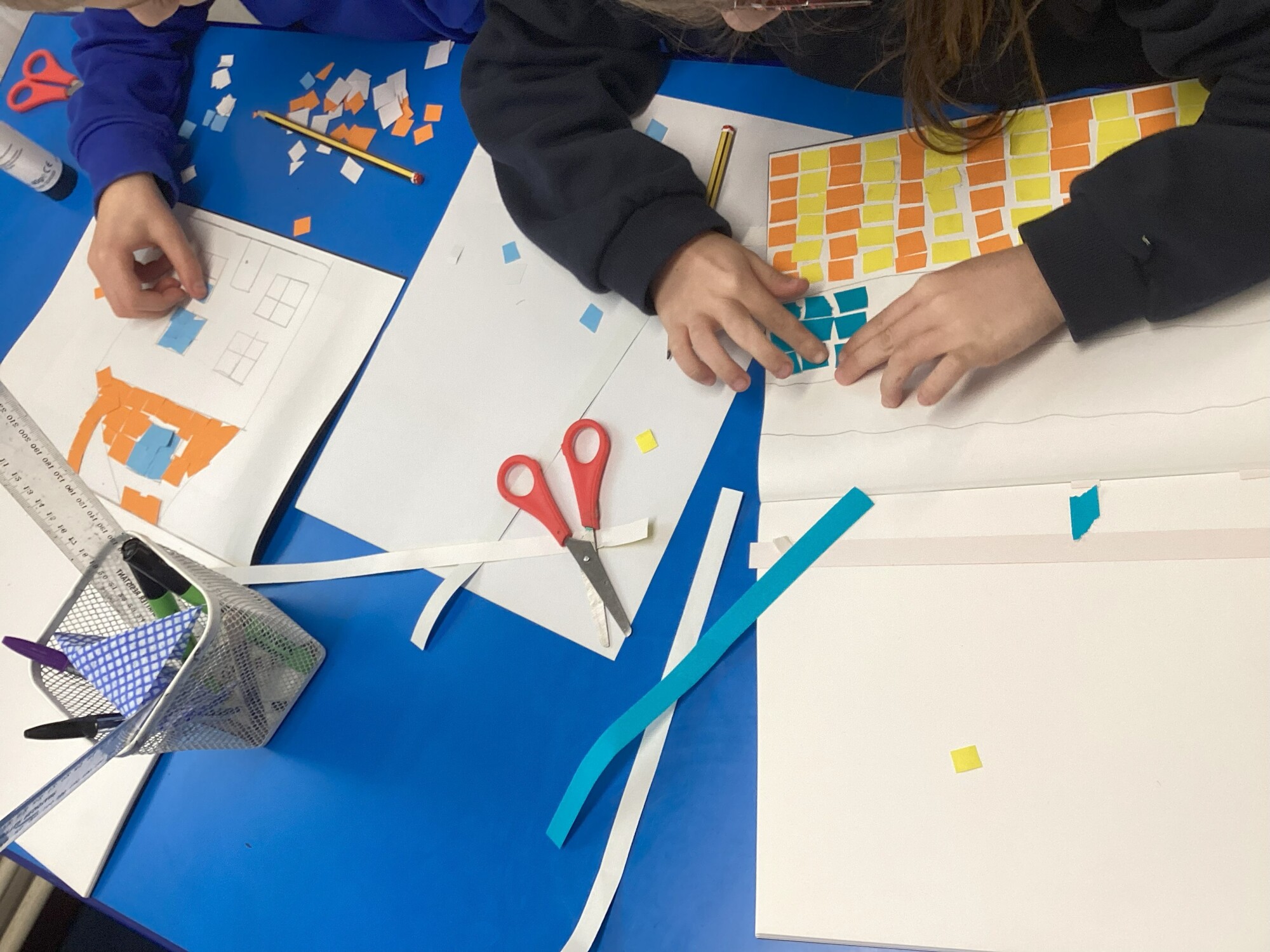 It has been a wonderfully creative and meticulous process as they planned out their designs and carefully pieced them together. Their concentration and attention to detail have been impressive, and the classroom has been filled with a lovely, calm buzz of artistic focus.