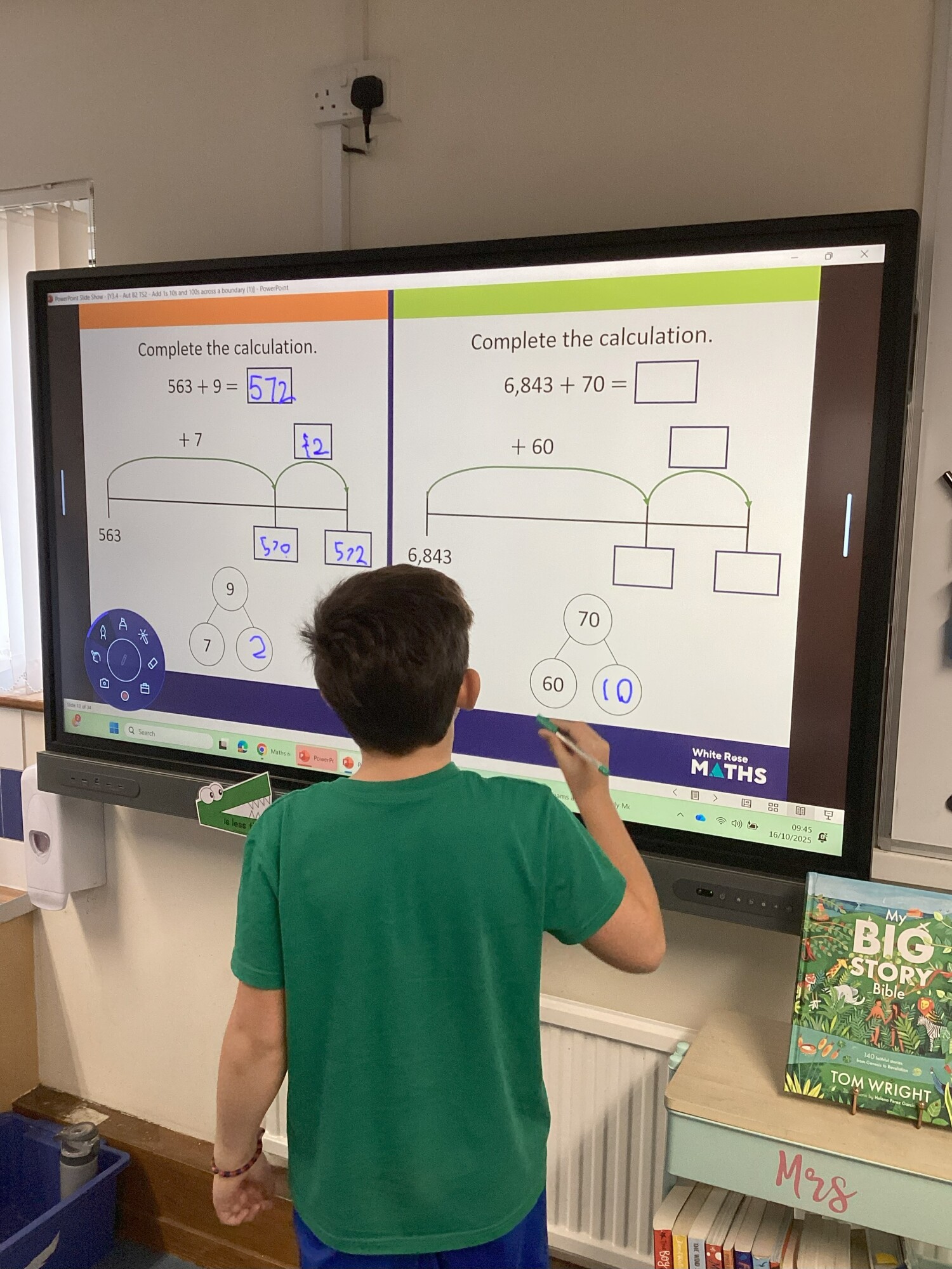 In maths, we have started our new unit on addition and subtraction. We have been using number lines to help us add and subtract 1s, 10s, 100s and even 1,000s. The children have shown fantastic focus and teamwork as they explored how numbers change across boundaries. It has been brilliant to see how confidently everyone is using their place value knowledge to reason and problem solve.