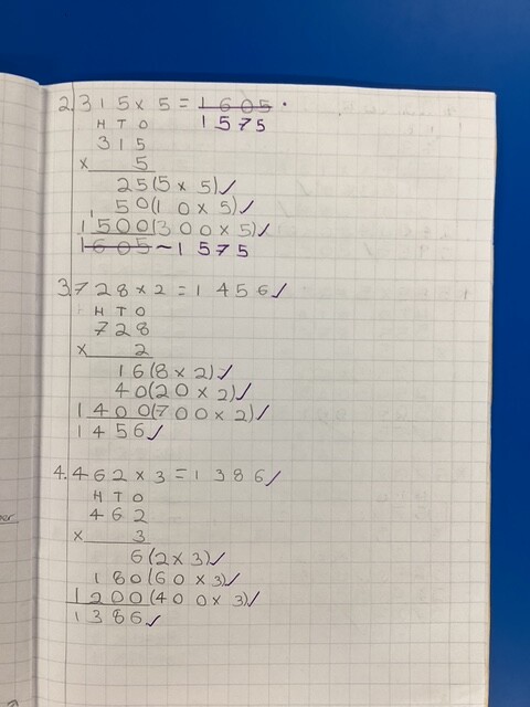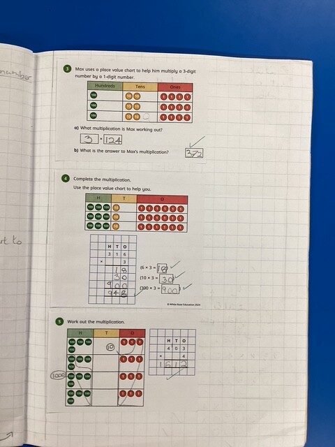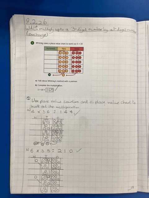 Once the children were confident with the practical side, we moved on to recording their thinking using written and formal methods in their books. The transition from concrete resources to formal calculations was smooth and purposeful, and the children showed growing confidence and accuracy as the week progressed. The photographs alongside this blog show this learning journey clearly, from practical exploration to structured written work.