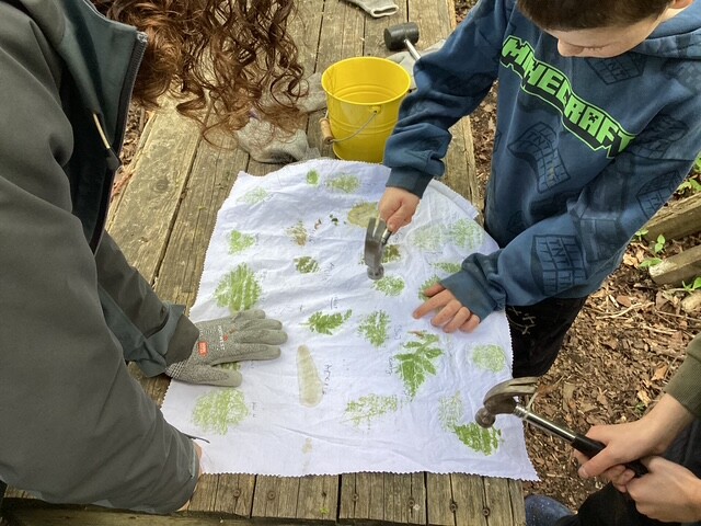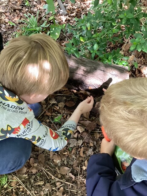 The children made the most of every part of the environment. They were busy insect spotting and using magnifying glasses to look closely at what they could find. Some explored fungi using identification guides, while others collected leaves and created their own leaf prints using hammers, showing real care and focus in their work.