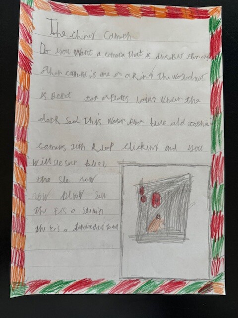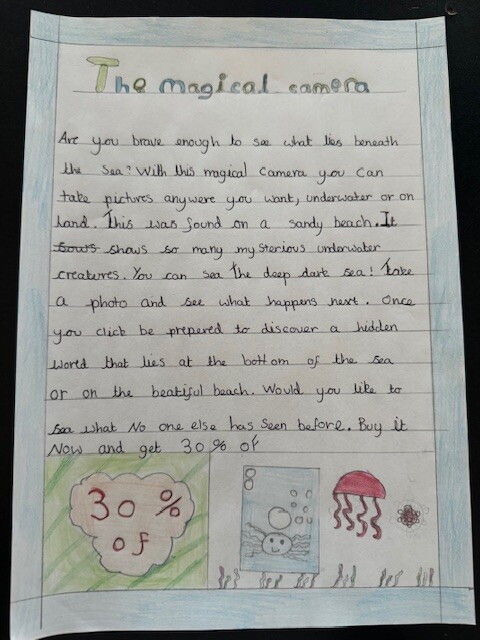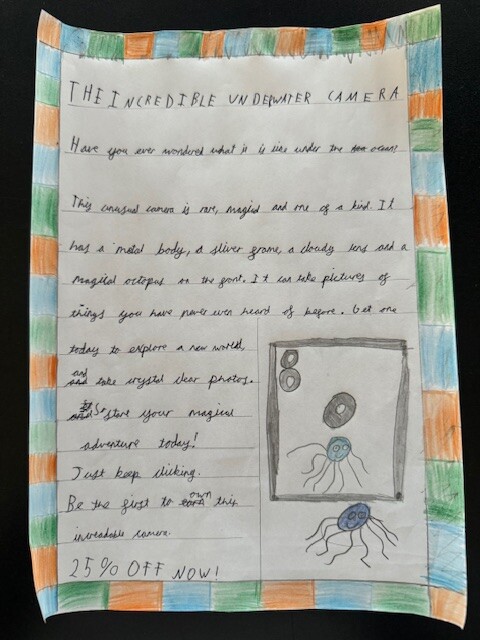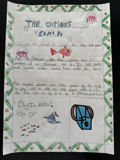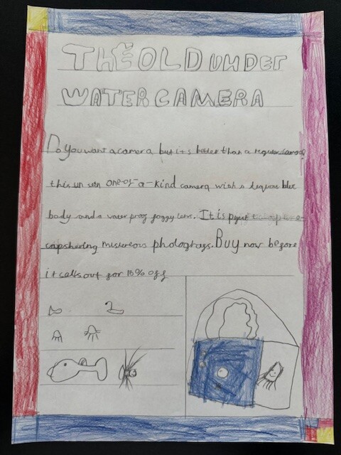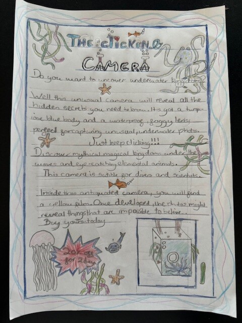 We focused on using product description to help persuade the reader. The children thought carefully about how to describe the camera in a way that would make someone want to buy it, using ideas like mystery, adventure and discovery beneath the sea.