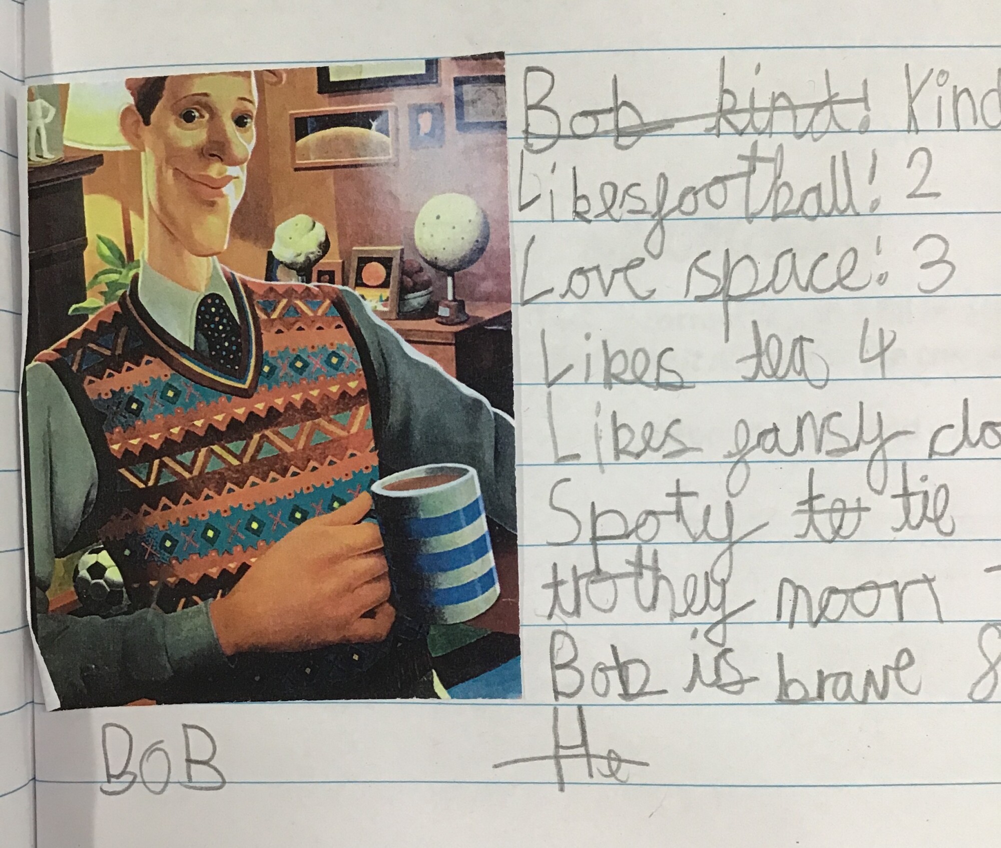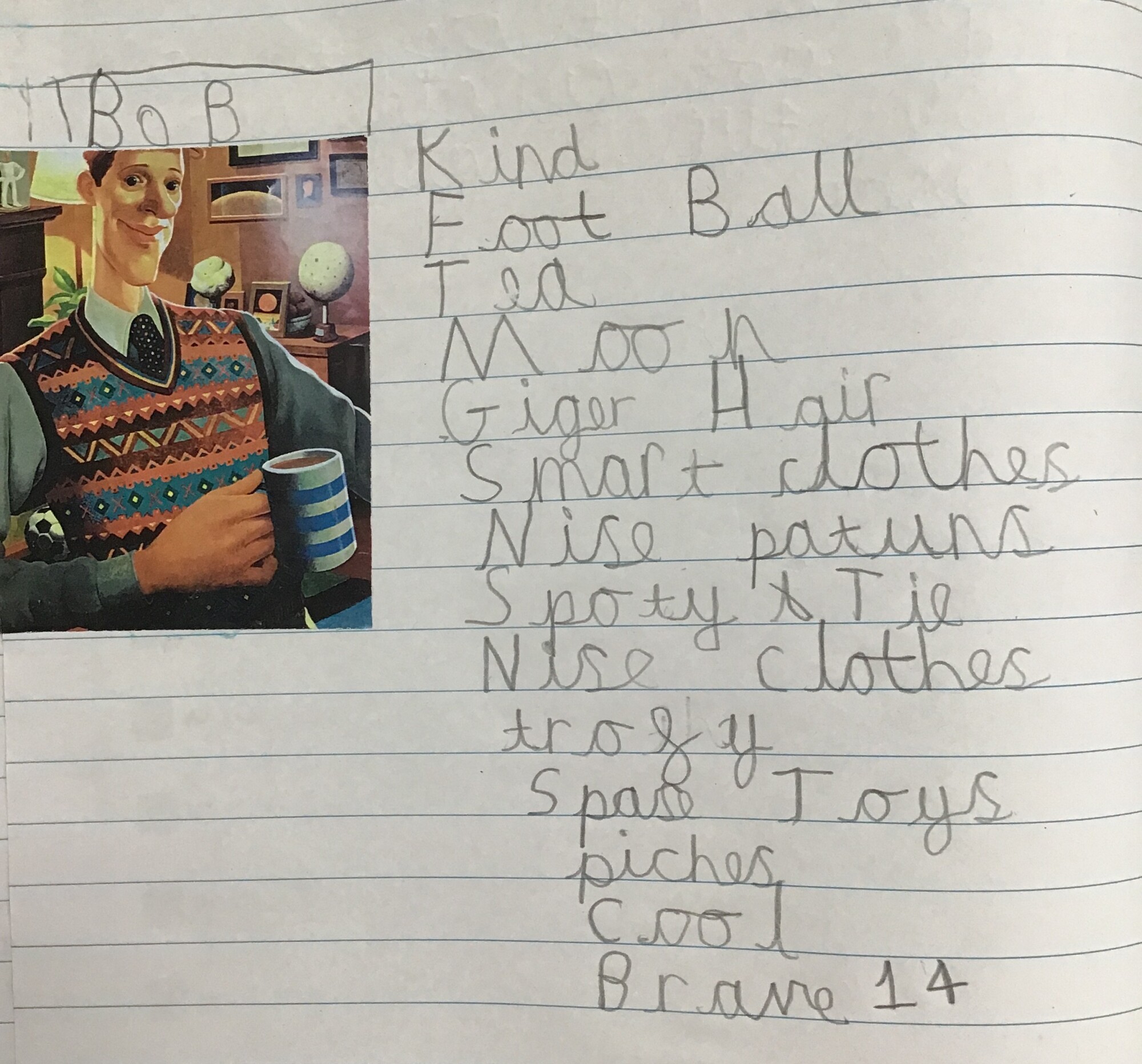 After learning a little bit about Bob from the first few pages of the book and discussing how much we could in fact learn from this one picture of Bob, Kingfishers created their own word bank all about Bob! This will then help us to write our character descriptions next week....