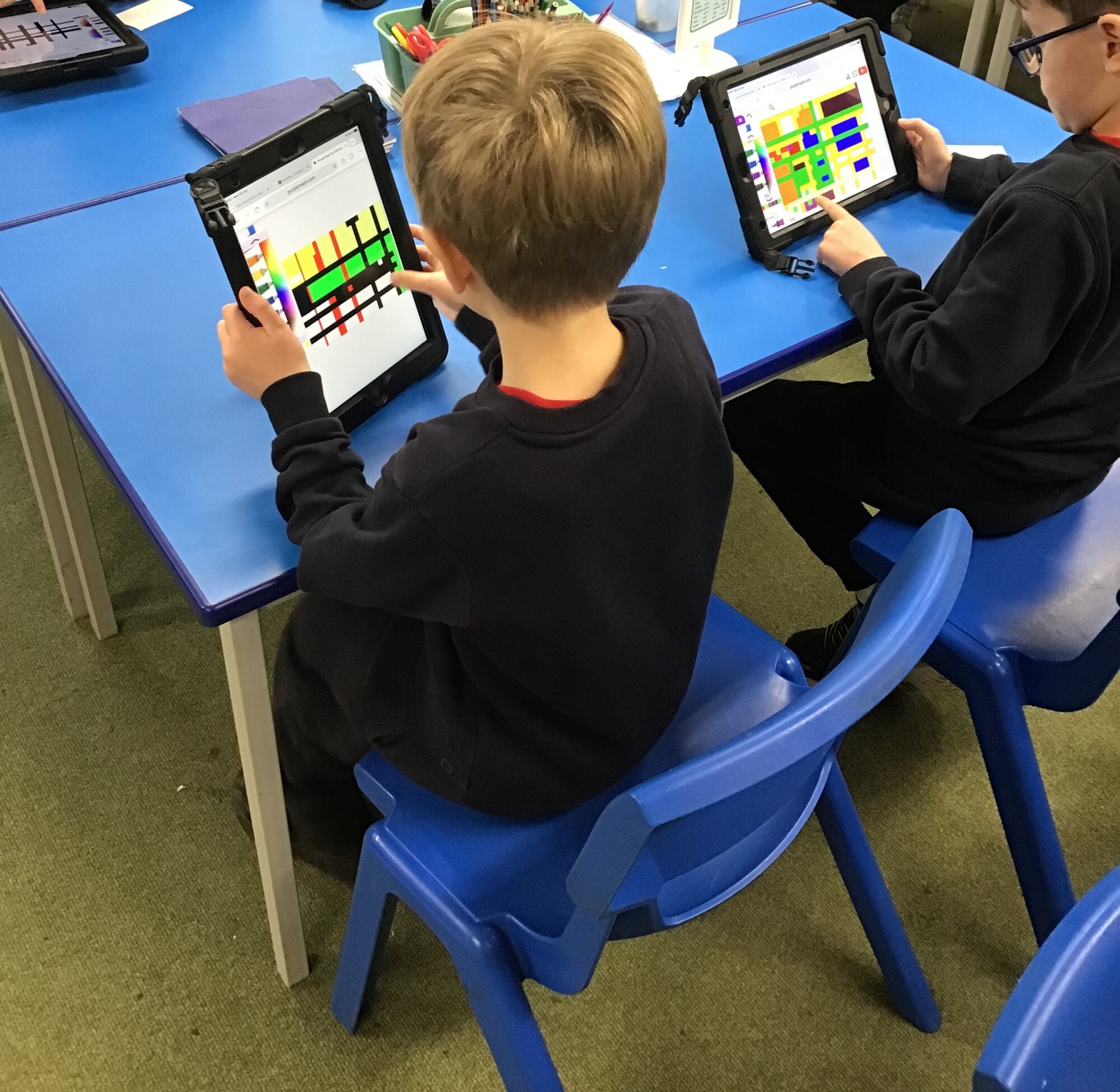In computing Year 1 and Year 2 have continued to think about digital art. This week the children were able to create pieces of art by drawing lines and blocks of colour. Their digital paintings were in the style of Piet Mondrian.