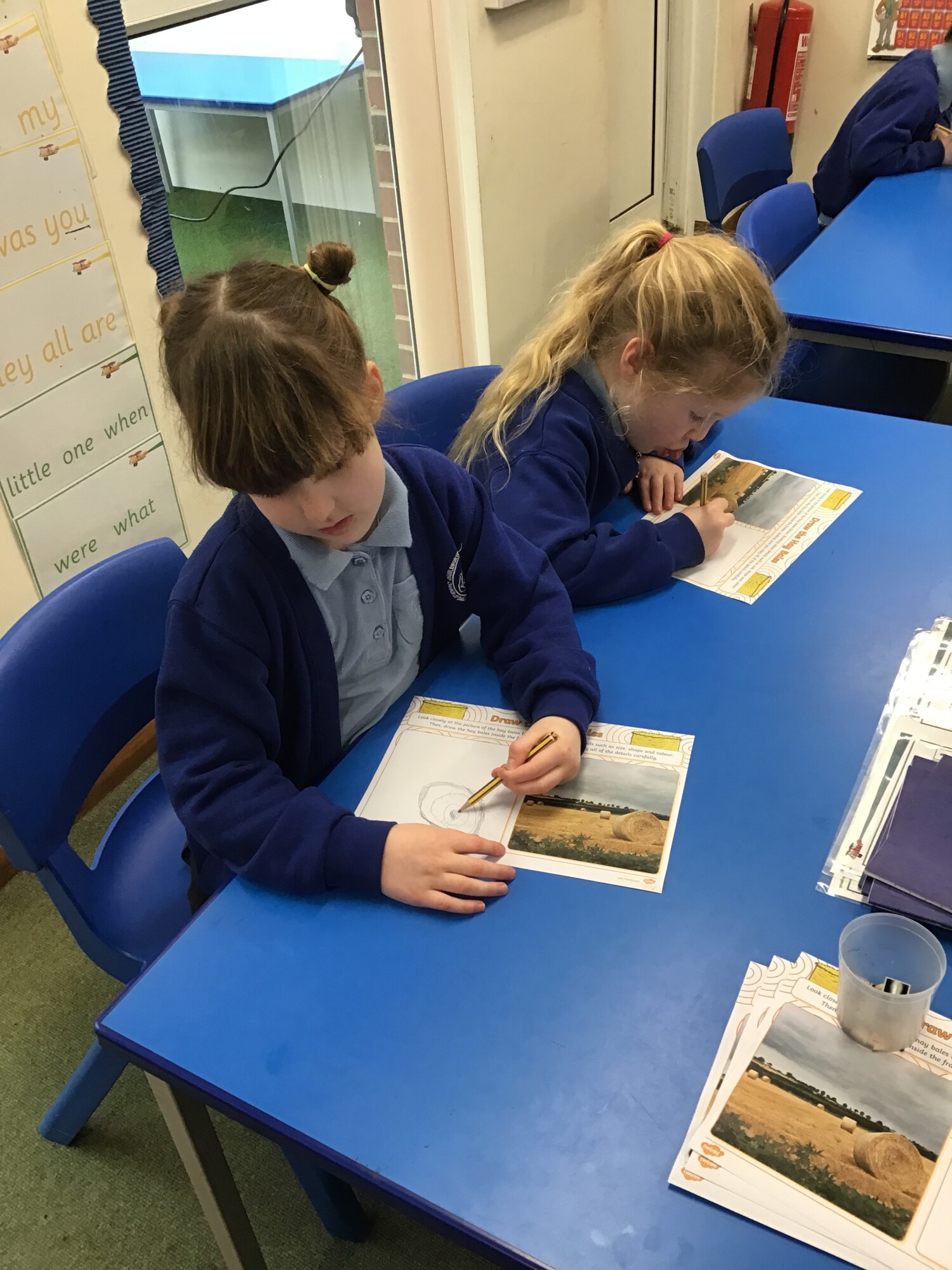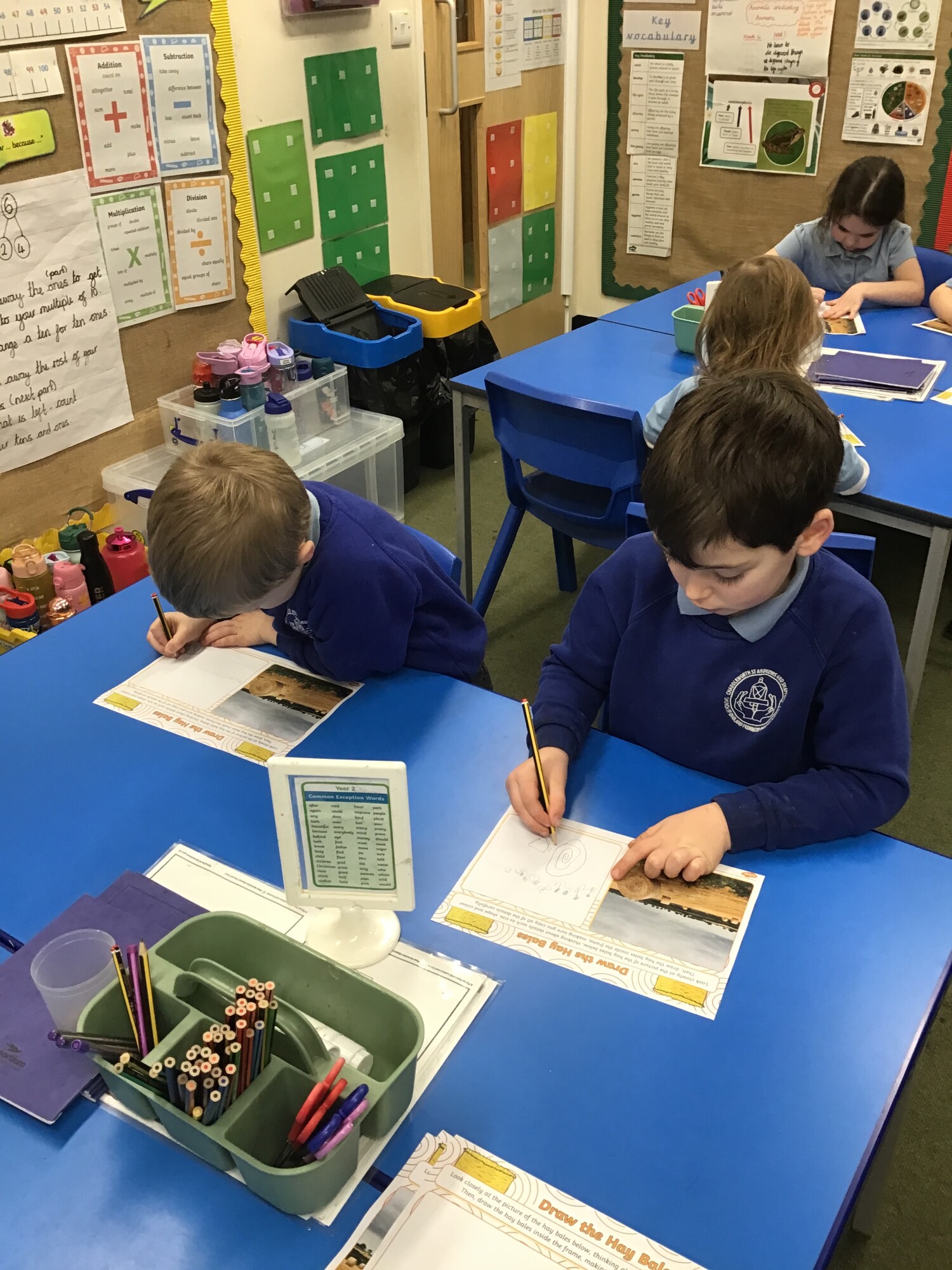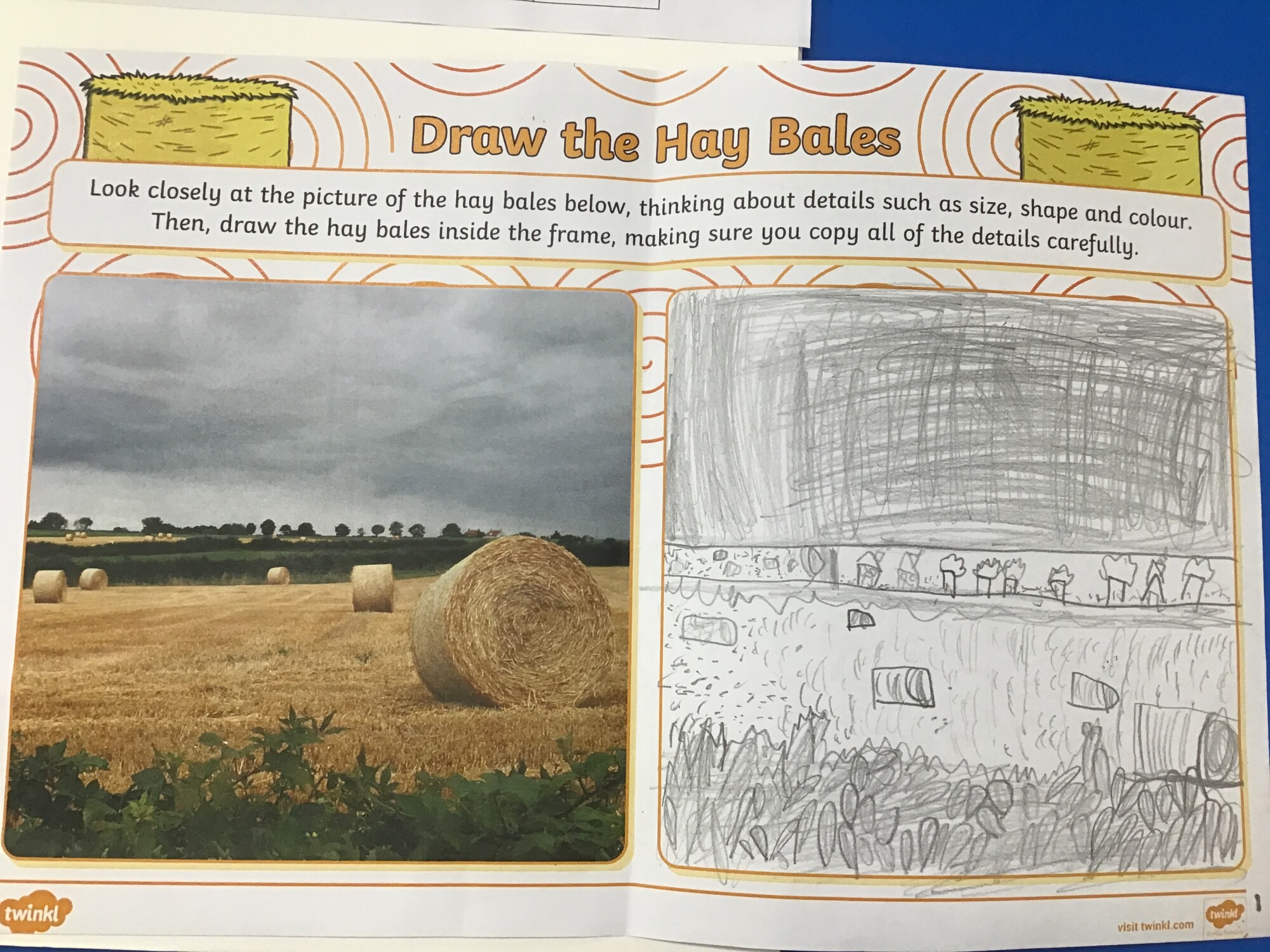 In art, Year 1 and Year 2 continued to develop their skills of showing light and dark colours and textures in their drawings. This week they were introduced to the concept of "perspective". They learnt that objects at the "front" of the picture are bigger than those at the "back" of the picture. The children were also introduced to our focus artist for the term, John Constable. He enjoyed painting landscape pictures of the countryside. To link in with this, the children had a go at copying a picture of a field with hay bales. They worked hard to show perspective in their drawings.