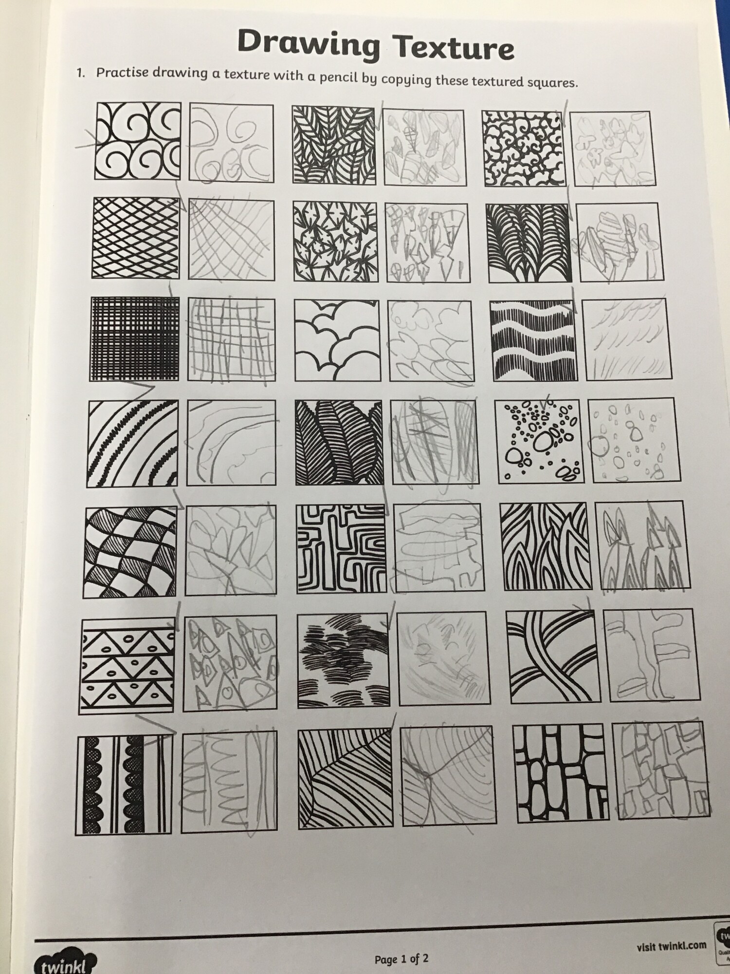 First of all we went outside and did some wax rubbings of different textures. The children did rubbings of wood, bricks, tyres etc. We then talked about how you would draw this texture. The children then had a go at copying some other textures to give them some ideas of how they can create "texture" in their own drawings.