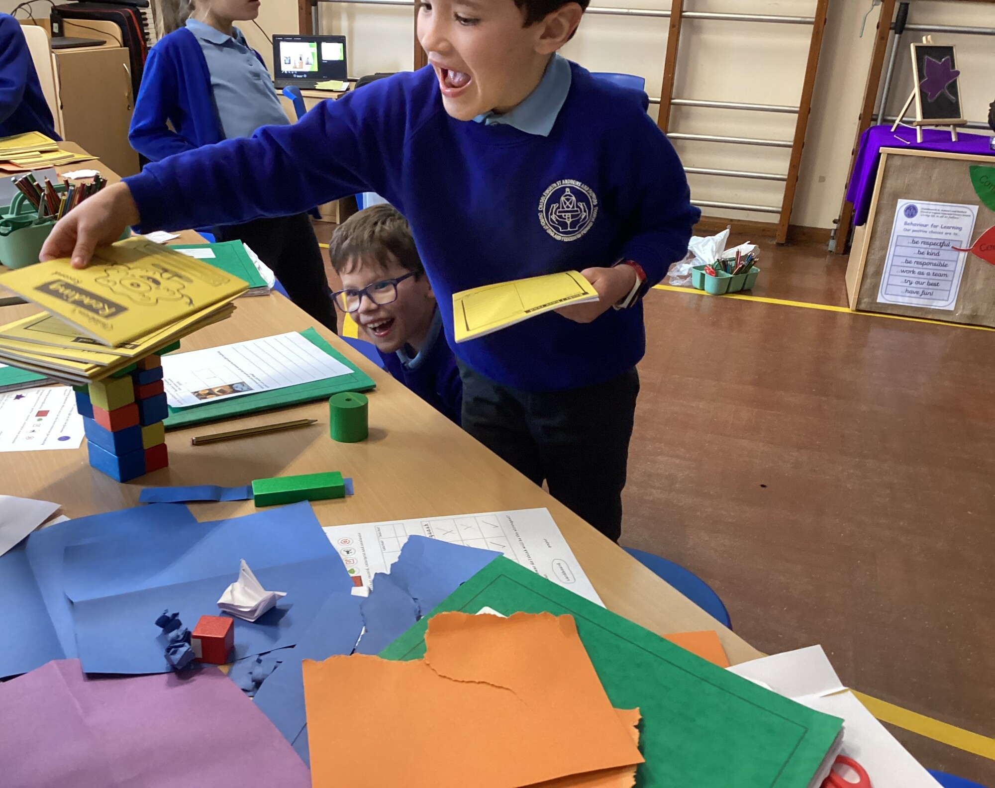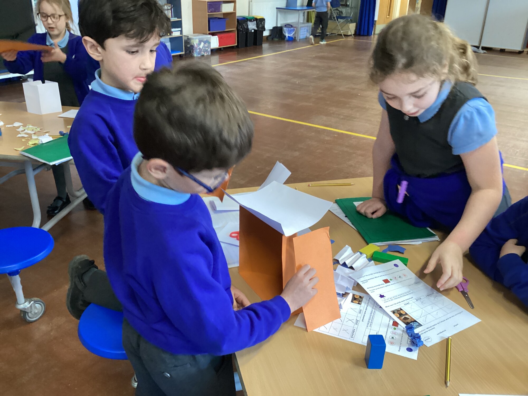 In science Year 1 and Year 2 investigated materials for making their car in design and technology. They had a go at folding, tearing and squashing different materials. They then had to see how strong different materials were. Although wood was the strongest, it would not be squashed, torn or folded. The cardboard worked out to be the best material. It was stronger than paper and it could be folded, torn or squashed.