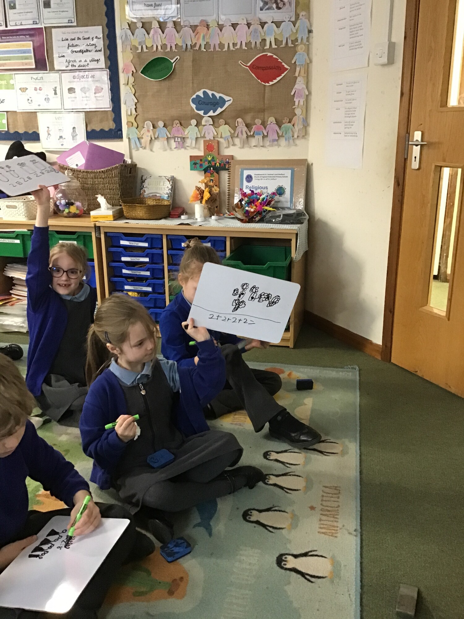 In maths, Year 2 have been learning about repeating addition and linking it with the multiplication sign. They created equal groups with equal amount of objects in each group. They could then write a repeating addition such as 5 + 5 + 5 = 15 and then link this to writing 3 x 5 = 15.