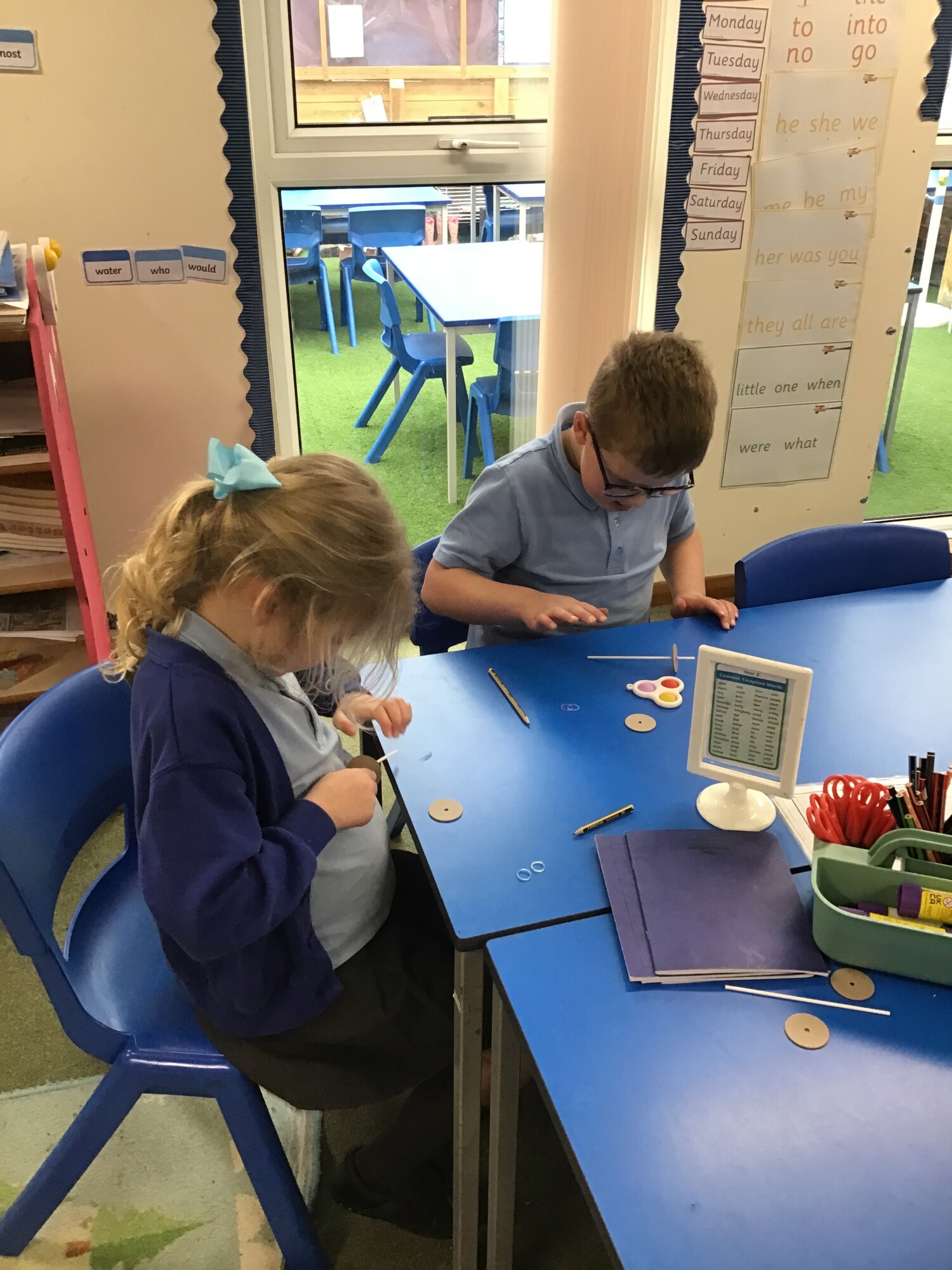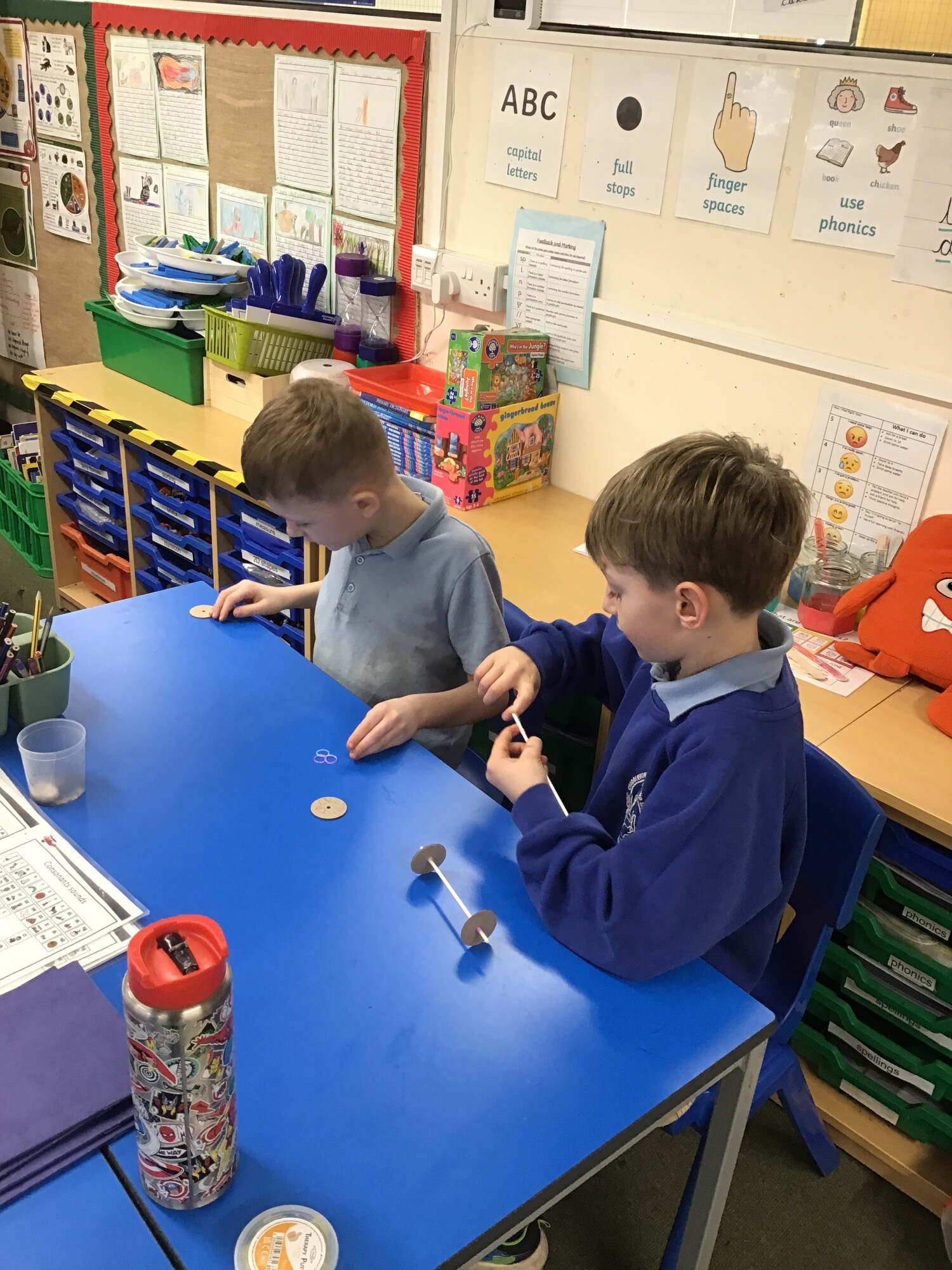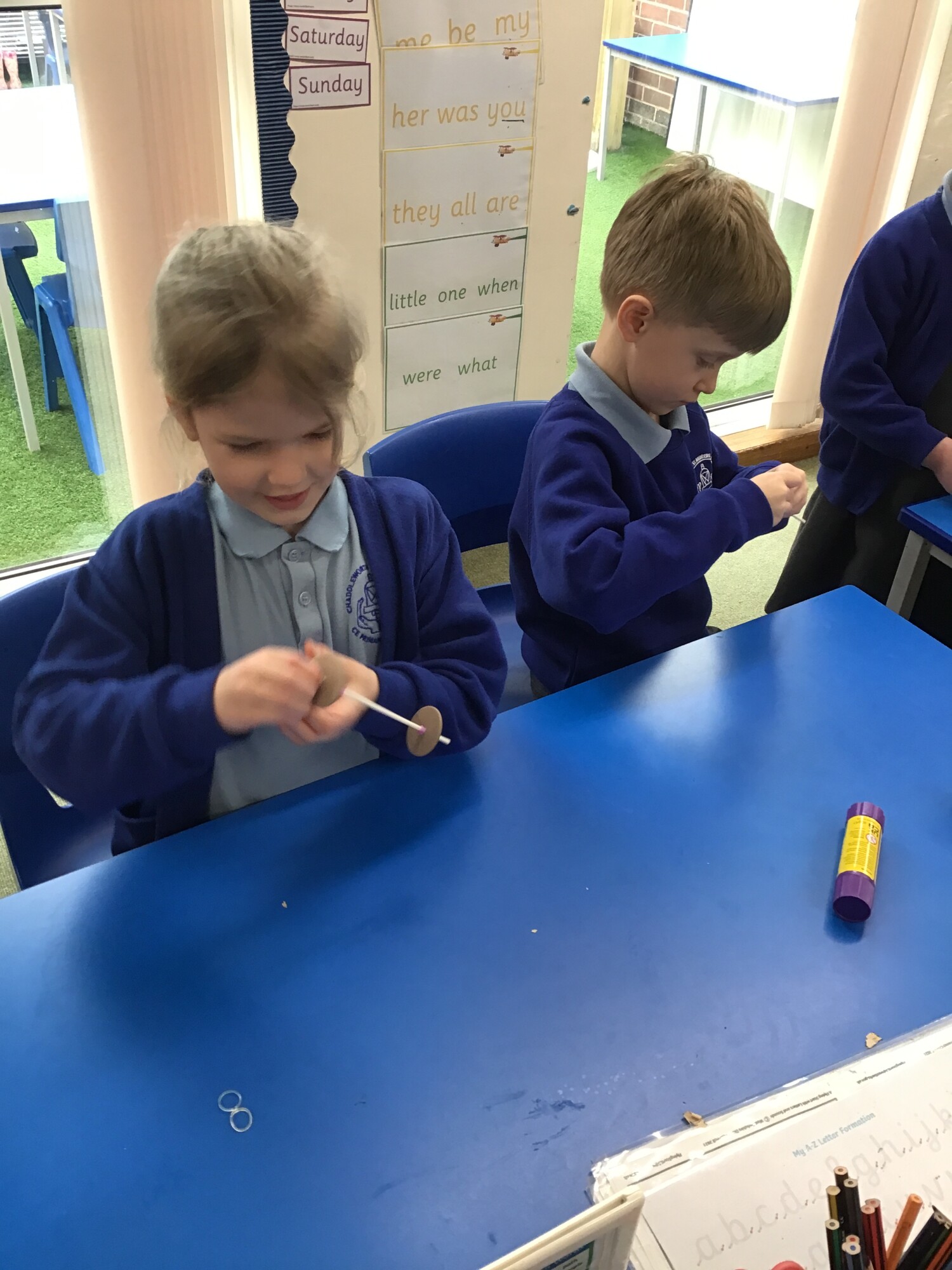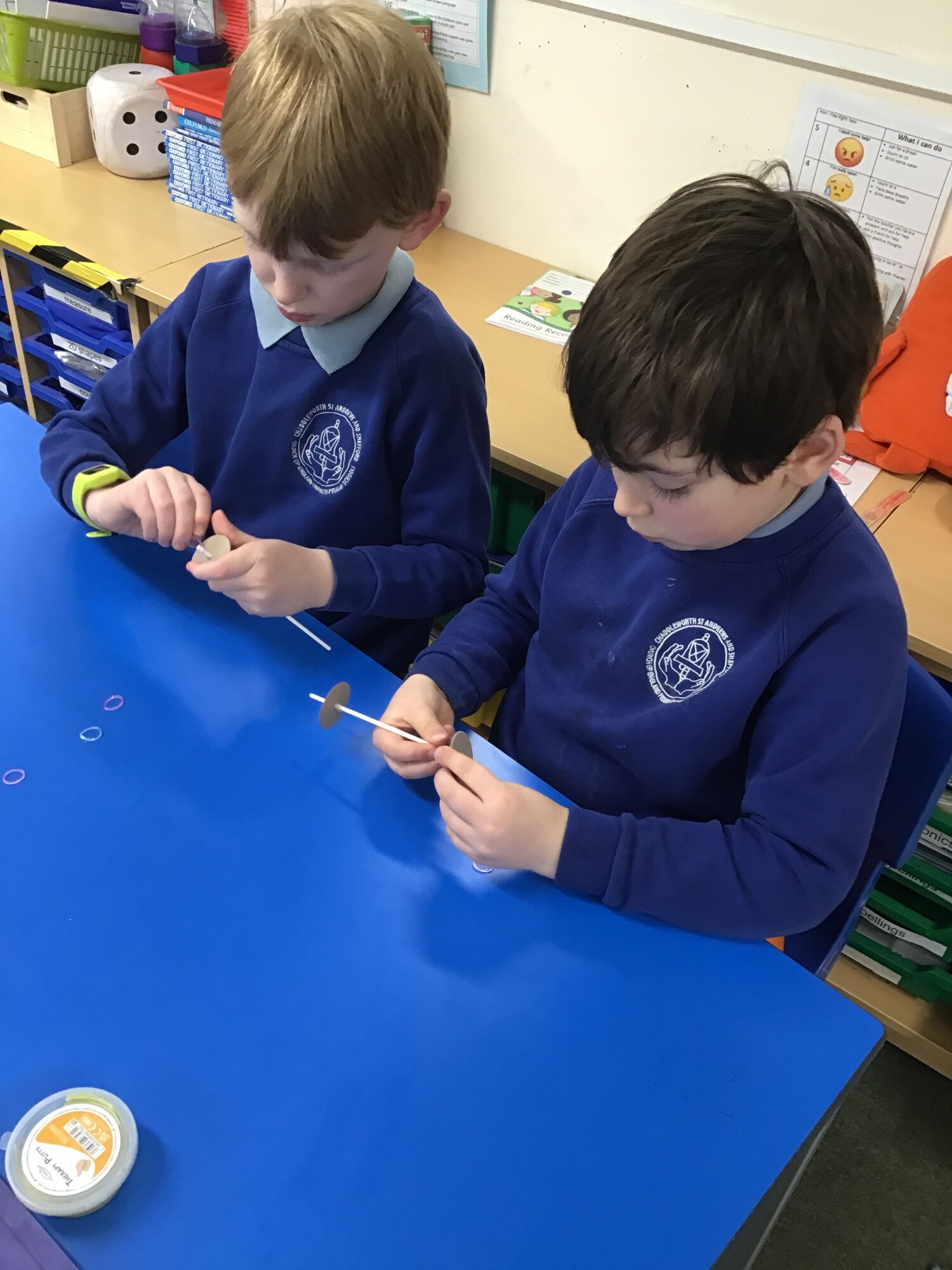 In design and technology Year 1 and Year 2 had had a go at finding out about wheels and axles in preparation for making their cars. The children then had a go at making an axle with wheels on it. They then had a go seeing if their axle with wheels worked. What happened to the wheels? They went round at the same speed and in the same direction.