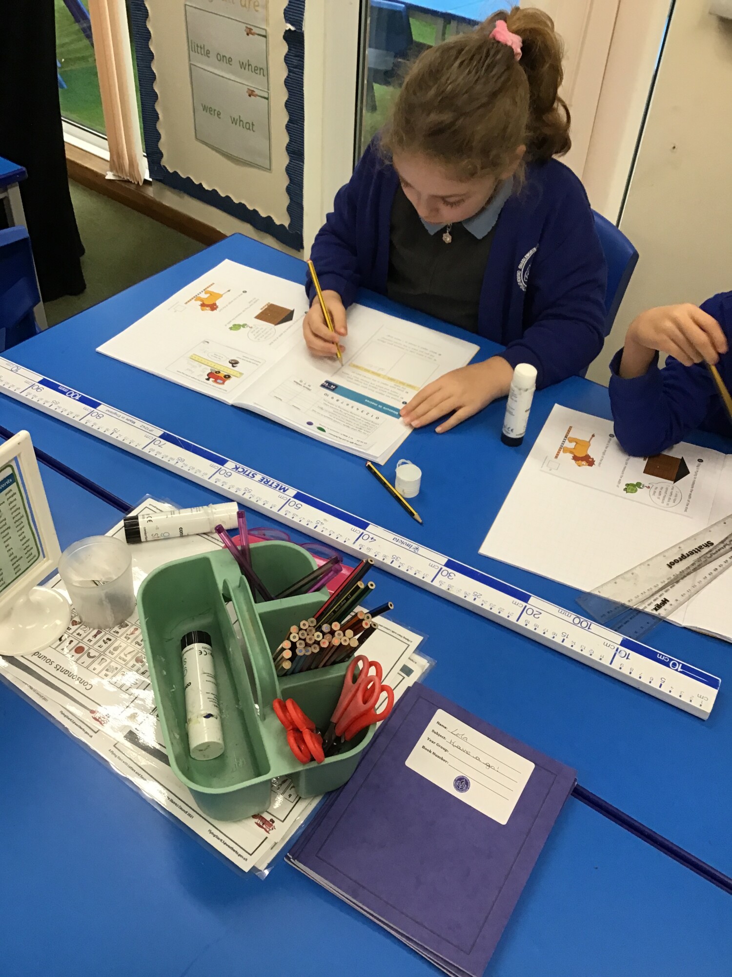 They were able to use the meter sticks to check their estimations and even began to count the height or width of an object in meters, including the classroom, which we worked out was 7 meters wide!