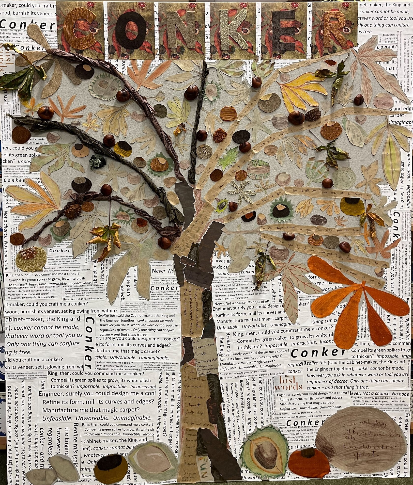 Over the past couple of weeks, Red kites have been hard at work putting together a seasonal collage to enter into a competition at Saturday's ploughing match. The theme of our collaborative piece is "Conker", inspired by the Robert McFarland poem and the accompanying illustration by Jackie Morris in the book The Lost Words.