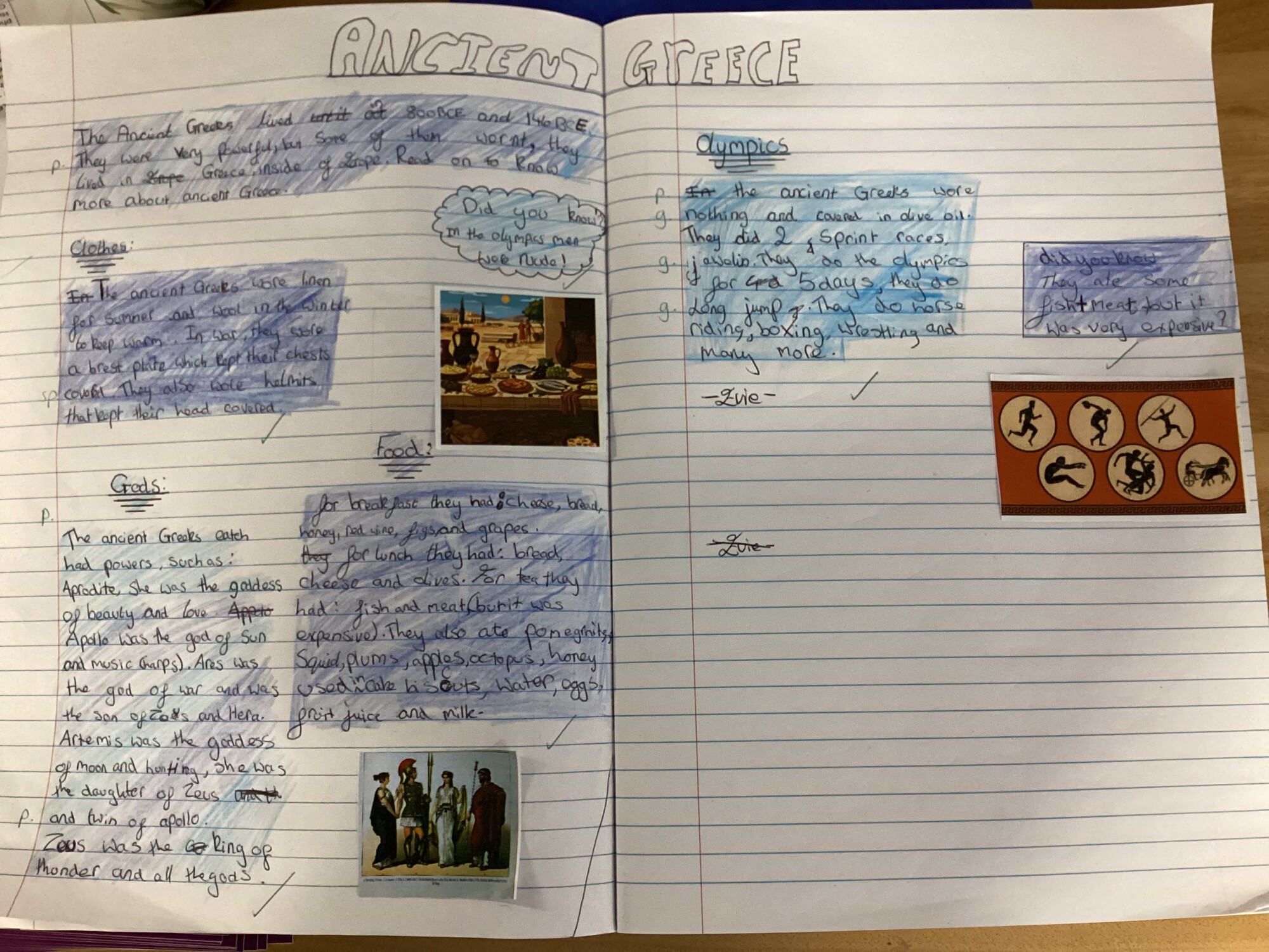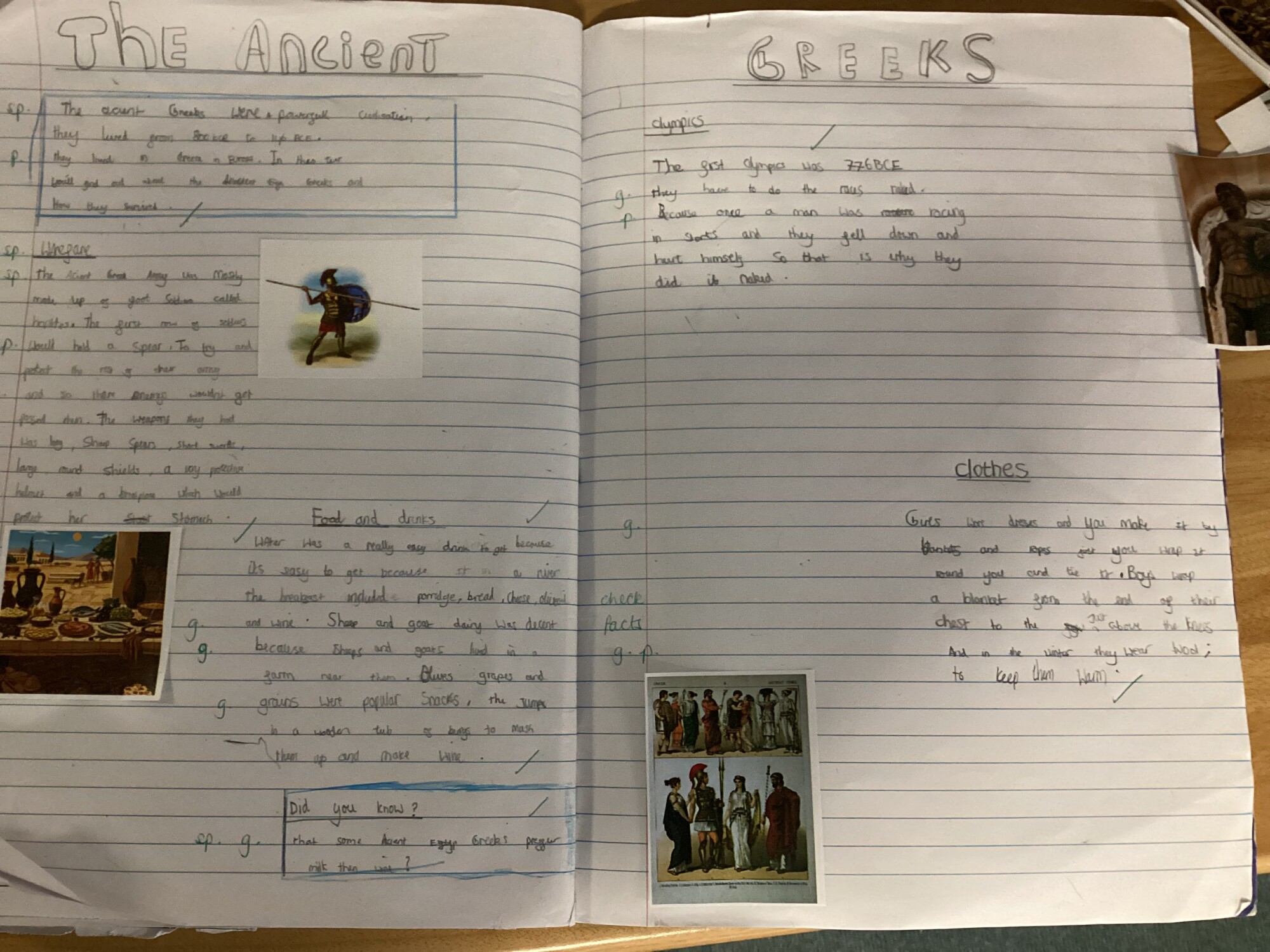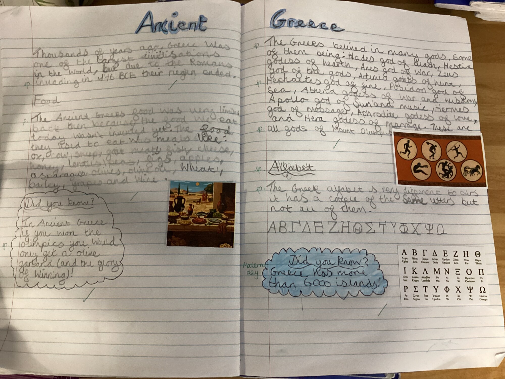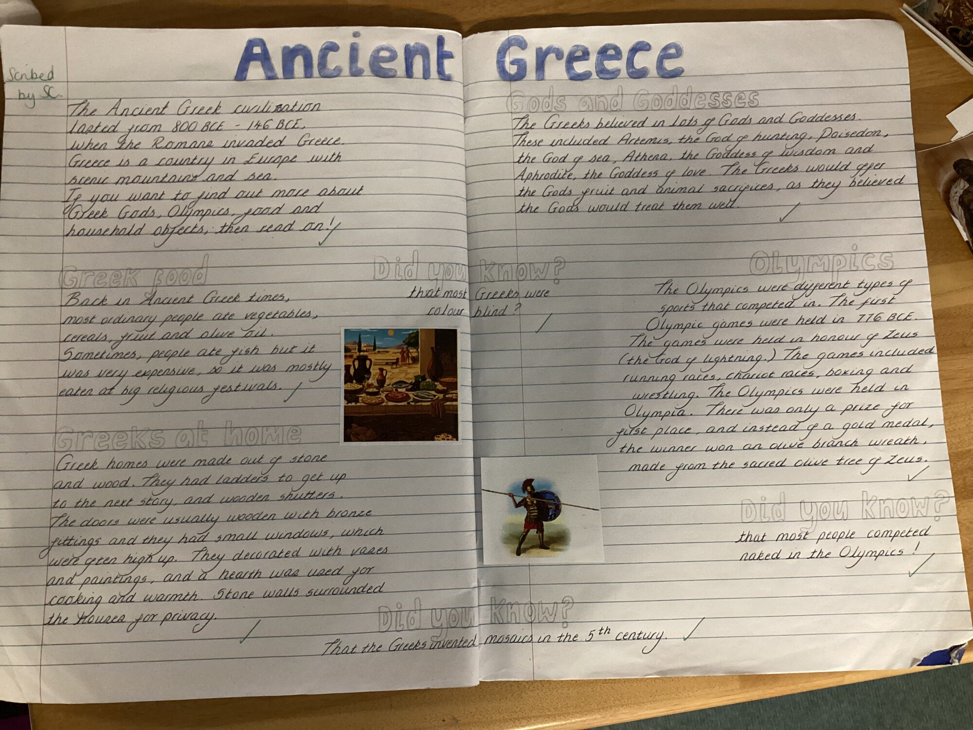 In English this week, we planned our own setting descriptions and then wrote them. We tried really hard to include senses descriptions, figurative language and adverbials. Our use of punctuation is definitely improving and the children are putting in a lot of effort. Once we had finished our setting descriptions, we moved our attention to writing our double page spread about the Ancient Greeks. We focused on research for a couple of lessons and how to take useful, efficient notes. Then we created informative, well-presented non-chronological reports. Next week, we will be working on creating an exciting plot for a narrative based on Malamander by Thomas Taylor.