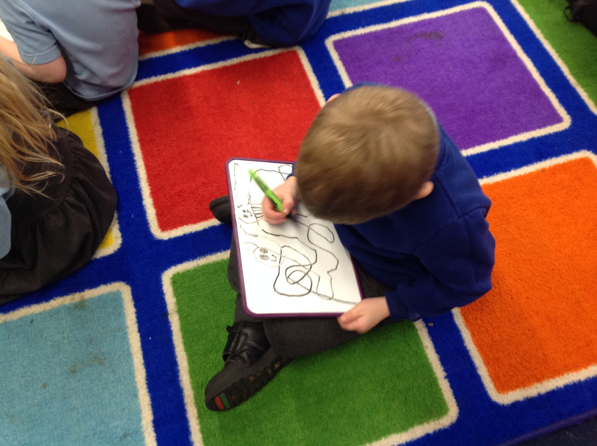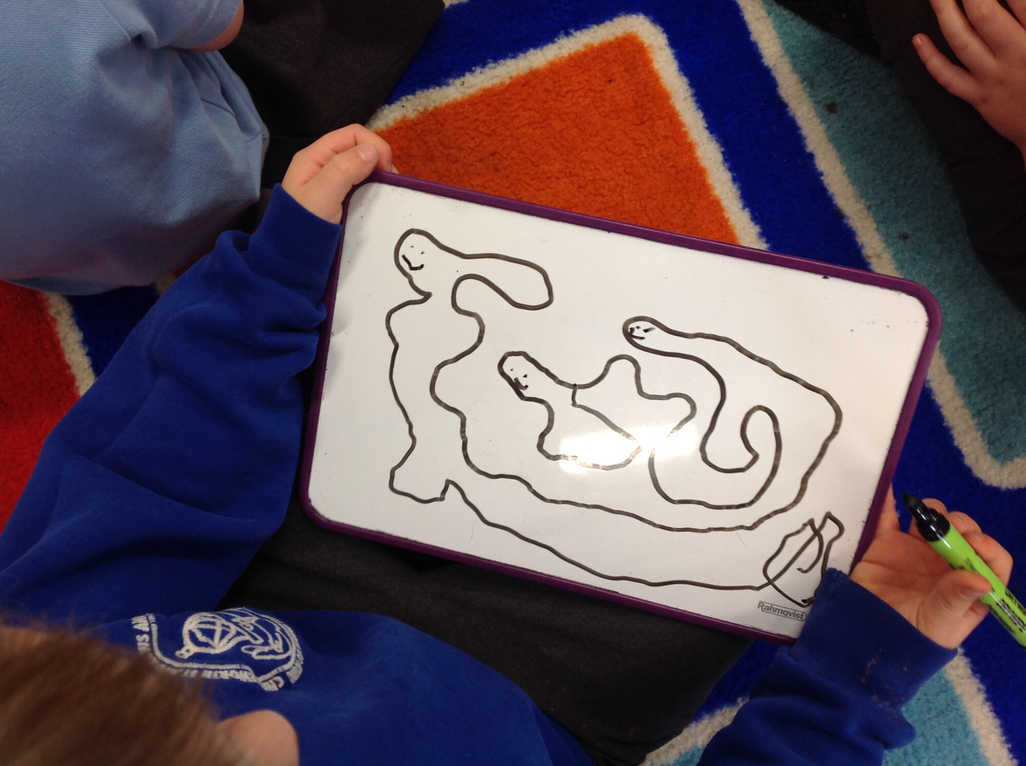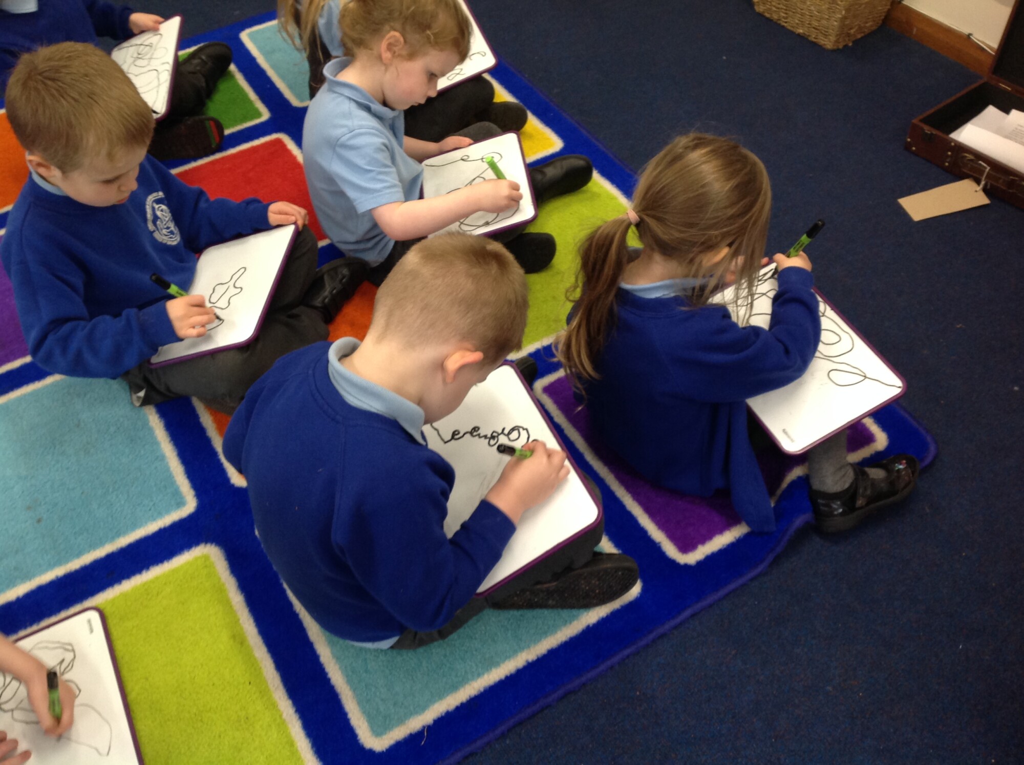 Our morning activity this term is drawing and already, just within the four days we had this week, we were seeing far more control when using the pencil to mark make, we also found that we were giving fewer reminders for using the correct pencil grip. Last term we focussed heavily on developing our fine motor control, manipulating small objects using the pincer grip in readiness for mark making this term. We also follow a programme called 'Write Dance' which is pretty much what it says on the tin, mark making (writing) to music. This term we are following the Krongelidong (I have no idea about the names). Last term we were performing The Volcano, this term we learnt that the volcano erupted and destroyed the village of the Write Dance people and so they have had to spend many days walking through fields and forest, along paths that twist and loop in order to find a new location to set up their new village and yet on their journey they have a funny feeling that somebody or something is 'watching' them. And they are right, lots of friendly little animals have been following them on their journey. Take a look at the pictures below - can you make out the journey and the animals.