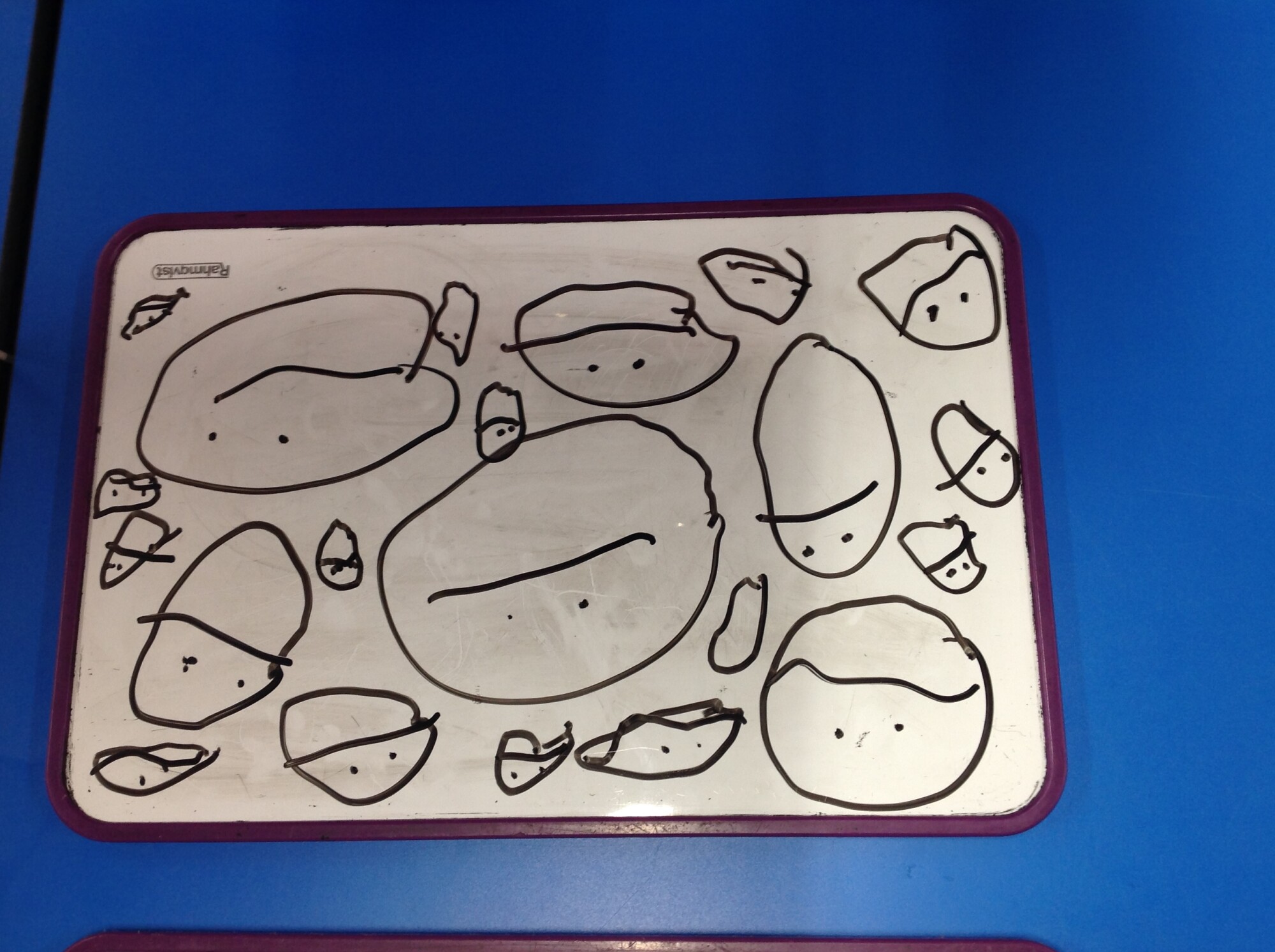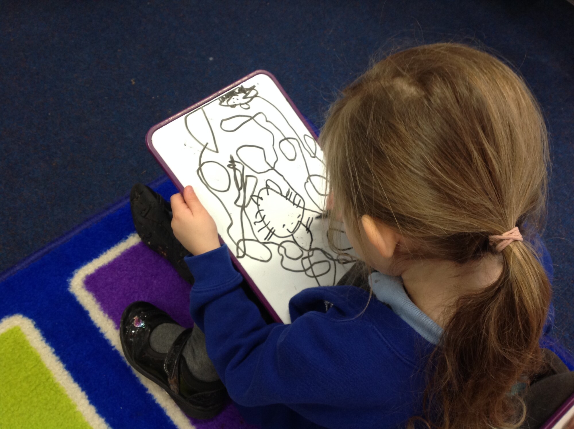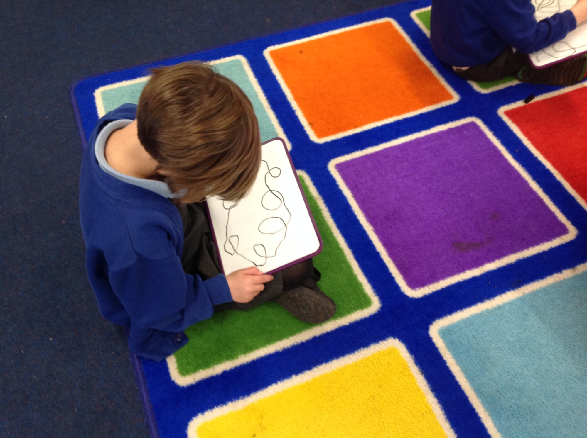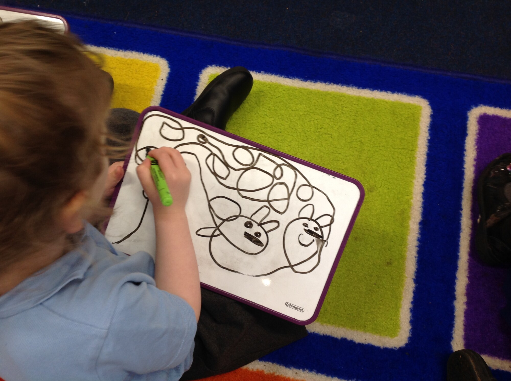 Our morning activity this term is drawing and already, just within the four days we had this week, we were seeing far more control when using the pencil to mark make, we also found that we were giving fewer reminders for using the correct pencil grip. Last term we focussed heavily on developing our fine motor control, manipulating small objects using the pincer grip in readiness for mark making this term. We also follow a programme called 'Write Dance' which is pretty much what it says on the tin, mark making (writing) to music. This term we are following the Krongelidong (I have no idea about the names). Last term we were performing The Volcano, this term we learnt that the volcano erupted and destroyed the village of the Write Dance people and so they have had to spend many days walking through fields and forest, along paths that twist and loop in order to find a new location to set up their new village and yet on their journey they have a funny feeling that somebody or something is 'watching' them. And they are right, lots of friendly little animals have been following them on their journey. Take a look at the pictures below - can you make out the journey and the animals.