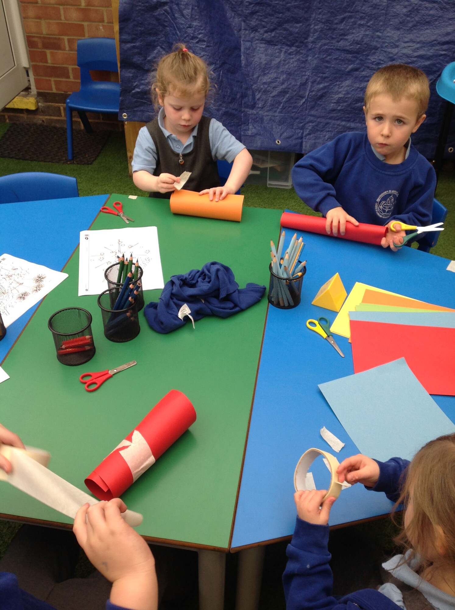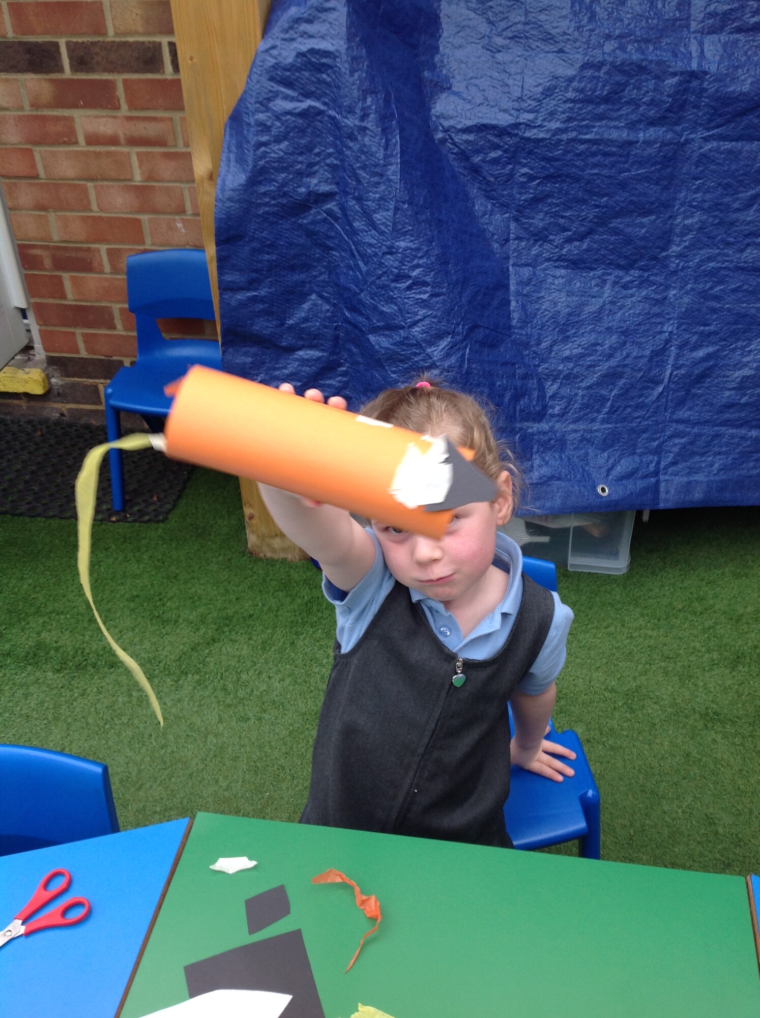 In Art this week, the children applied skills that they had previously learnt when they made binoculars. They were very good at remembering that masking tape works better than glue when making a cylinder shape. They also remembered how to draw around a template to get a shape they needed (the triangle for the top of their rocket) and then cut it out. We also talked about glue being used to stick the triangle on the rocket as the triangle was flat. Some children chose to use glue and others chose to use the masking tape again. Finally, they added some flames by using the masking tape again. The children also had the opportunity to paint. Some chose to paint Bonfire Night pictures.