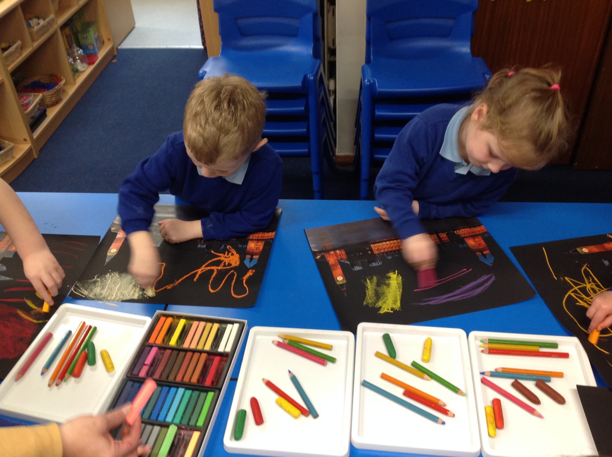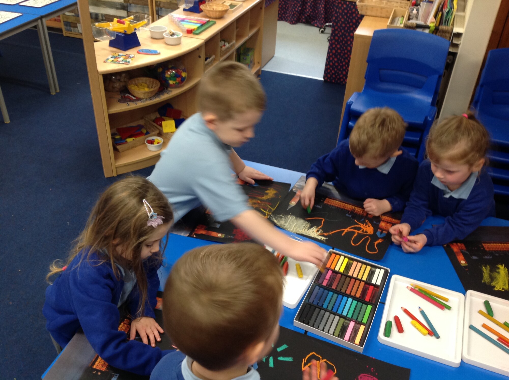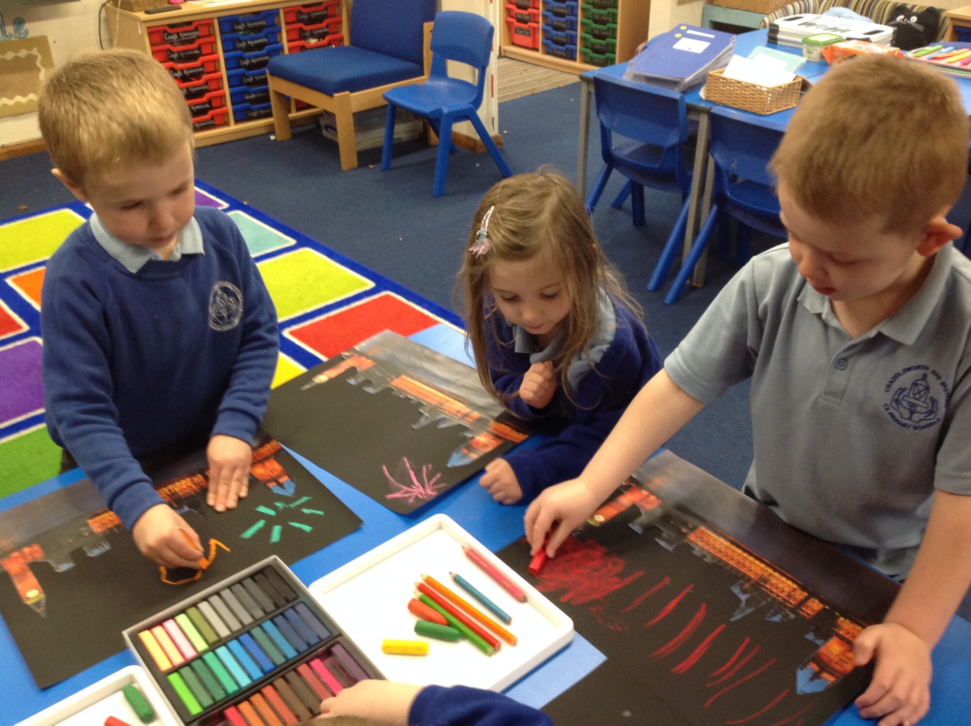 We also used different media when creating our firework pictures such as chalk, pastels and crayons. First, we listened to the story of Guy Fawkes in order to understand why we celebrate with fireworks on November 5th. Next, we discussed famous landmarks in London that are still there today but could easily have been destroyed by Guy Fawkes if the plot had been successful. Robins were fantastic at remembering vocabulary such as Houses of Parliament, River Thames, King James 1st, London.