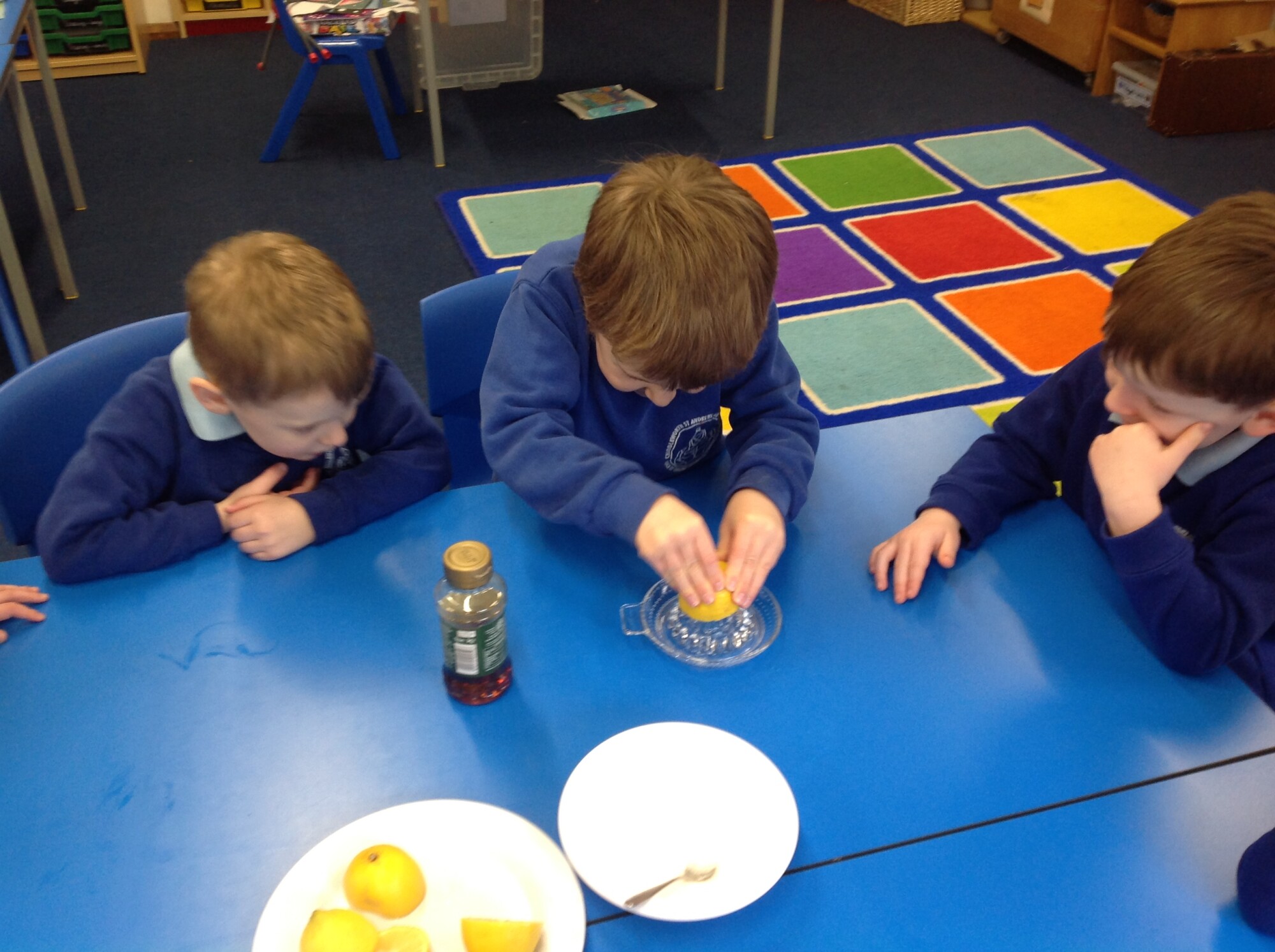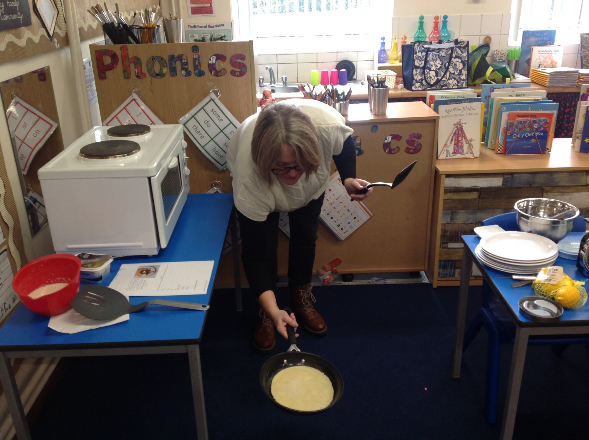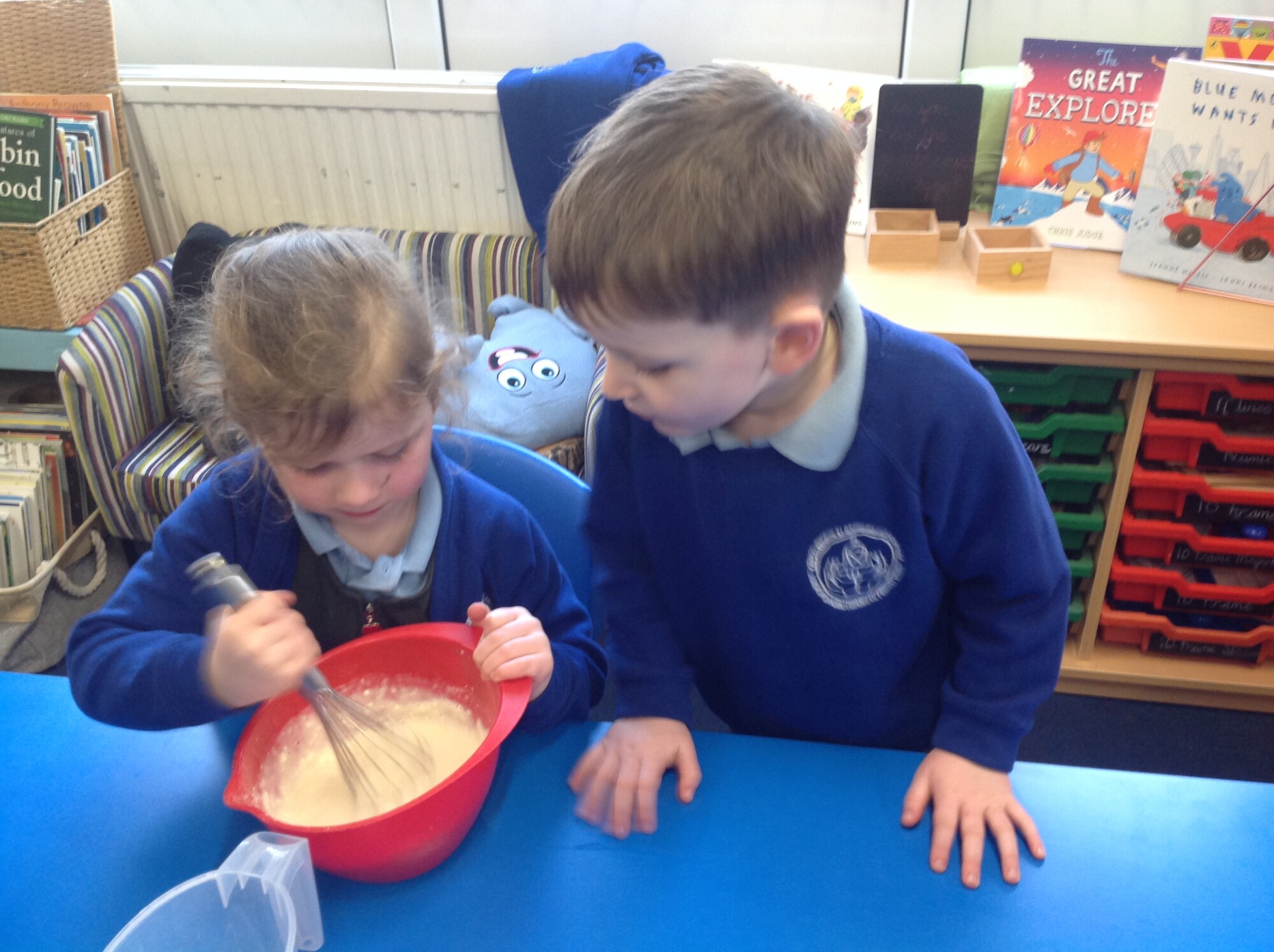 Wednesday, Rev. Mike led our worship and this week he talked about the significance of Shrove Tuesday, also known as Pancake Day, the day before the Christian period of Lent begins, a time to feast and use up foods such as eggs, sugar and milk, a time of fasting leading up to Easter. This year, Shrove Tuesday will take place in the half term holidays so we decided to use our Wednesday afternoon to make our own pancakes in class. Again, we introduced the children to the vocabulary of whisk (they were close, calling it a mixer, a stirrer, and whisker), we introduced the vocabulary of weighing scales (a measurer, a clock, a weigher). We talked about the ingredients and the toppings, using a juicer to juice the lemons and off we went - mixing and measuring - Mrs Langford cooked the pancakes and we ate them....even Mrs Bell popped in, following the delicious smell down the corridor!