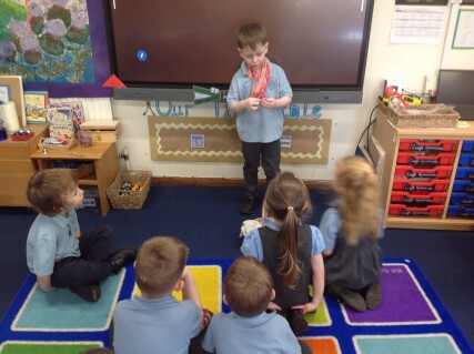 On Monday, we had our first Show and Tell and what a start we got off too. One of our Robins brought in his swimming medals. Not only did we get to hold the medals we had the opportunity to ask lots of questions too. We also watched a short video clip - our Robin jumped into the water - one minute he was there, the next he was gone, yes he was right under the water. Safe to say he bounced back up again. We watched it over and over again and each time there was a question - did you have your eyes open, what stage are you in, what is your swimming teacher called, did you have to hold your breath? Our Robin spoke clearly and with confidence - a great start. We really love Show and Tell.
