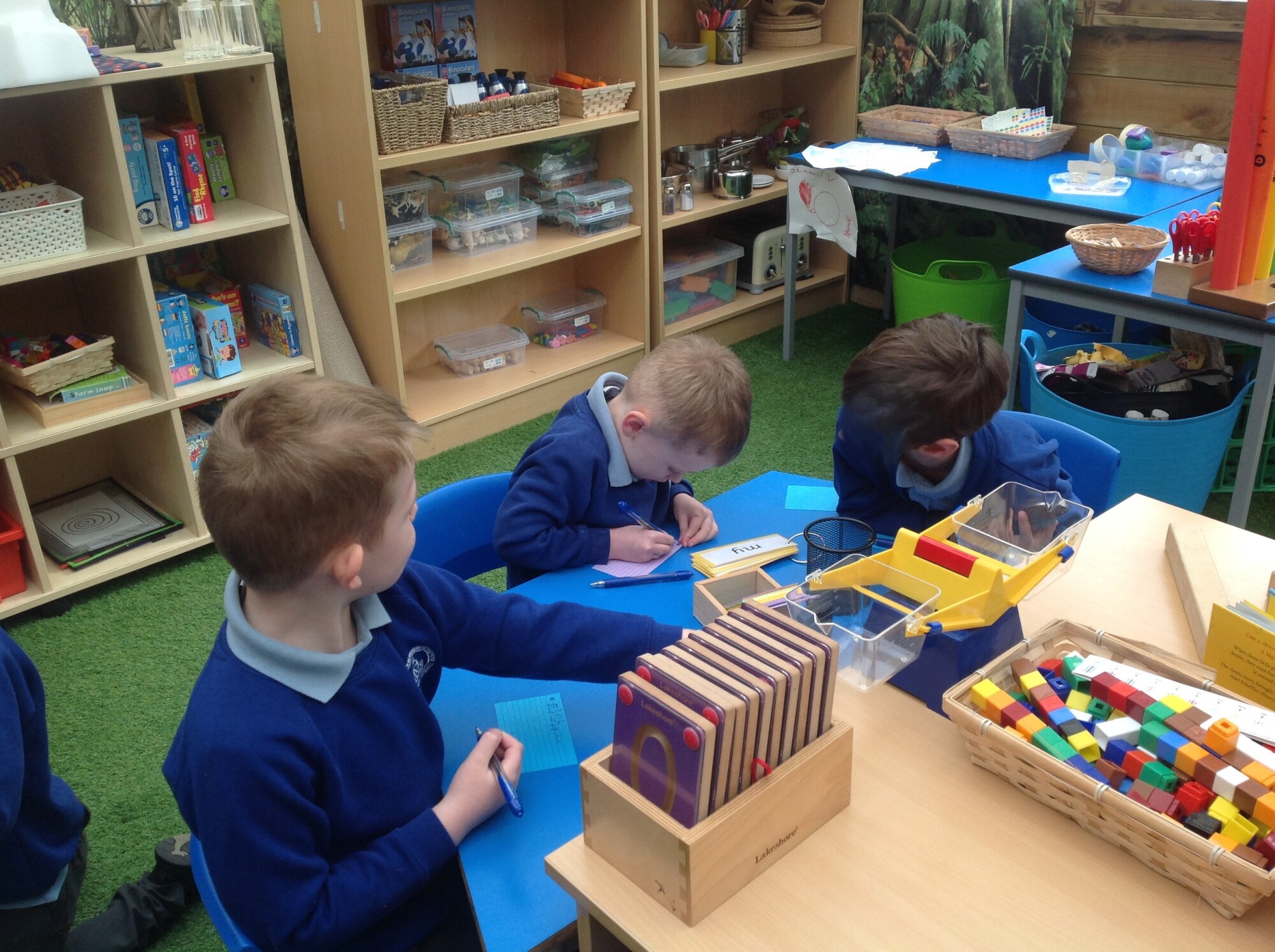 We started off writing shopping lists and then moved on to 'the school office' - just something as simple as a telephone and some pieces of paper and they were off! The phone was ringing non stop and the messages were coming in thick and fast - and they were all being written down (such a great way to get the children writing). The 'telephone conversations' were hilarious - children were being recorded as being 'poorly' (mainly chicken pox from what I could overhear) and were offered advice such as keeping the children as clean and germ free as possible - only washing the children in hair conditioner and keeping them off school for 6 months! What pleased me the most though, was the vocabulary, the sentence structure, the sharing and turn taking of the phone and just the pure enjoyment and engagement of all the children.