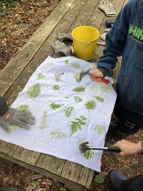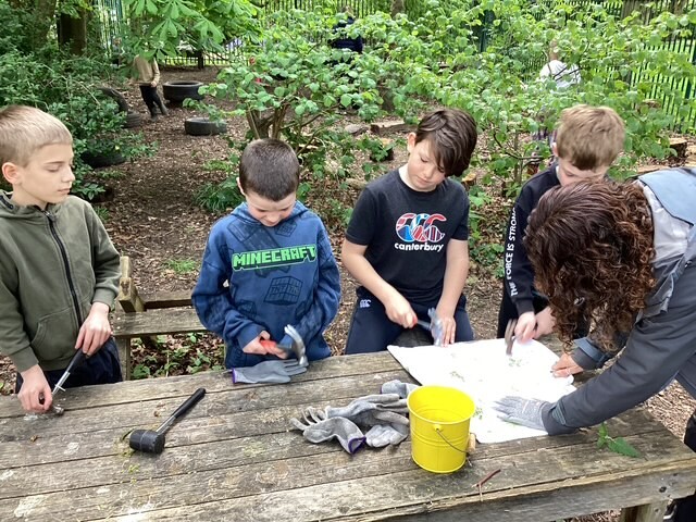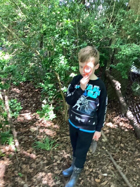 The children made the most of every part of the environment. They were busy insect spotting and using magnifying glasses to look closely at what they could find. Some explored fungi using identification guides, while others collected leaves and created their own leaf prints using hammers, showing real care and focus in their work.