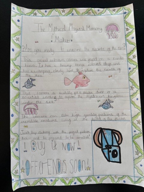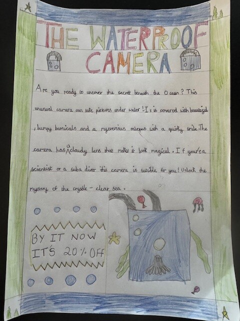 We focused on using product description to help persuade the reader. The children thought carefully about how to describe the camera in a way that would make someone want to buy it, using ideas like mystery, adventure and discovery beneath the sea.