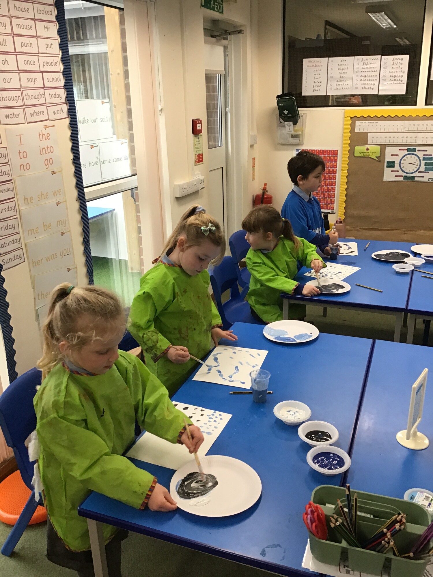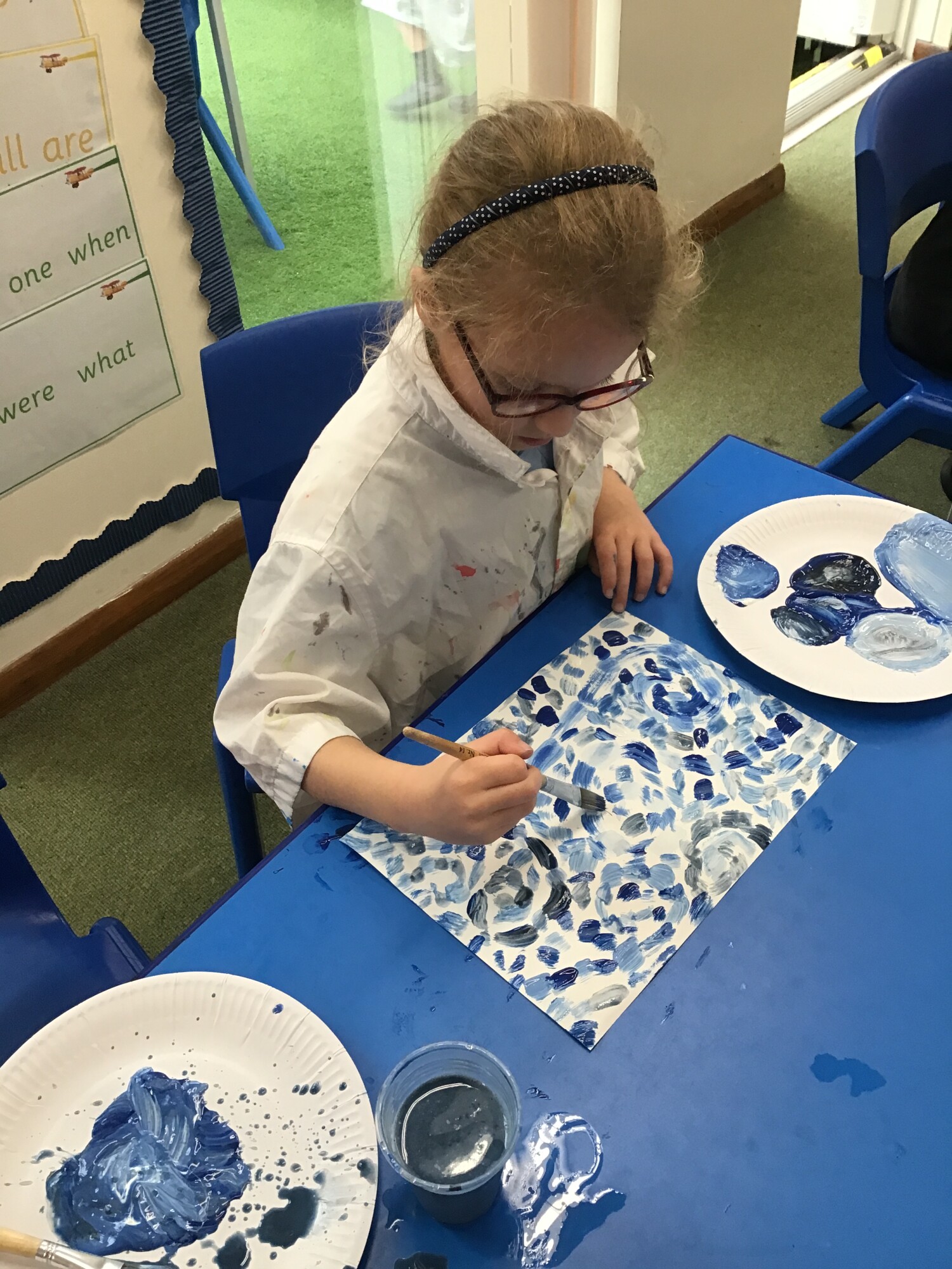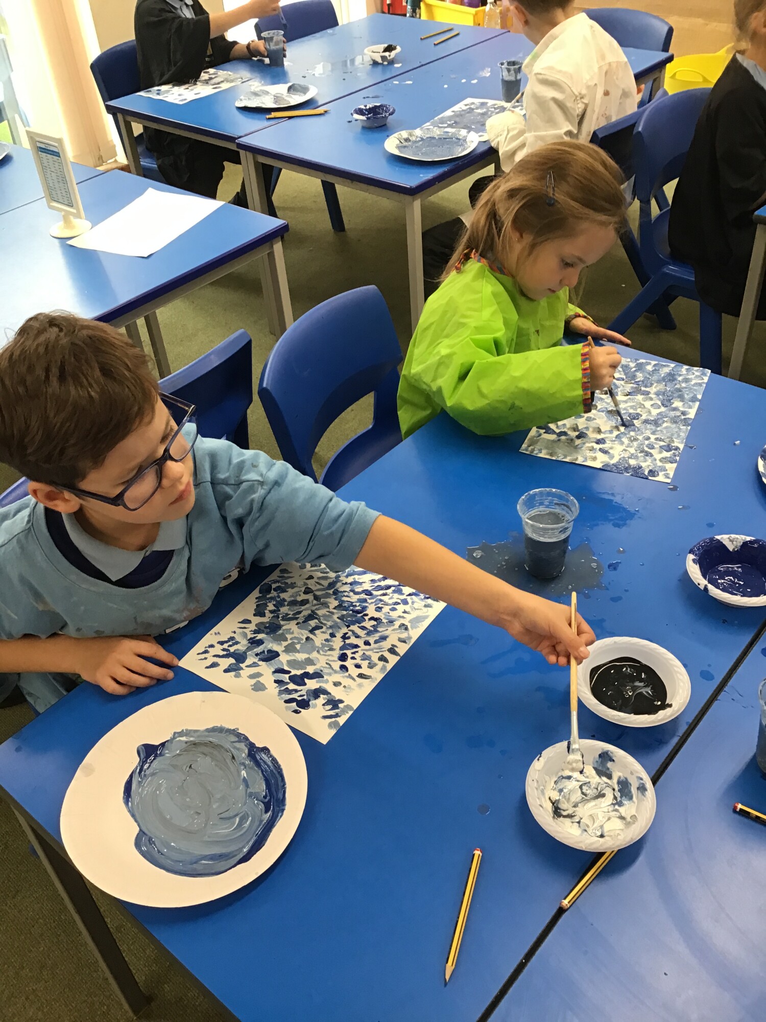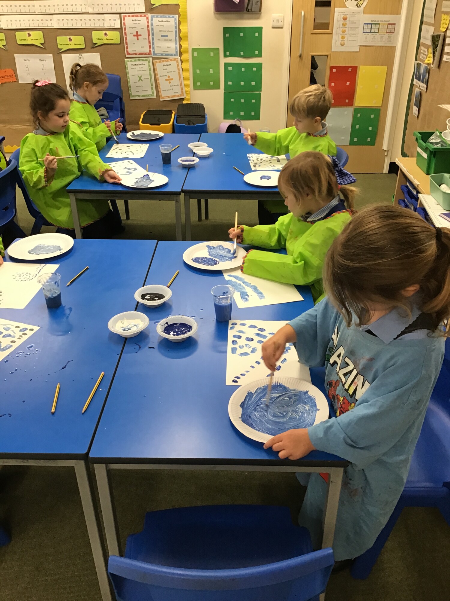 In art, the children have put all their skills that they have learnt over the past few weeks to the test. They have painted the background for their own "Starry Night" painting in the style of Vincent Van Gogh. They mixed lots of shades of blue and used short brush strokes. Some children even tried to create swirl effects with their brush strokes just like in the original painting "The Starry Night". We think there could well be some future artists amongst the children.