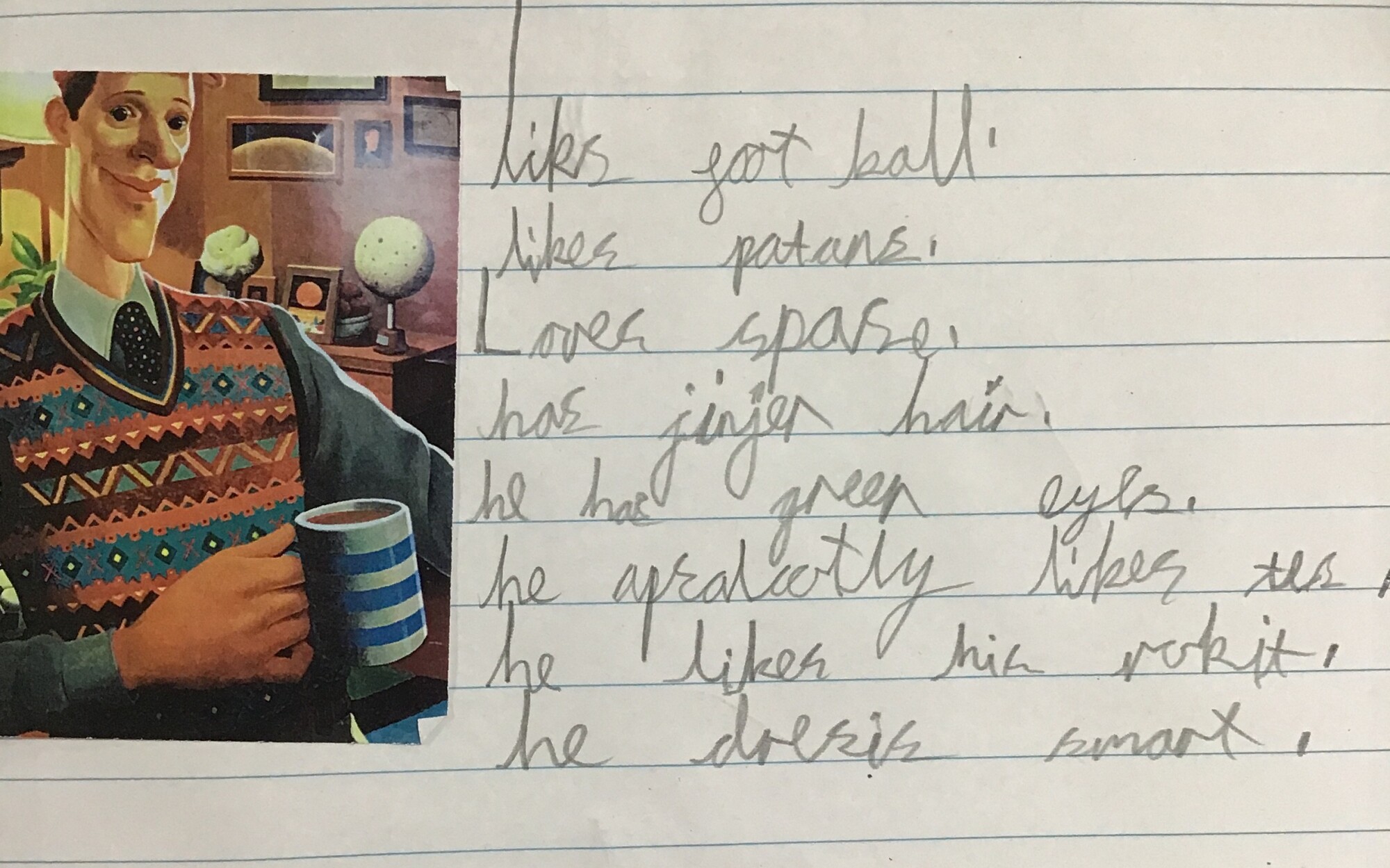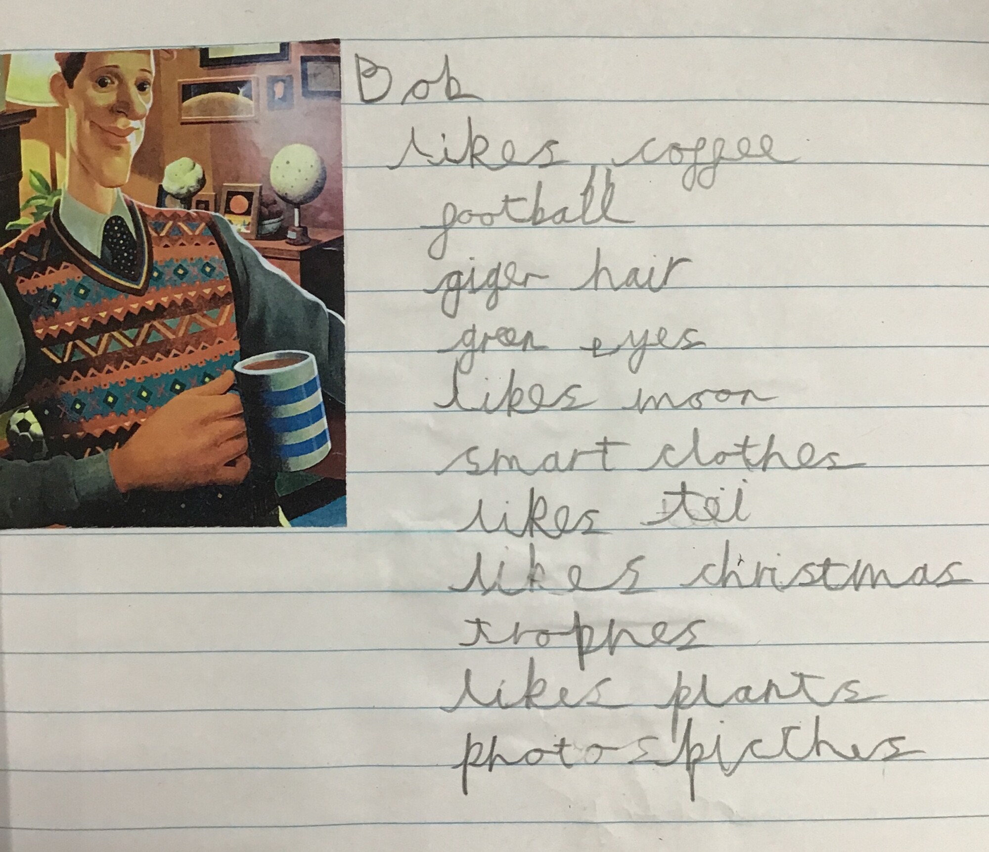 After learning a little bit about Bob from the first few pages of the book and discussing how much we could in fact learn from this one picture of Bob, Kingfishers created their own word bank all about Bob! This will then help us to write our character descriptions next week....
