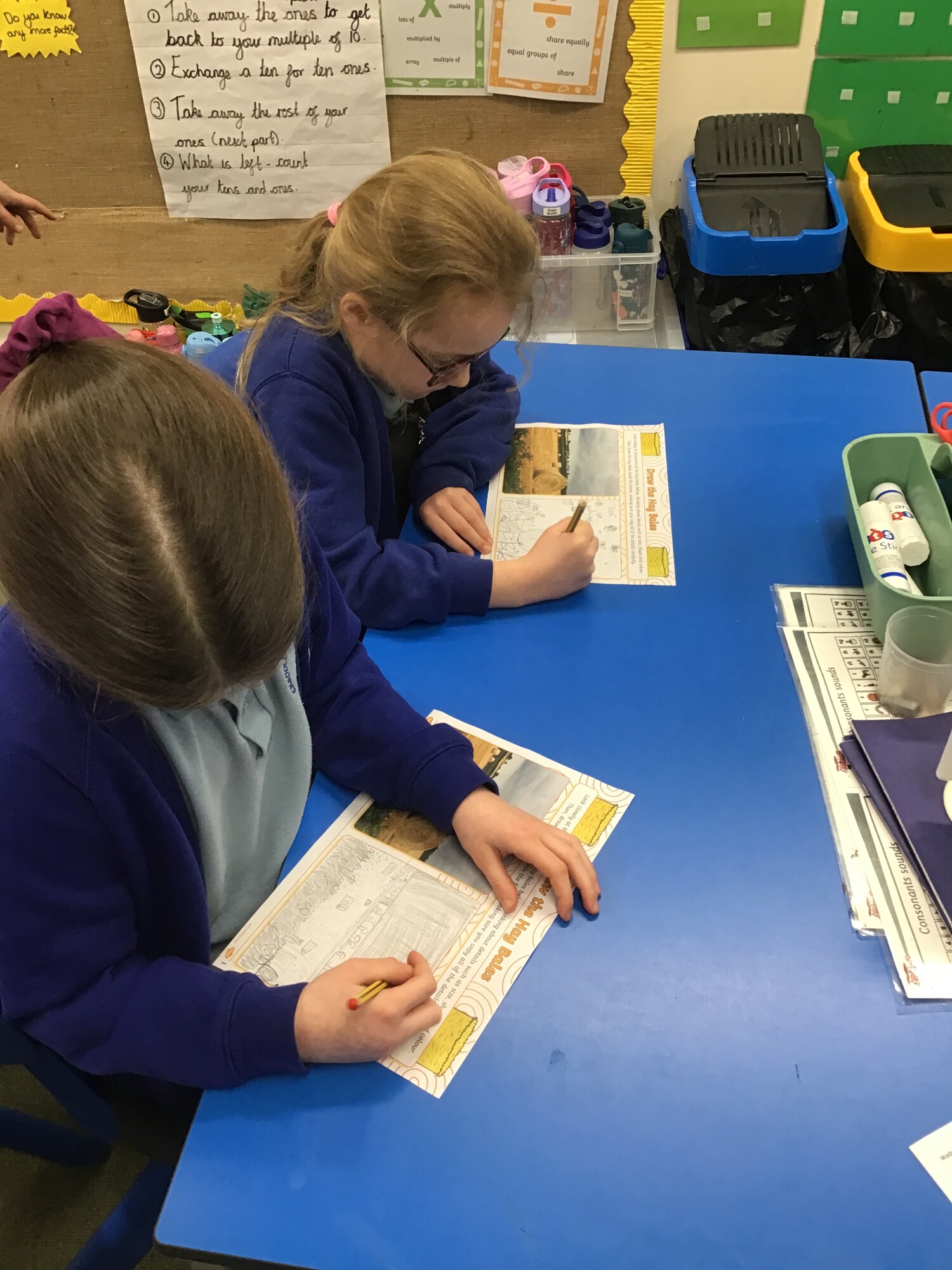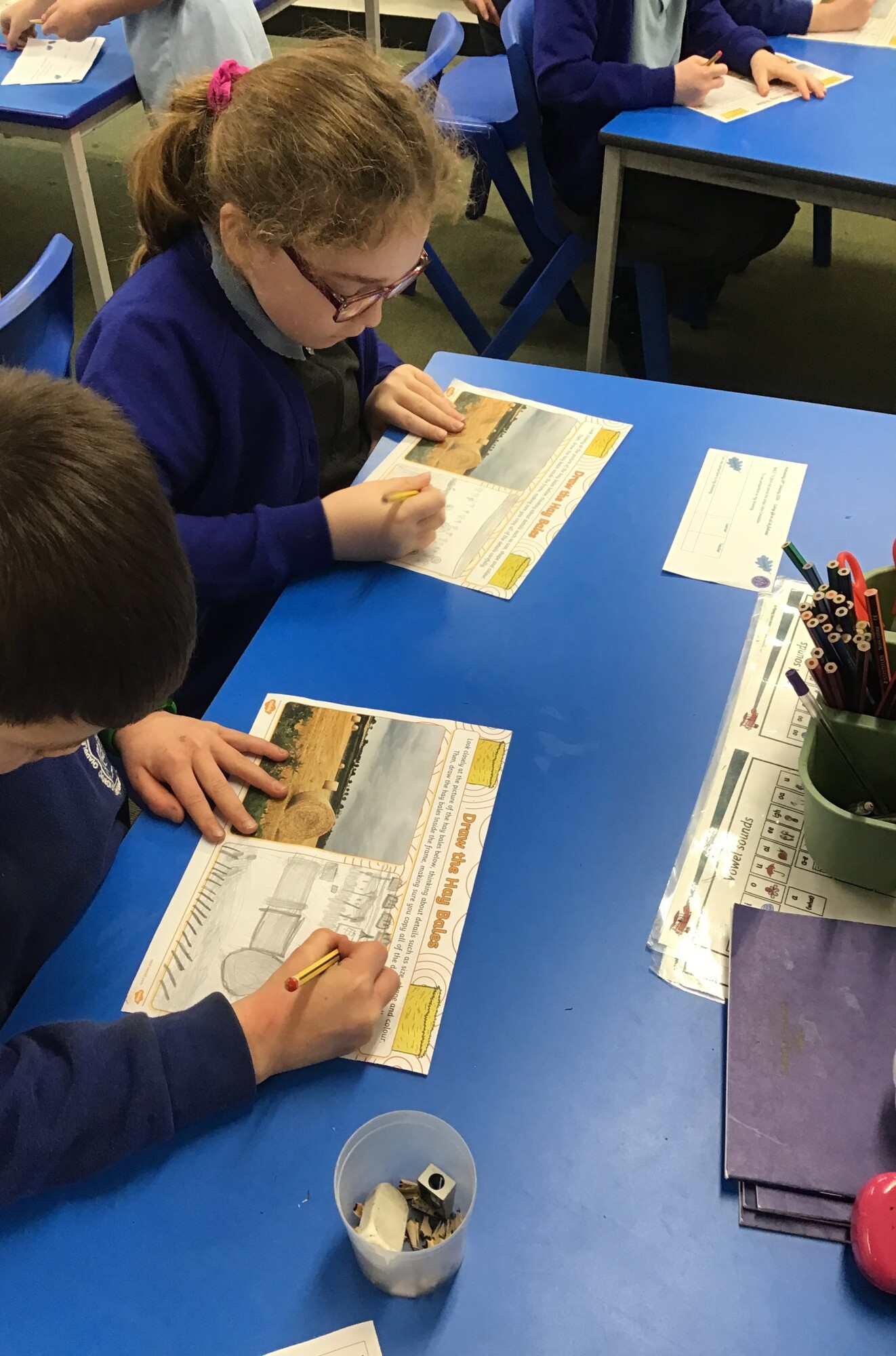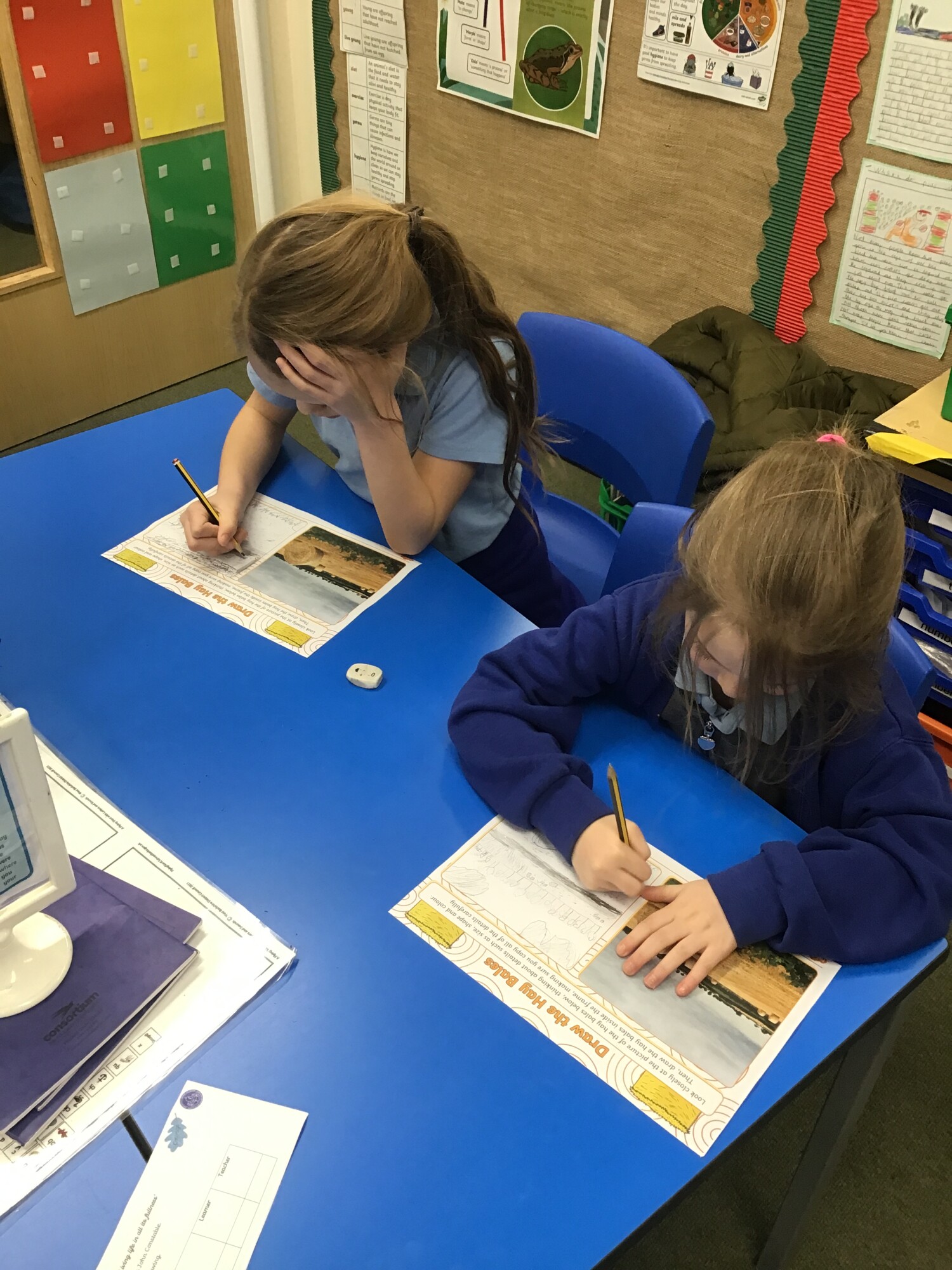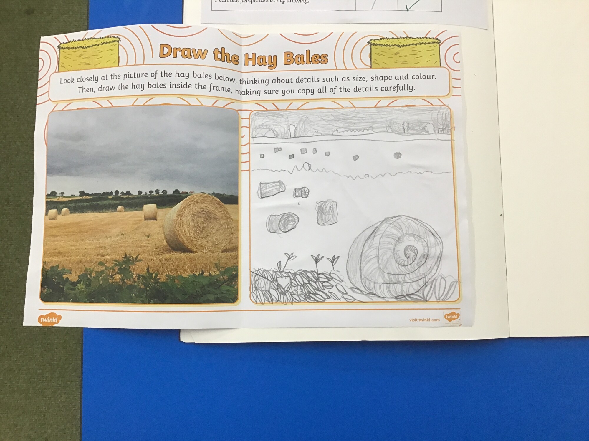 In art, Year 1 and Year 2 continued to develop their skills of showing light and dark colours and textures in their drawings. This week they were introduced to the concept of "perspective". They learnt that objects at the "front" of the picture are bigger than those at the "back" of the picture. The children were also introduced to our focus artist for the term, John Constable. He enjoyed painting landscape pictures of the countryside. To link in with this, the children had a go at copying a picture of a field with hay bales. They worked hard to show perspective in their drawings.
