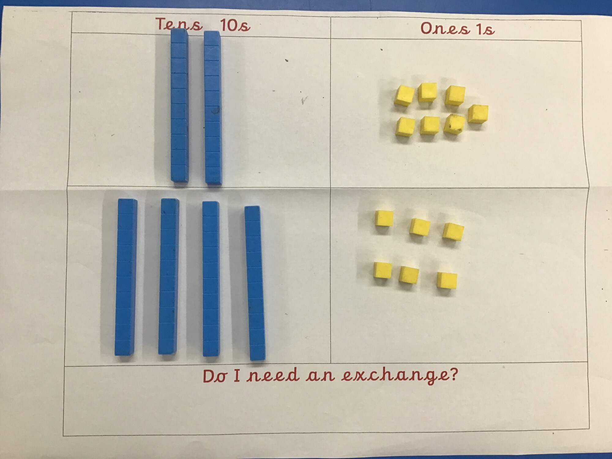 Here we make the 27 and 46 using base 10. The key then is to look at the ones. If we have more than 10 ones we can make an exchange, see the photo below.