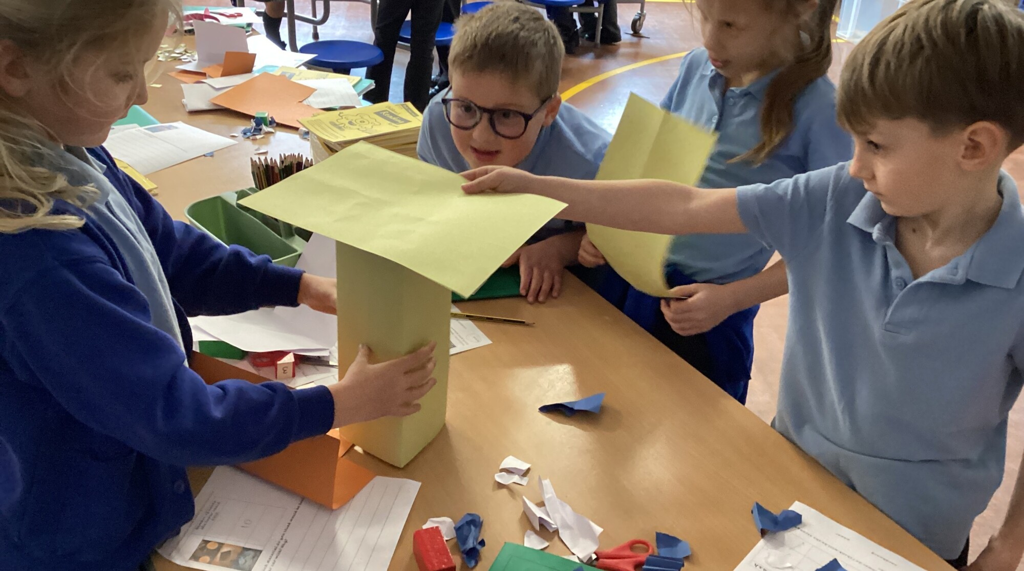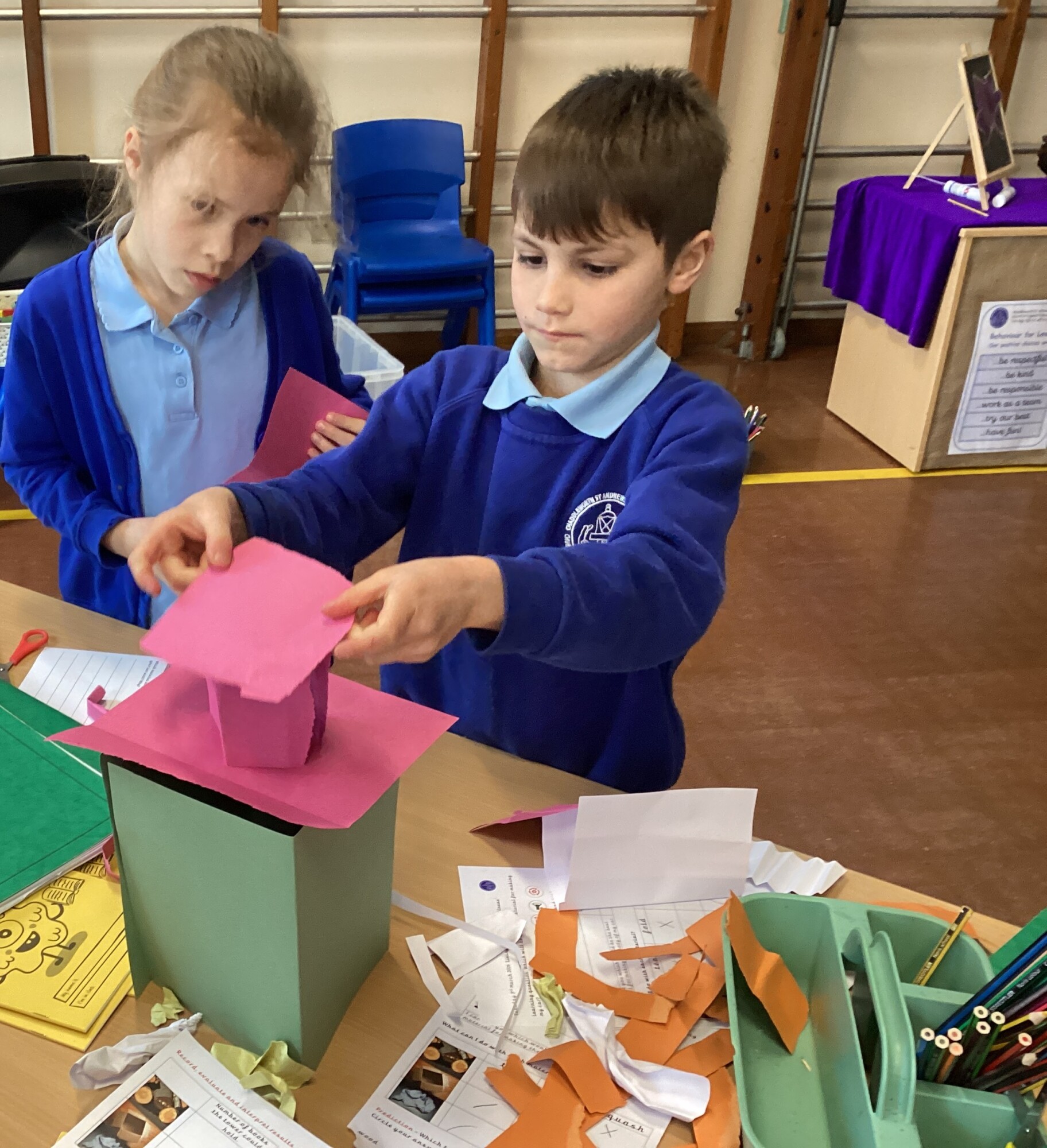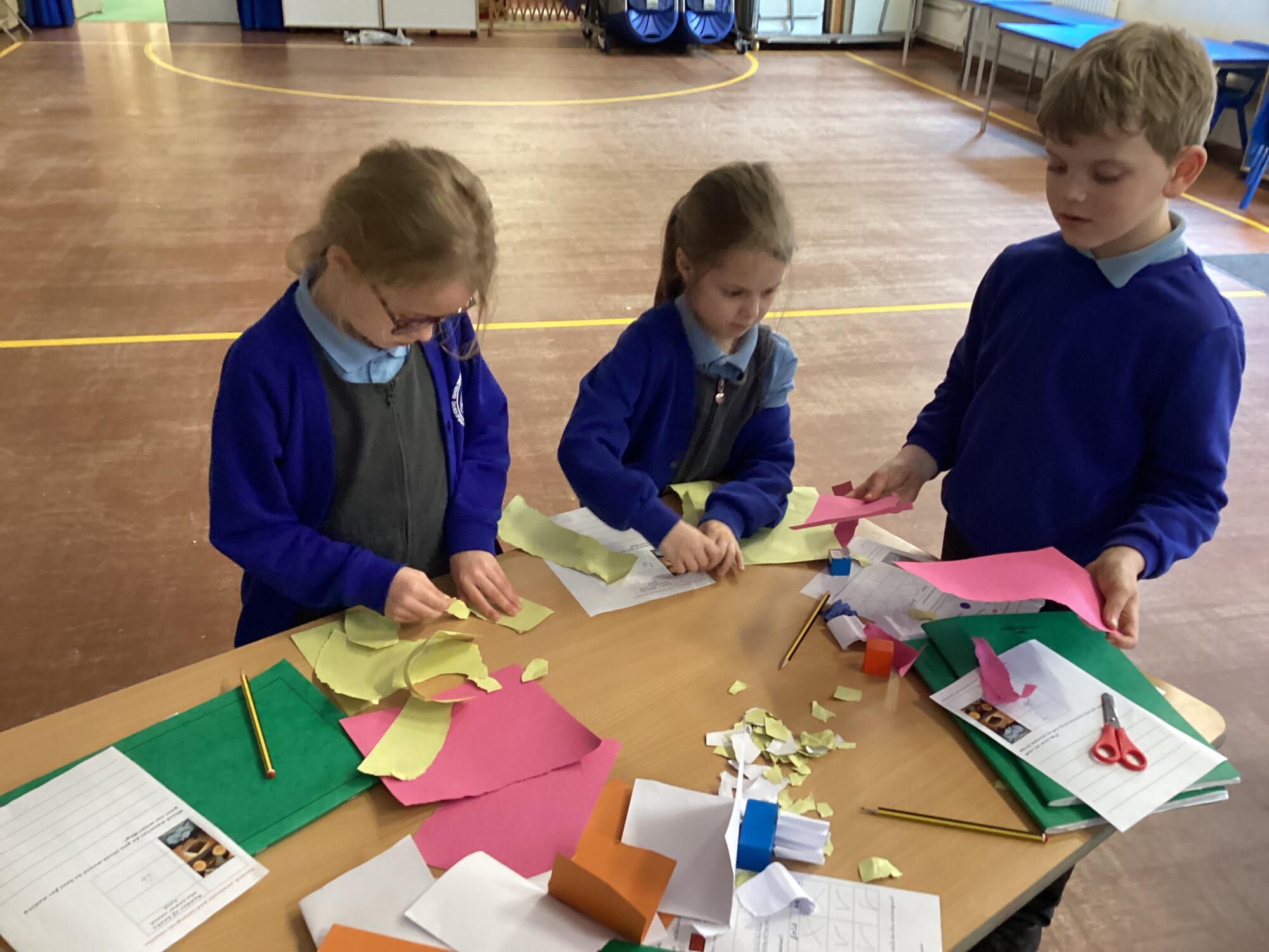 In science Year 1 and Year 2 investigated materials for making their car in design and technology. They had a go at folding, tearing and squashing different materials. They then had to see how strong different materials were. Although wood was the strongest, it would not be squashed, torn or folded. The cardboard worked out to be the best material. It was stronger than paper and it could be folded, torn or squashed.