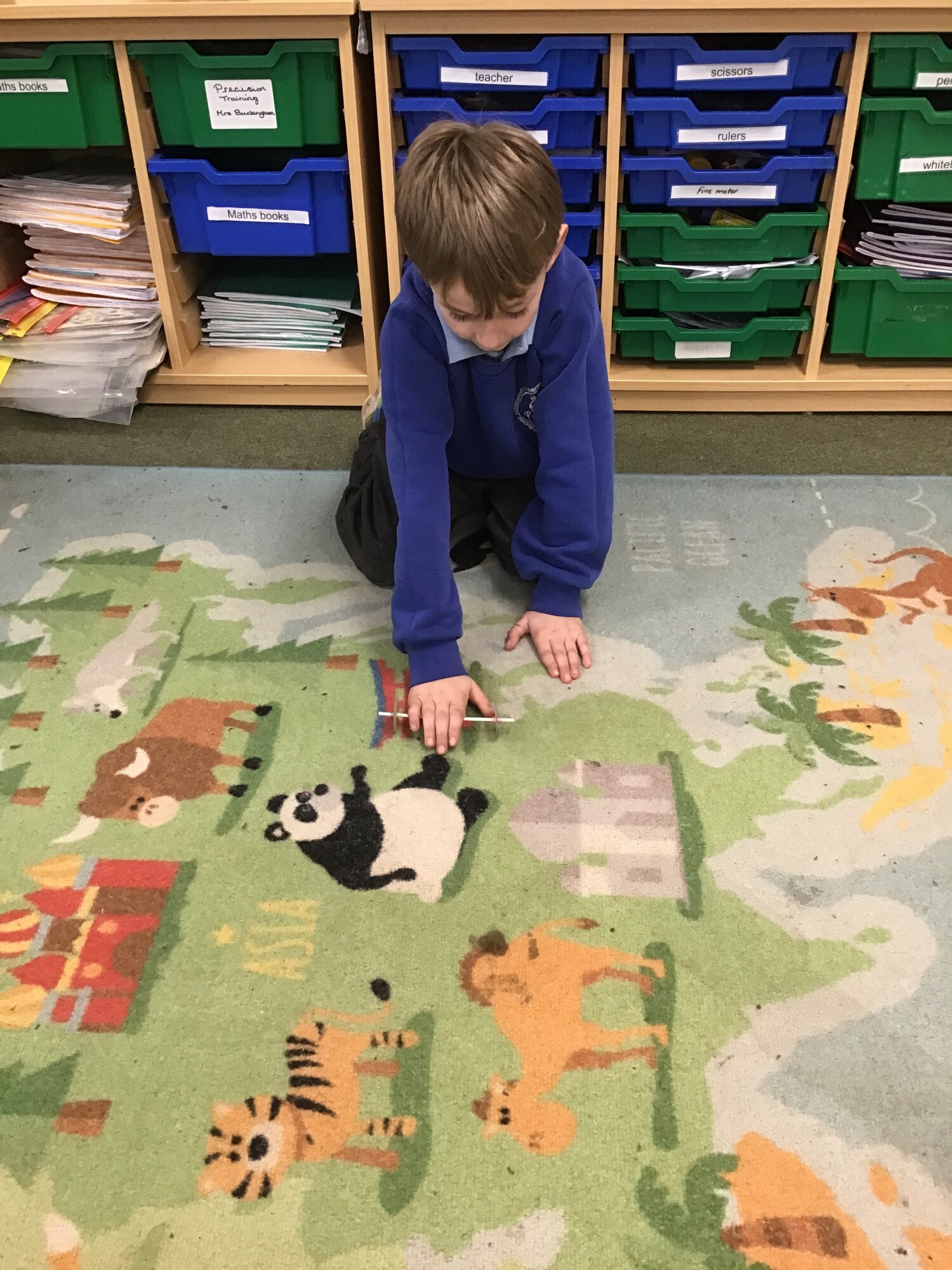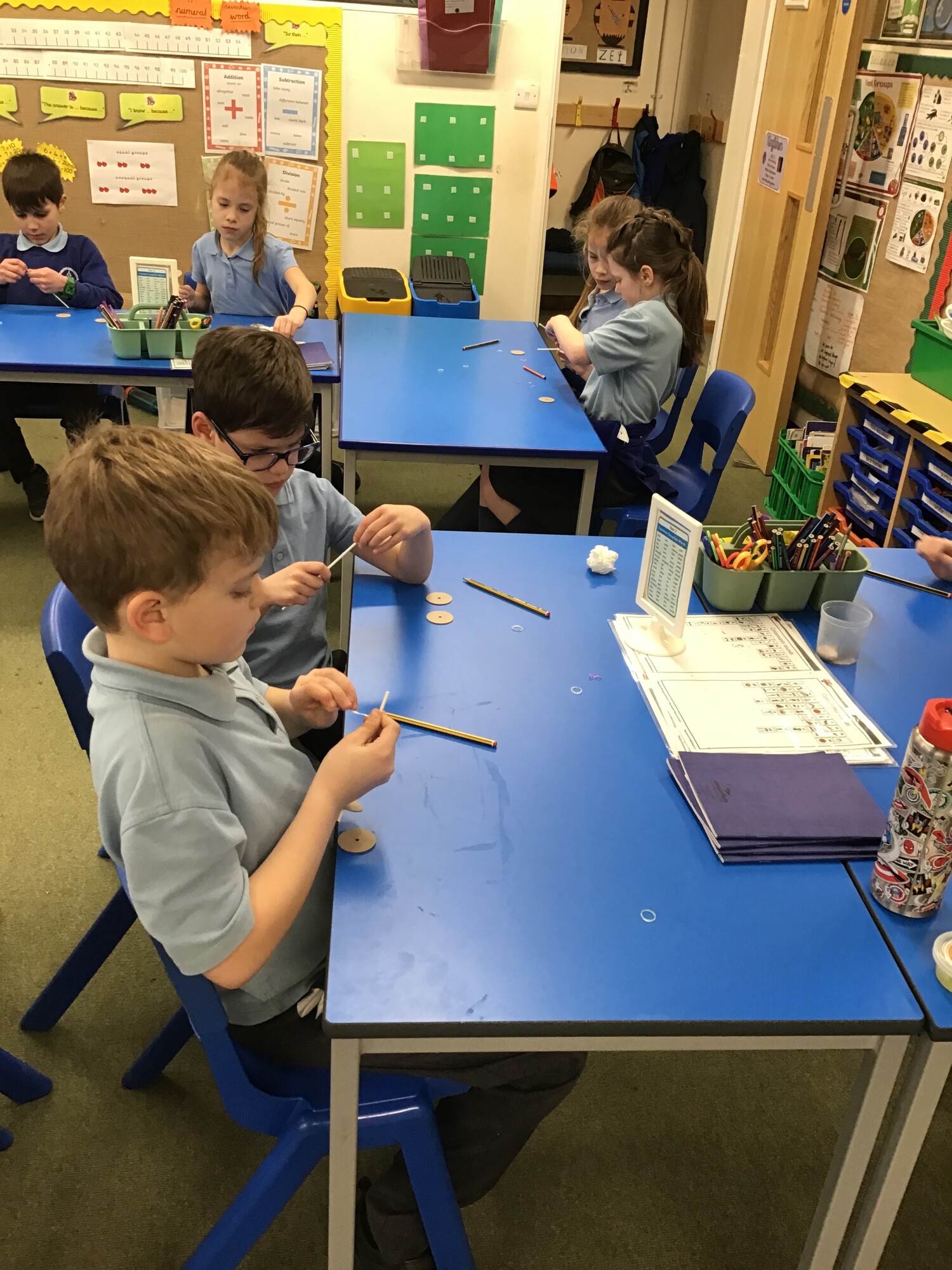 In maths, Year 2 have been learning about repeating addition and linking it with the multiplication sign. They created equal groups with equal amount of objects in each group. They could then write a repeating addition such as 5 + 5 + 5 = 15 and then link this to writing 3 x 5 = 15.
