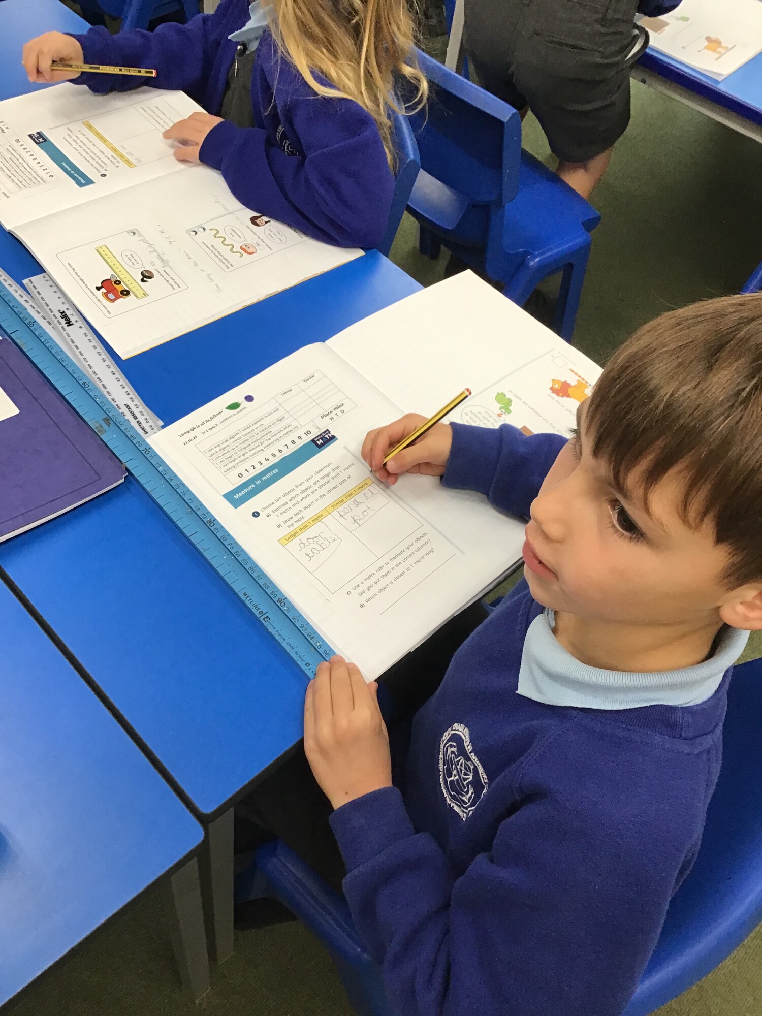 They were able to use the meter sticks to check their estimations and even began to count the height or width of an object in meters, including the classroom, which we worked out was 7 meters wide!