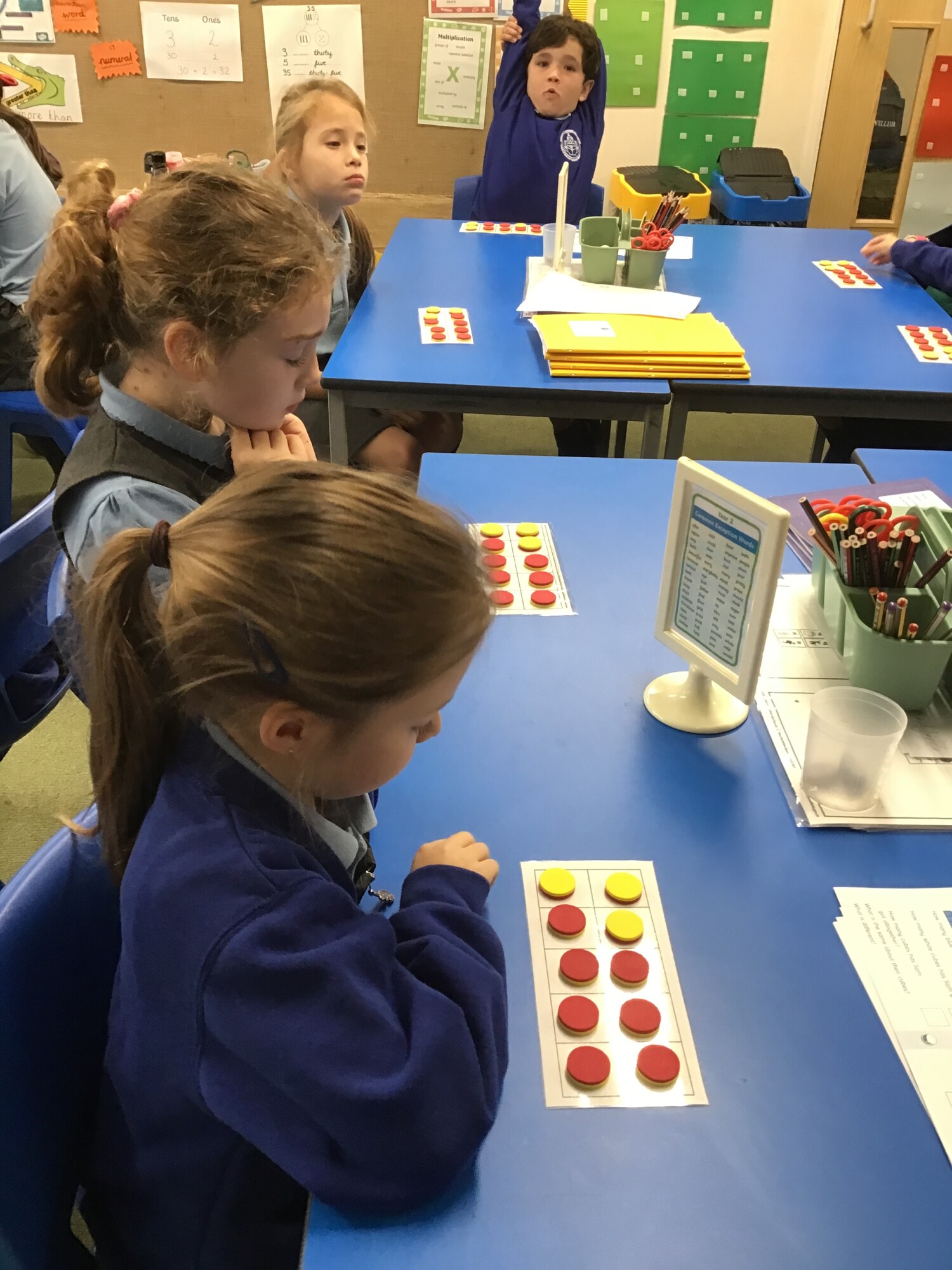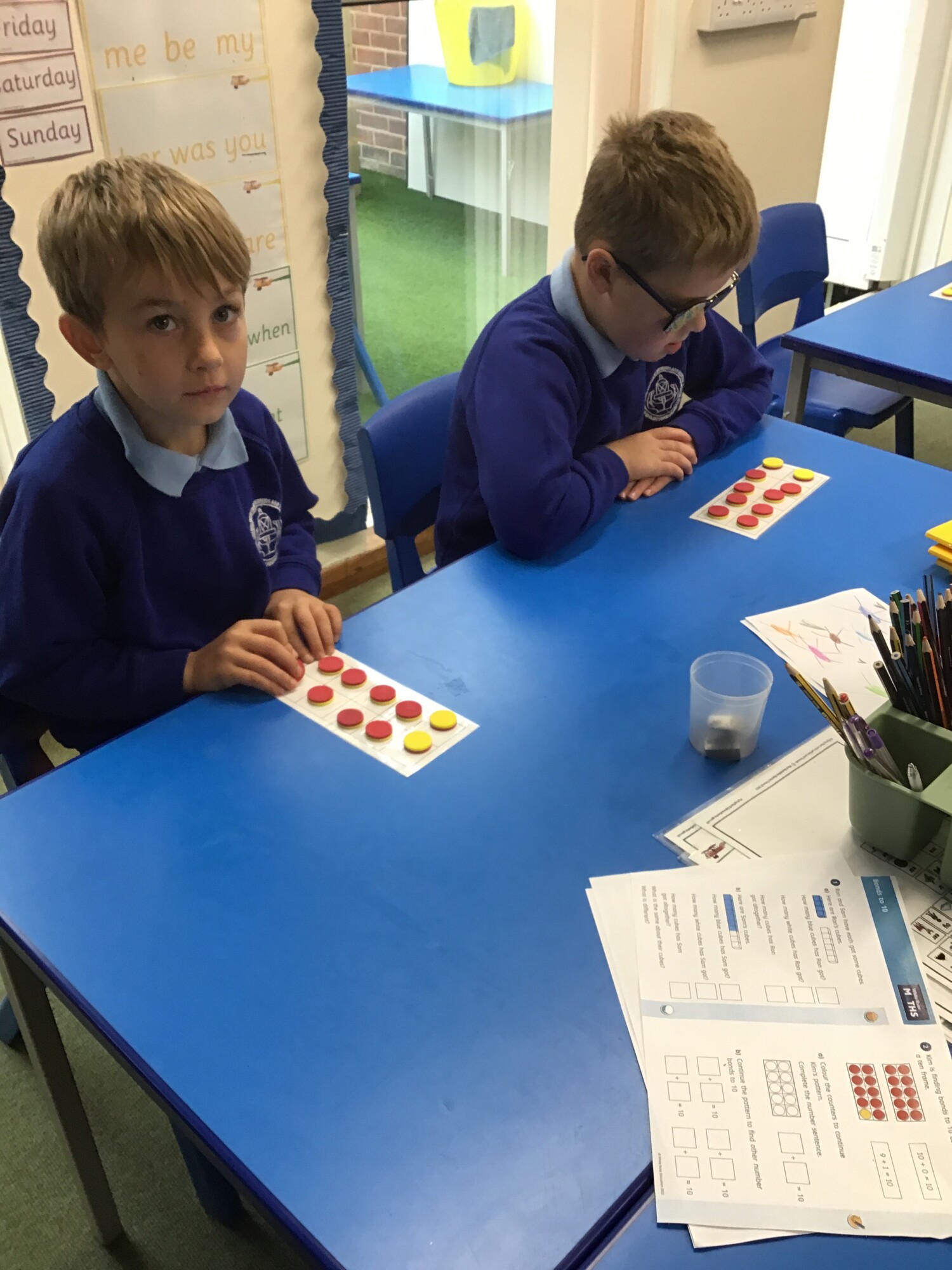 Year 2 have been thinking about their pairs of numbers that make 10. We used tens frames and counters to systematically work out all the pairs of numbers that make 10. For example 10 yellow counters and 0 red counters makes 10, 9 yellow counters and 1 red counter makes 10, eight yellow counters and 2 red counters makes 10 etc. They have then been applying this knowledge to pairs of numbers that make 20. We have thought about fact families and all the facts we can write if we know three numbers - 2 parts and a whole. For example, 18 + 2 = 20.