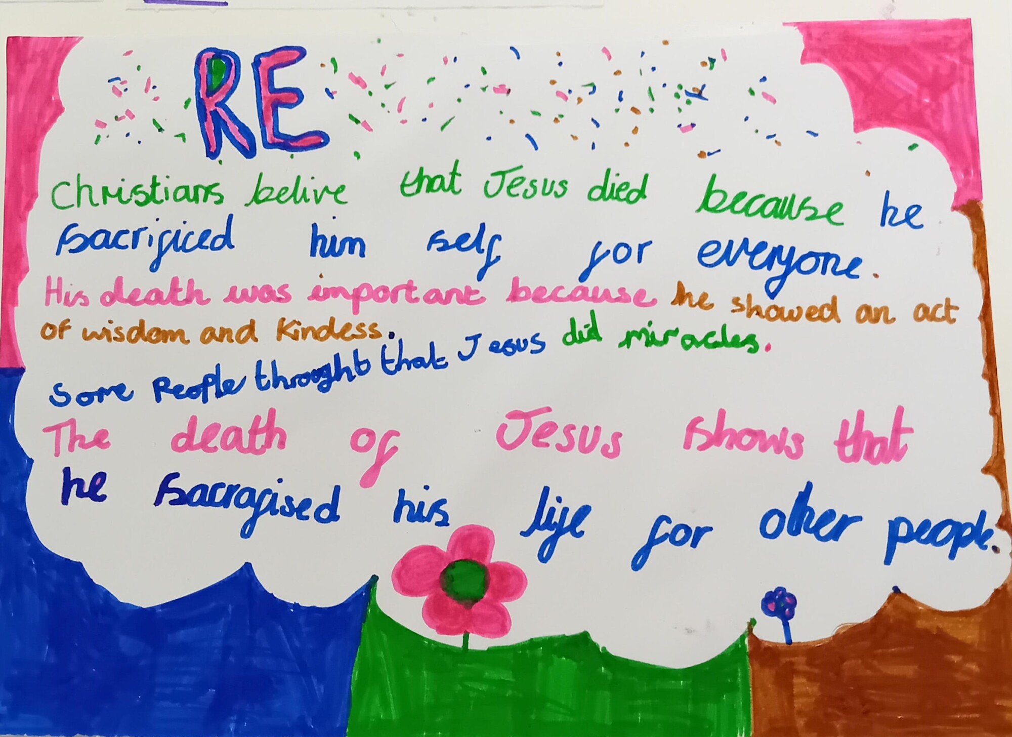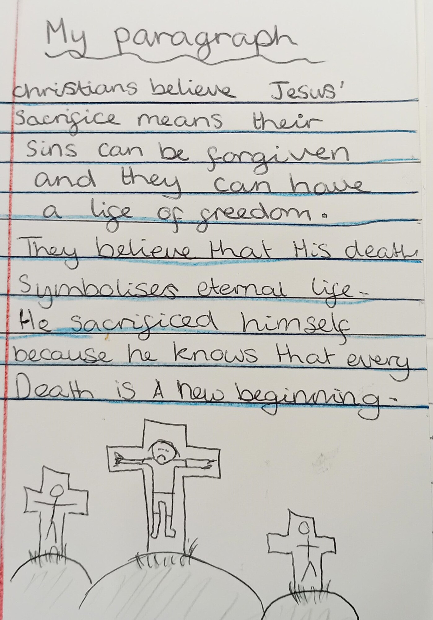 In RE, we summarised our unit question: What do Christians believe about Jesus’ death? We recapped all of our previous learning and discussed what we thought the answer was before writing a paragraph to answer the question. Next term, we will be exploring rites of passage.