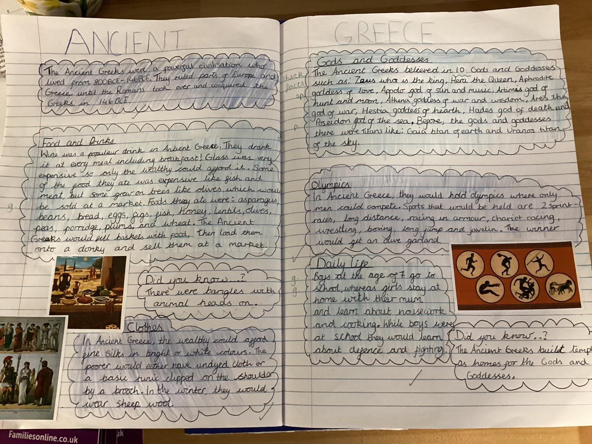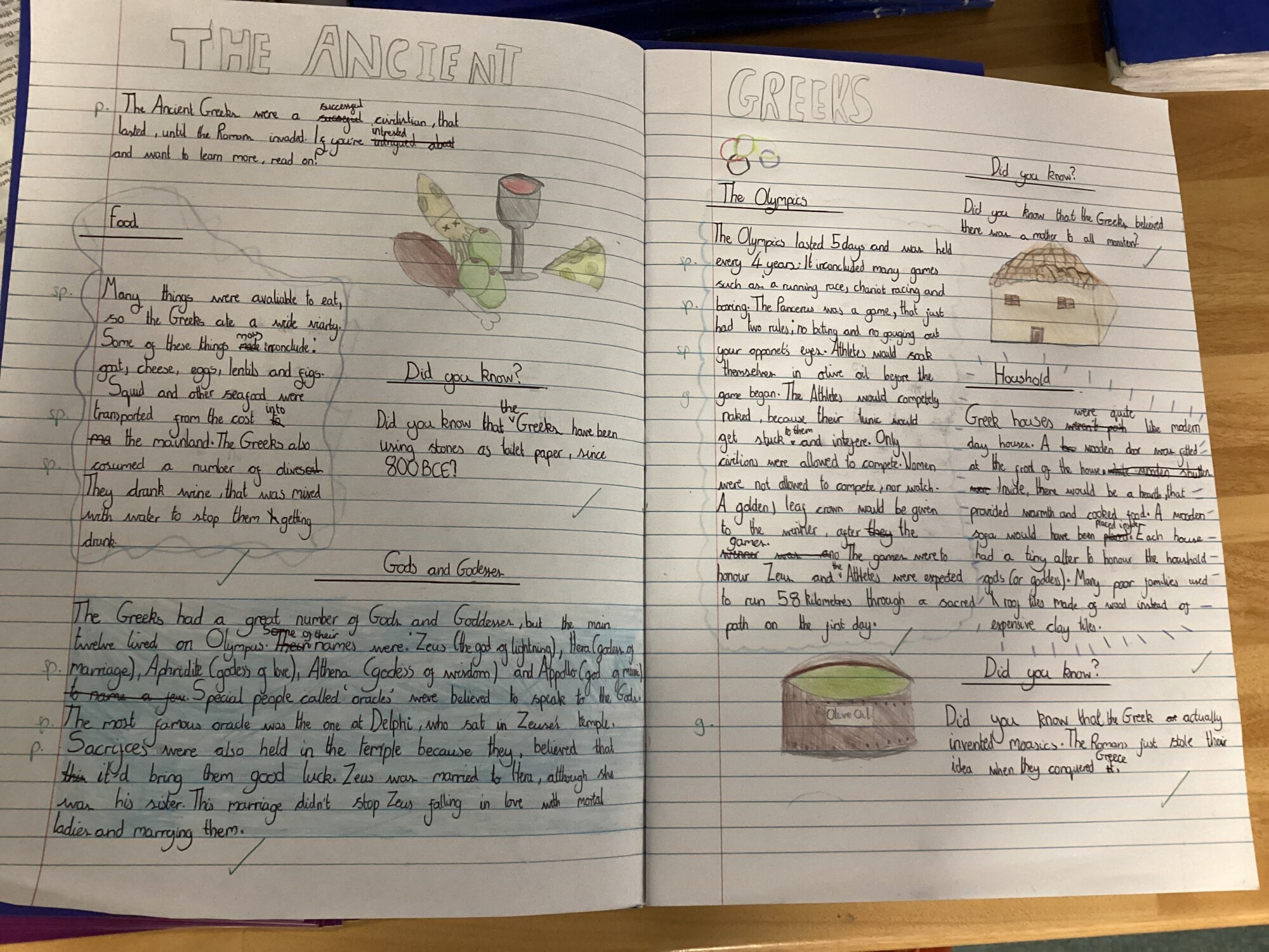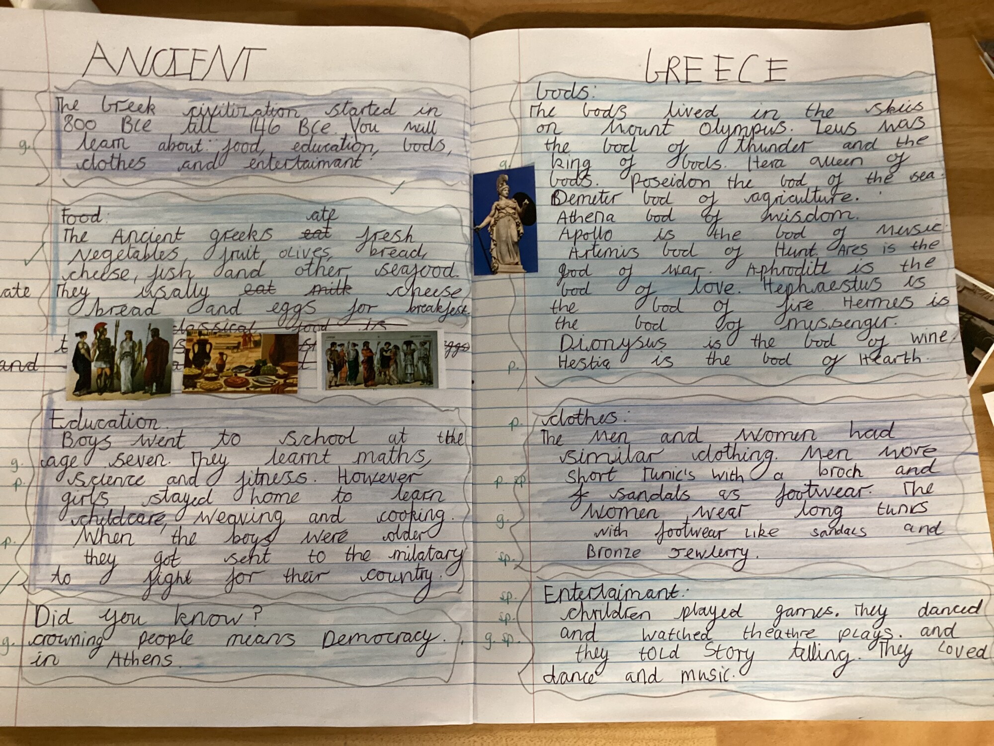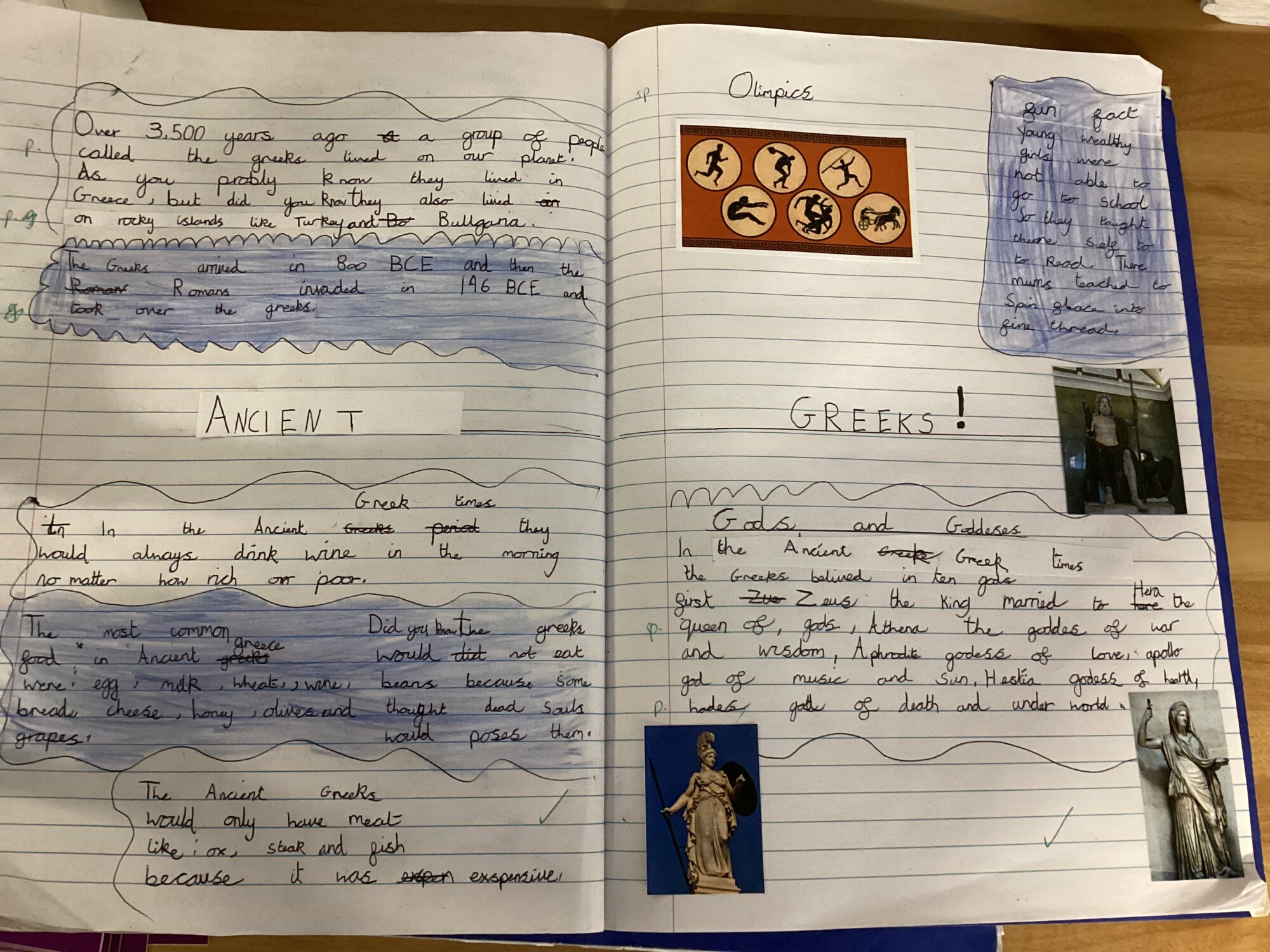 In English this week, we planned our own setting descriptions and then wrote them. We tried really hard to include senses descriptions, figurative language and adverbials. Our use of punctuation is definitely improving and the children are putting in a lot of effort. Once we had finished our setting descriptions, we moved our attention to writing our double page spread about the Ancient Greeks. We focused on research for a couple of lessons and how to take useful, efficient notes. Then we created informative, well-presented non-chronological reports. Next week, we will be working on creating an exciting plot for a narrative based on Malamander by Thomas Taylor.