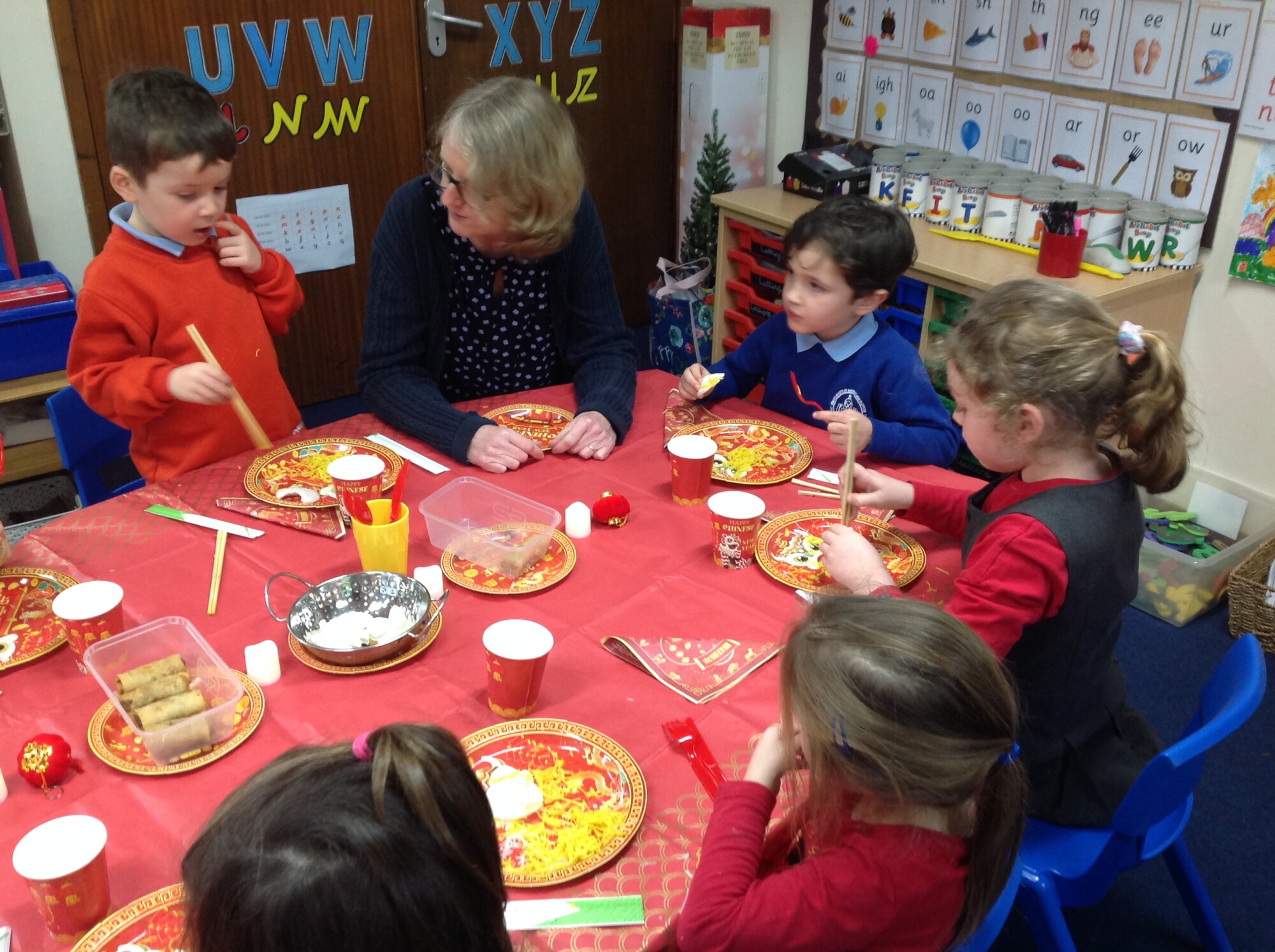 Then on Friday, Mrs Stephenson joined us for our Chinese New Year celebrations. The classroom was adorned with Chinese decorations, we listened to traditional Chinese music, we dressed in red and yellow clothing (the Chinese believe these colours bring good luck). We ate with chopsticks and feasted on spring rolls, noodles and prawn crackers! At the end of the meal we were all presented with a 'lucky envelope' with two 'lucky coins' inside - these can be found in the Reading Record wallets. You will also find in there a half term challenge sheet from the PTFA - one of the challenges is to enjoy a meal with family / friends - well you can probably tick that one off straight away as Friday afternoon we did just that! Just take a look at the photos below.