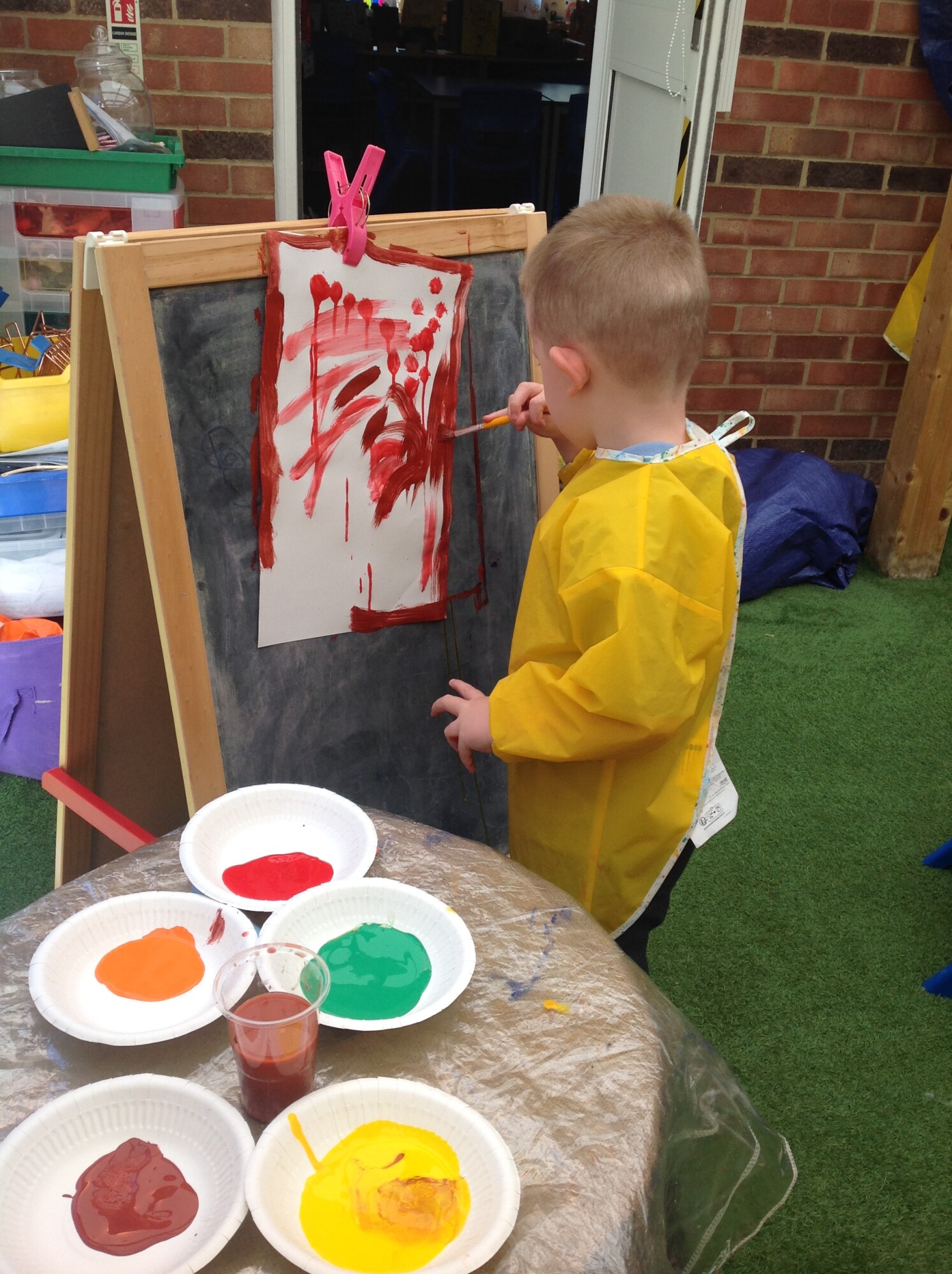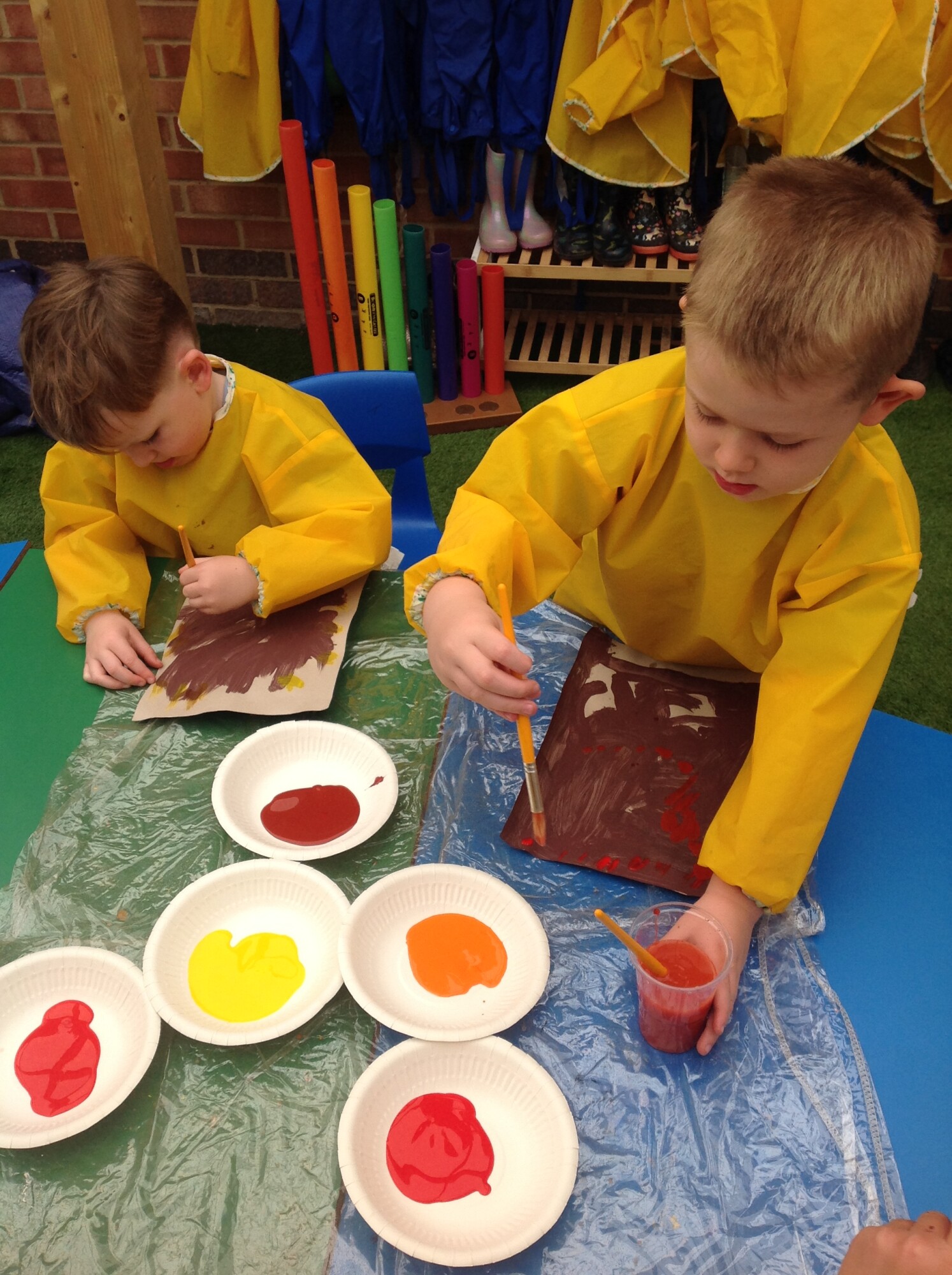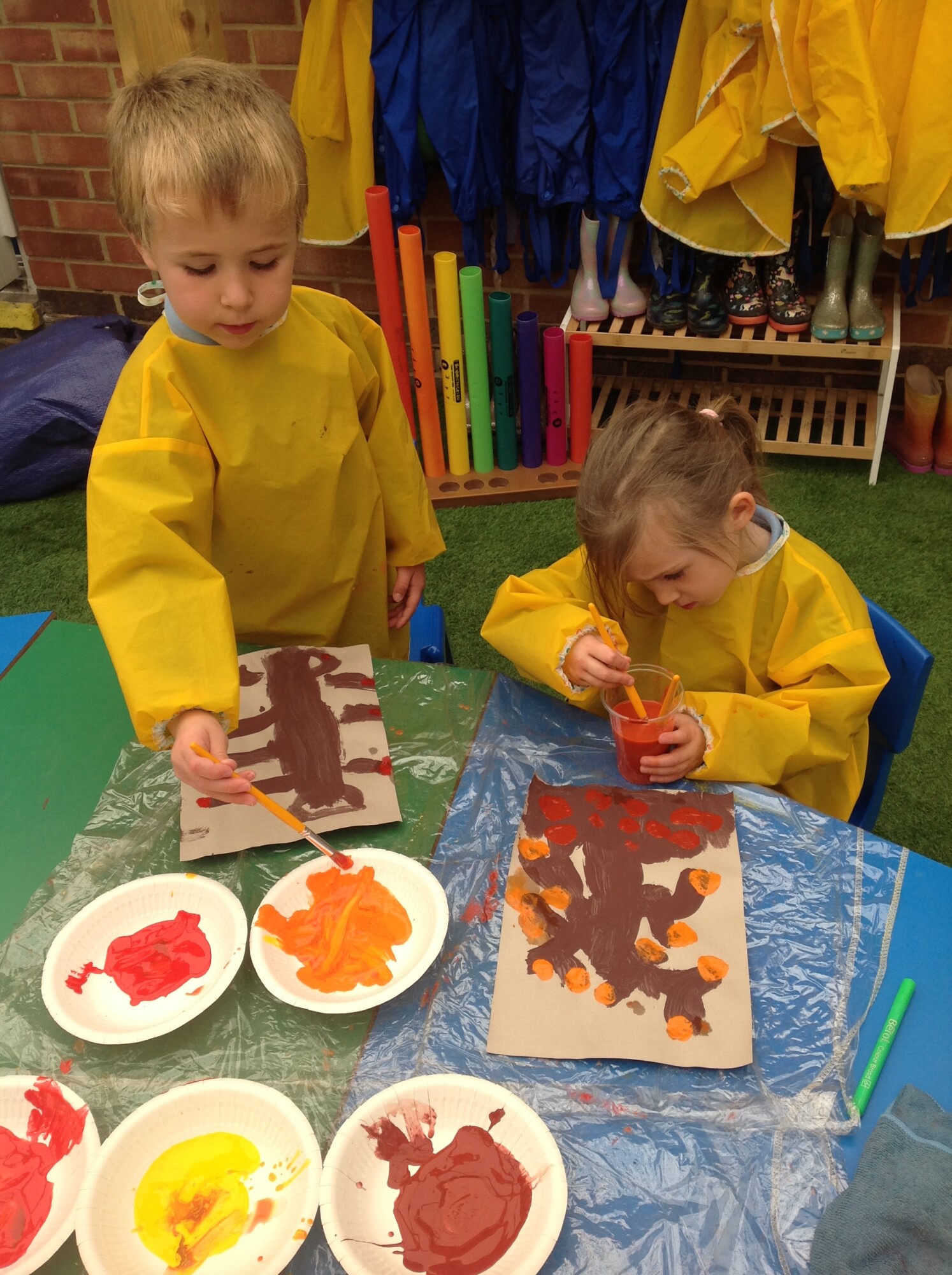 On Thursday the children continued developing their skills of using a paintbrush. We went over how we have to hold the brush and how important it is to clean the brush when changing between different colours. The children painted leaves in different colours on their autumn trees that they started last week. The were also keen to have a go at painting their own pictures of whatever they wanted so they had the opportunity to do this as well.