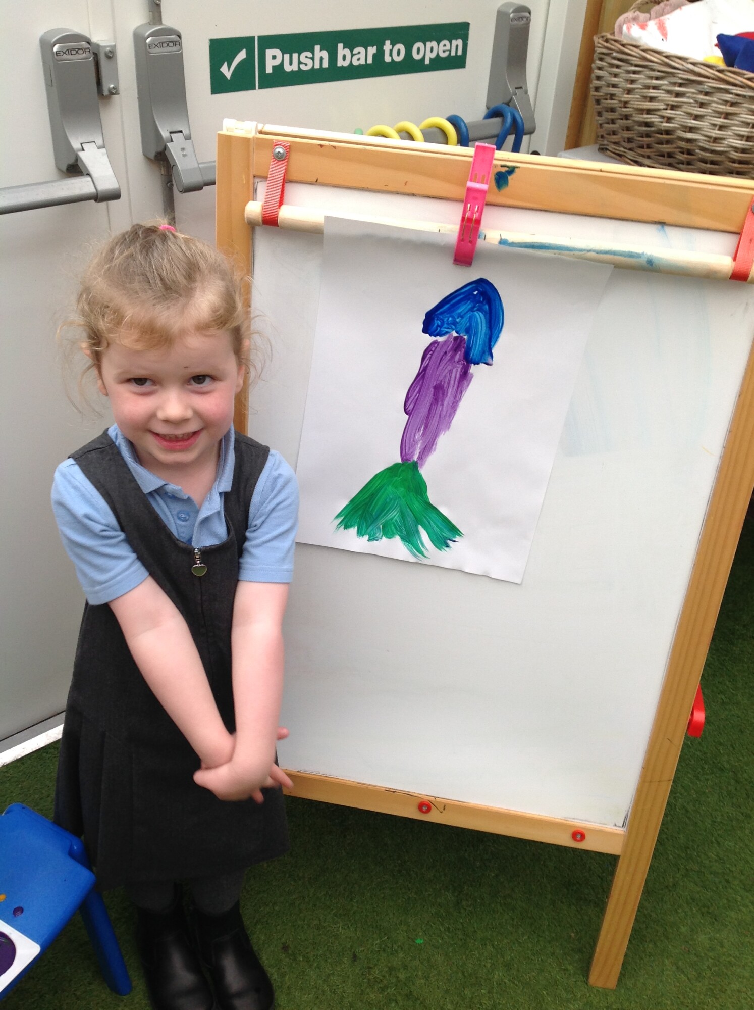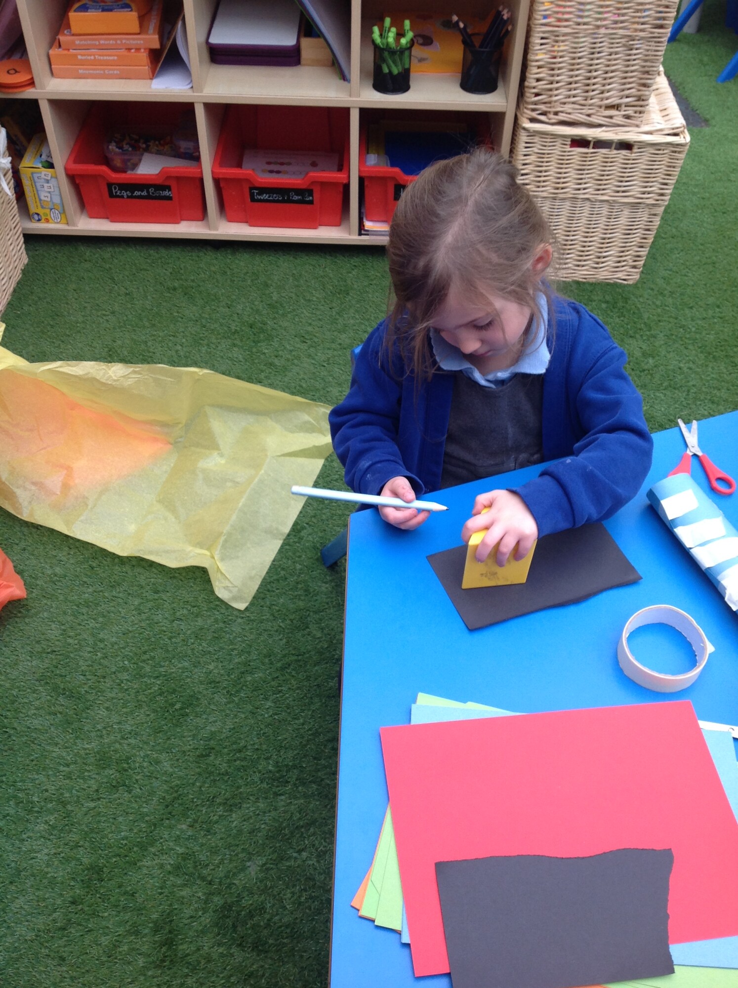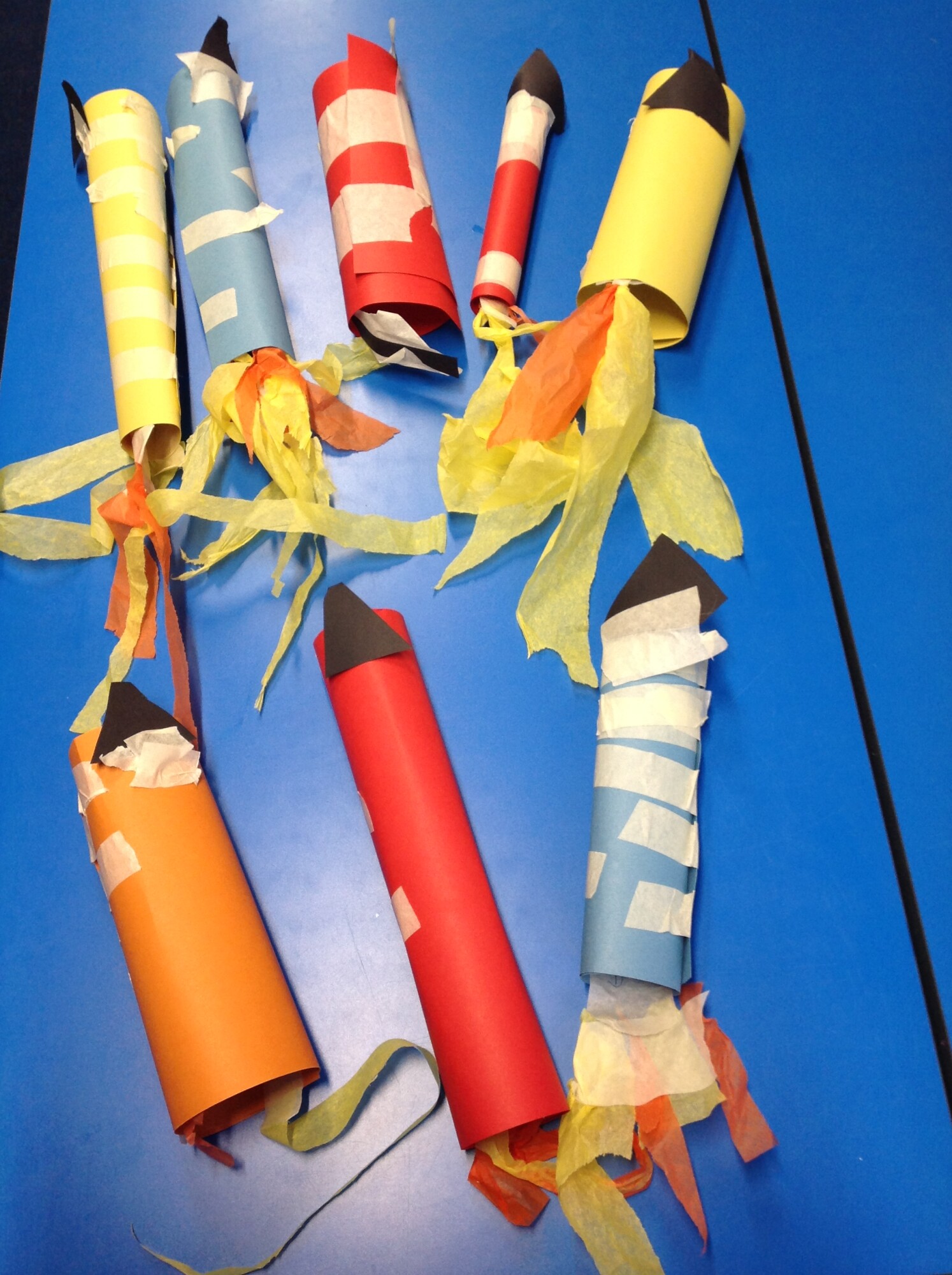 In Art this week, the children applied skills that they had previously learnt when they made binoculars. They were very good at remembering that masking tape works better than glue when making a cylinder shape. They also remembered how to draw around a template to get a shape they needed (the triangle for the top of their rocket) and then cut it out. We also talked about glue being used to stick the triangle on the rocket as the triangle was flat. Some children chose to use glue and others chose to use the masking tape again. Finally, they added some flames by using the masking tape again. The children also had the opportunity to paint. Some chose to paint Bonfire Night pictures.