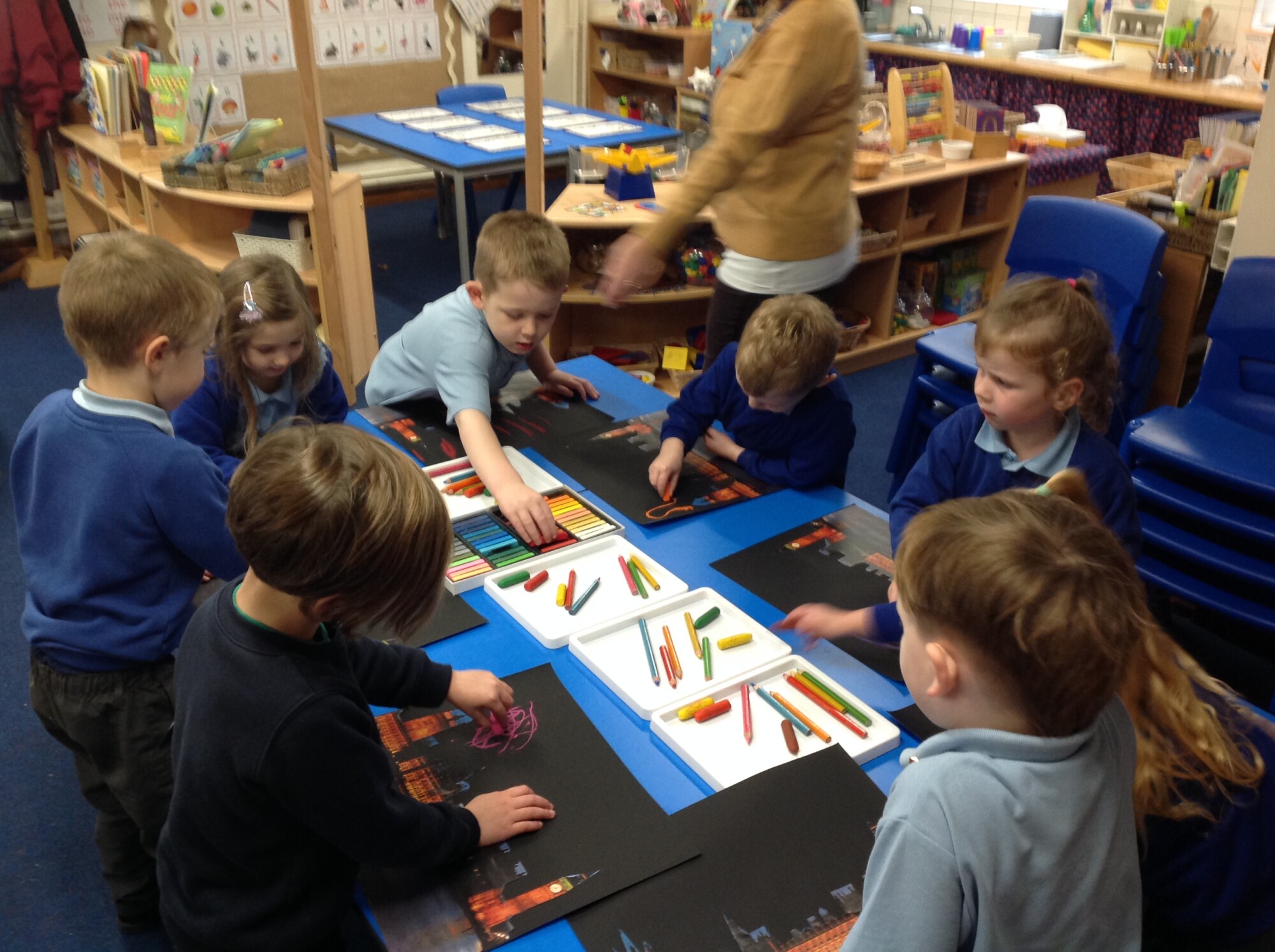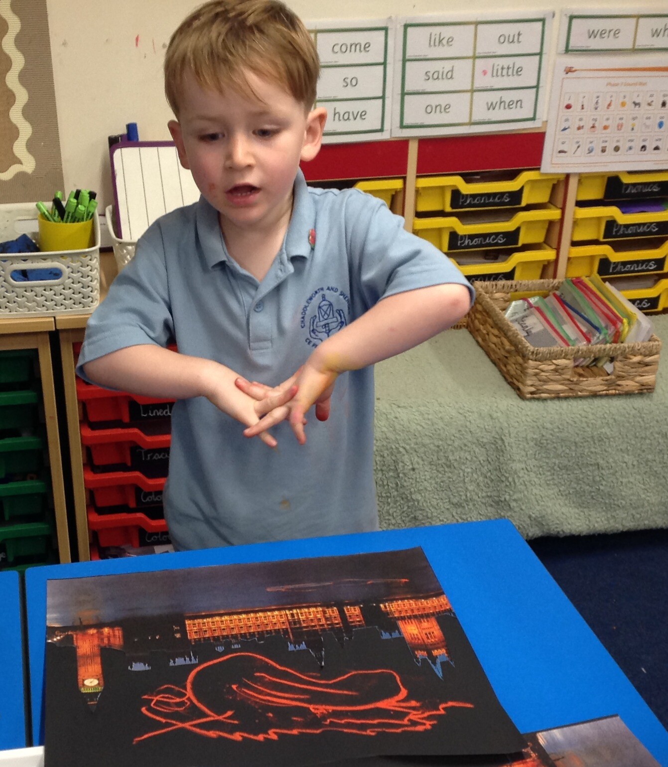 We also used different media when creating our firework pictures such as chalk, pastels and crayons. First, we listened to the story of Guy Fawkes in order to understand why we celebrate with fireworks on November 5th. Next, we discussed famous landmarks in London that are still there today but could easily have been destroyed by Guy Fawkes if the plot had been successful. Robins were fantastic at remembering vocabulary such as Houses of Parliament, River Thames, King James 1st, London.