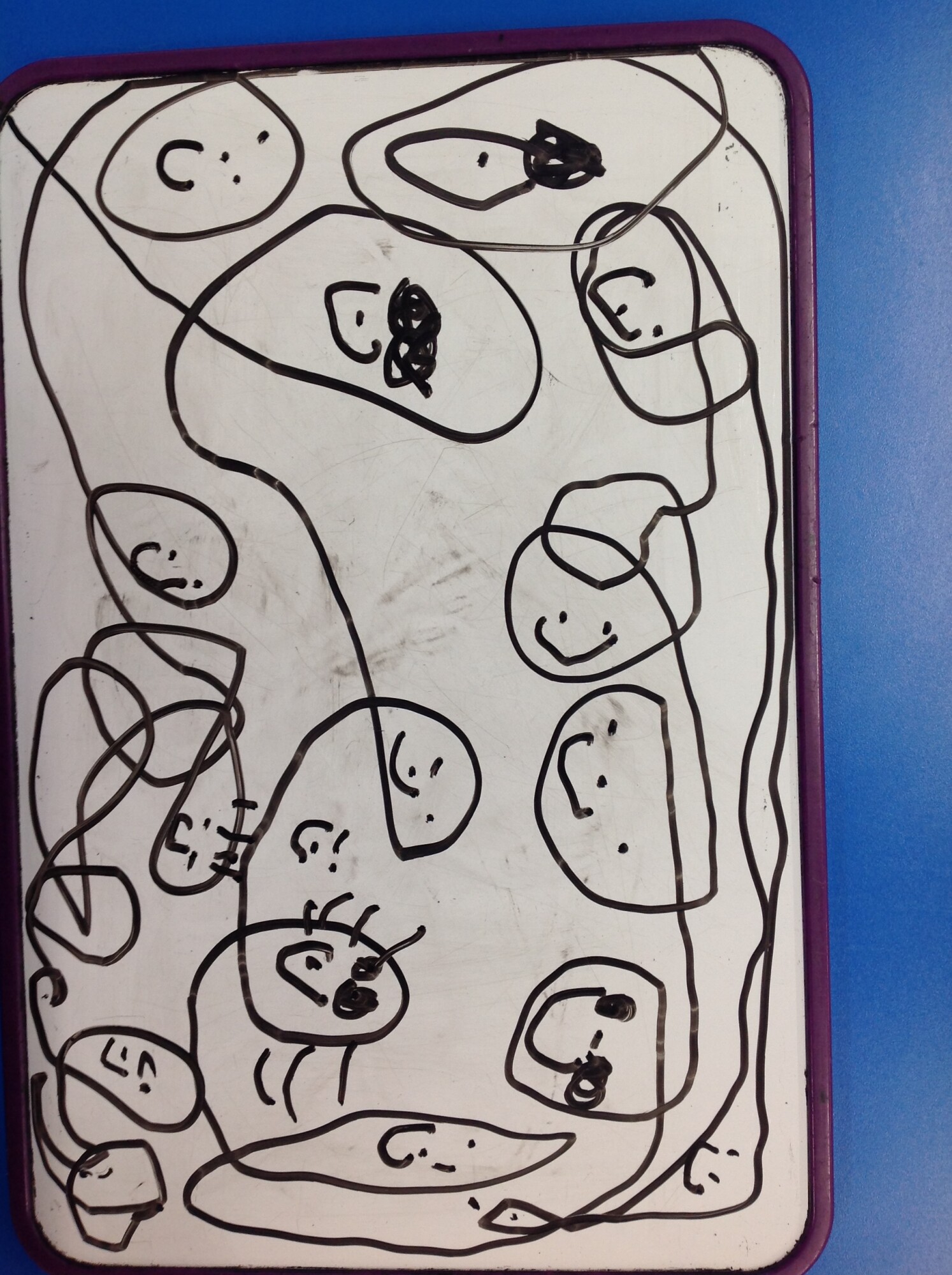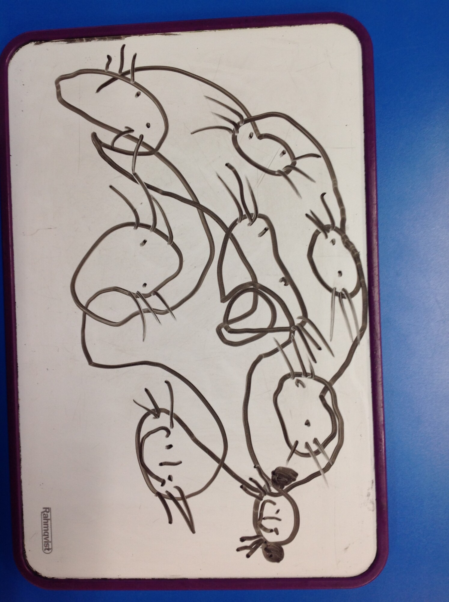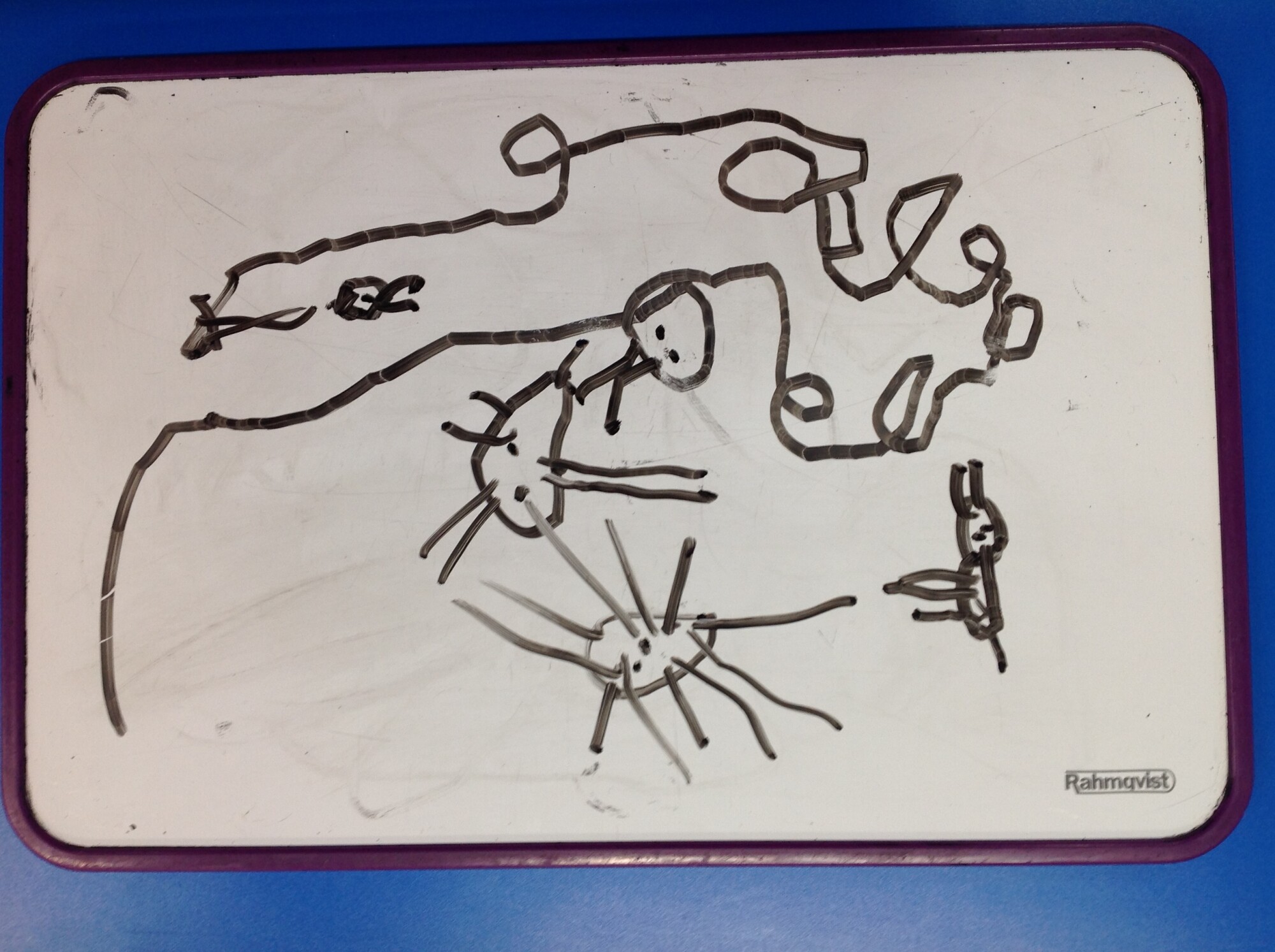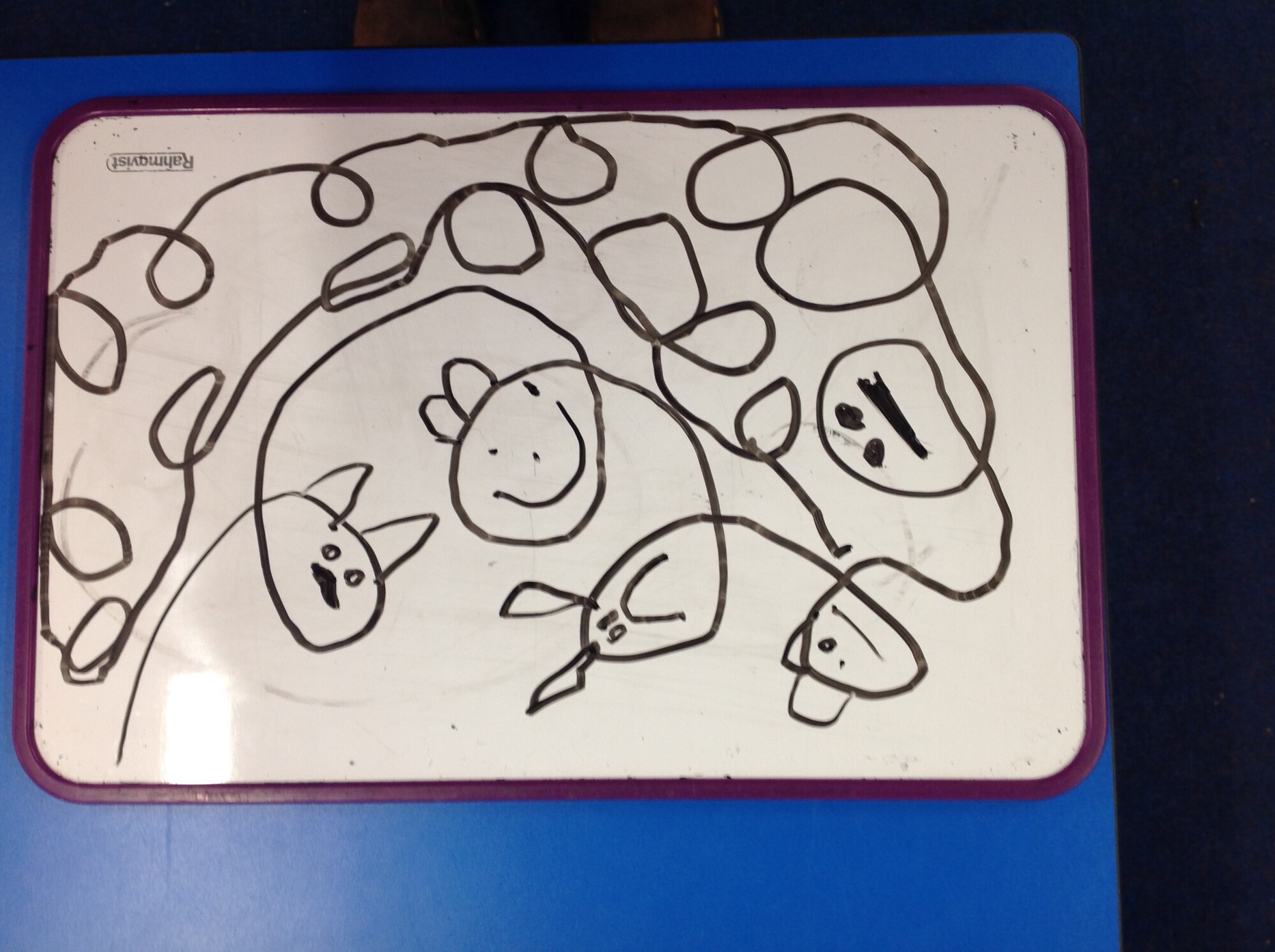 Our morning activity this term is drawing and already, just within the four days we had this week, we were seeing far more control when using the pencil to mark make, we also found that we were giving fewer reminders for using the correct pencil grip. Last term we focussed heavily on developing our fine motor control, manipulating small objects using the pincer grip in readiness for mark making this term. We also follow a programme called 'Write Dance' which is pretty much what it says on the tin, mark making (writing) to music. This term we are following the Krongelidong (I have no idea about the names). Last term we were performing The Volcano, this term we learnt that the volcano erupted and destroyed the village of the Write Dance people and so they have had to spend many days walking through fields and forest, along paths that twist and loop in order to find a new location to set up their new village and yet on their journey they have a funny feeling that somebody or something is 'watching' them. And they are right, lots of friendly little animals have been following them on their journey. Take a look at the pictures below - can you make out the journey and the animals.