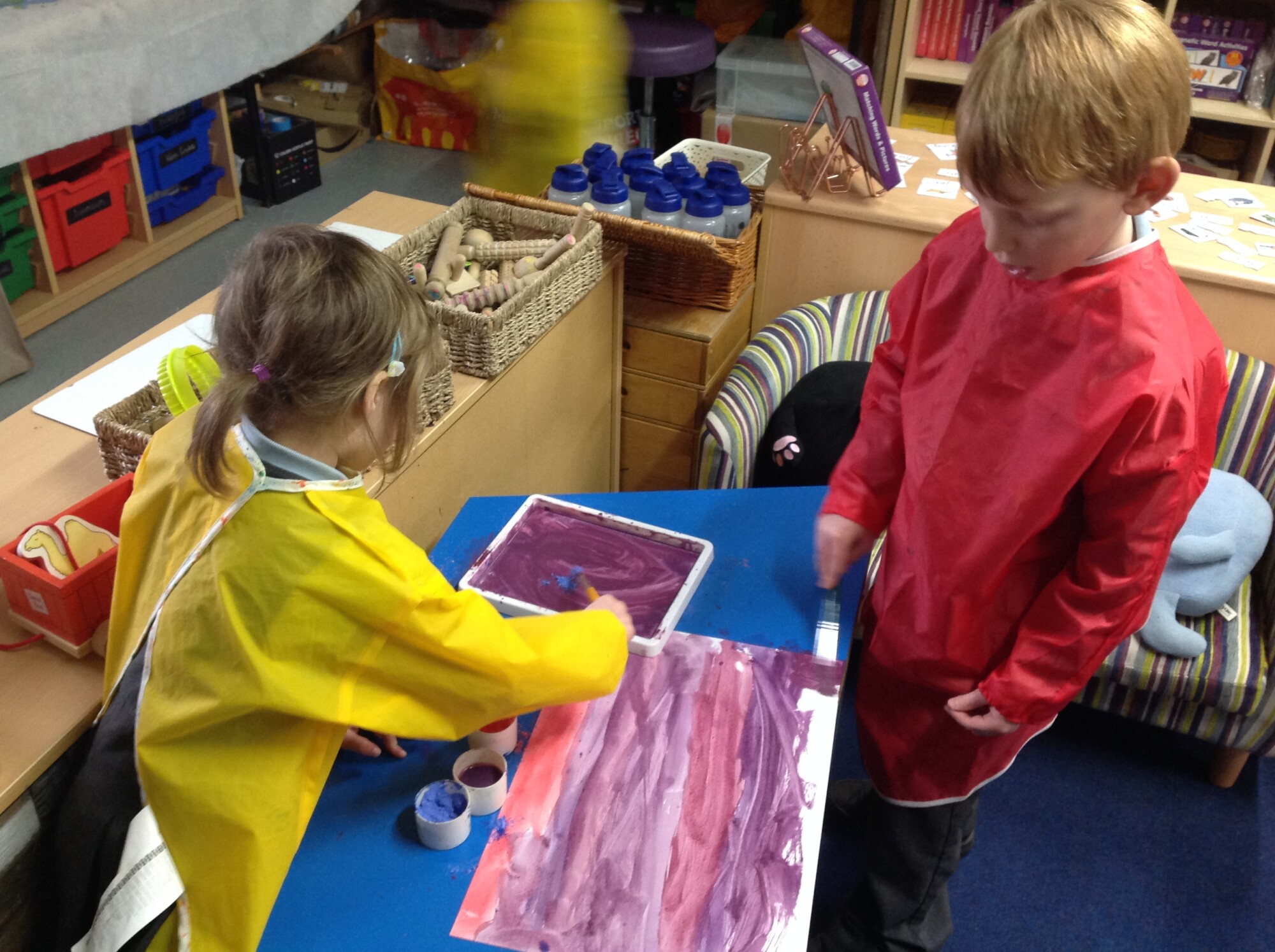 On Wednesday, before heading into our Pantomimus session with Danielle, we got stuck into our Art session, colour mixing, blue + red = purple. So that's it - we have explored colour mixing with all three primary colours and have enjoyed creating our varying shades of secondary colours. Next term, the powder paints will be part of our continous provision which means the equipment will be available to the children to use whenever they wish - we will be watching closely to make sure they use the skills they have learnt in the Art sessions!