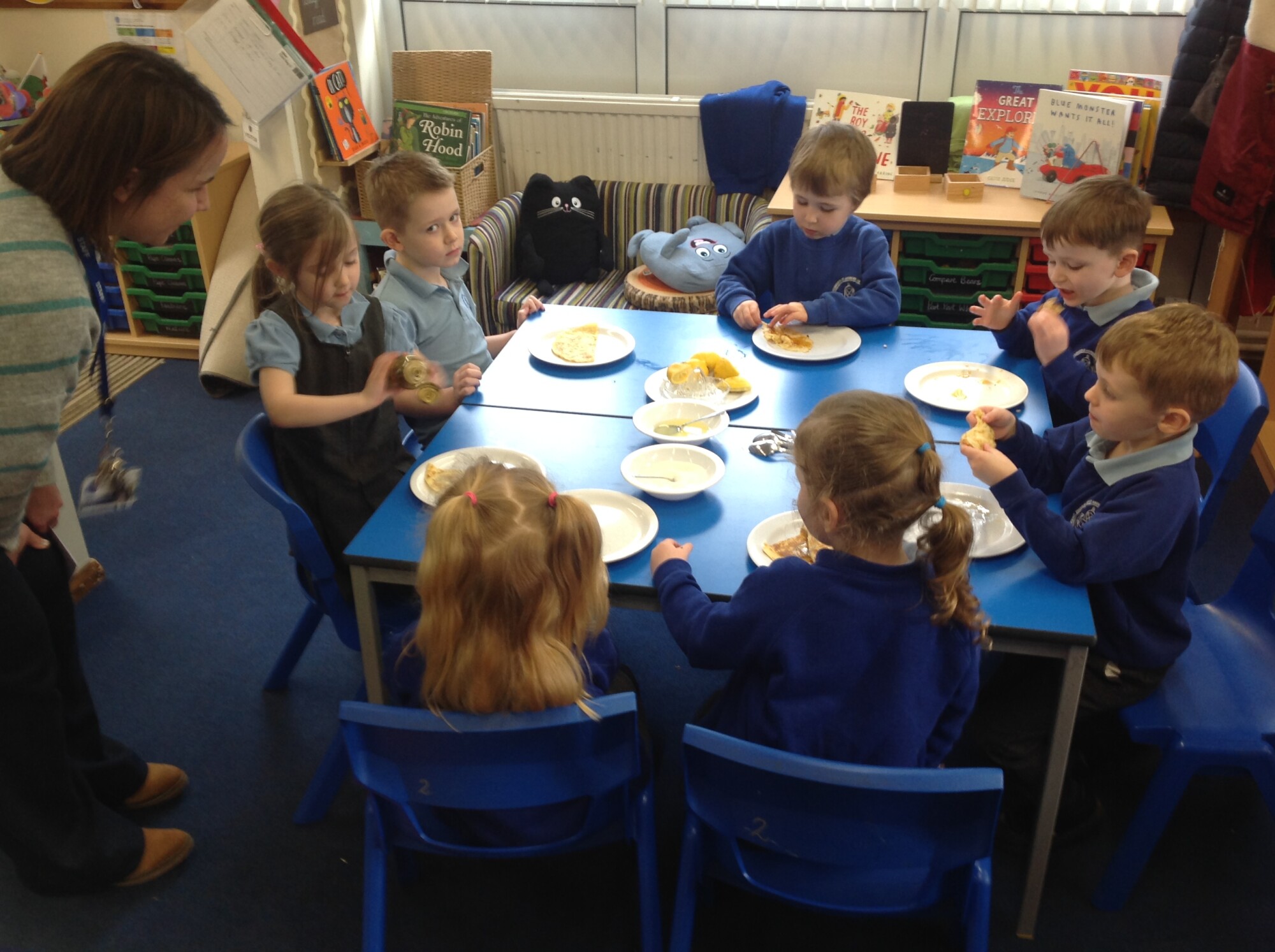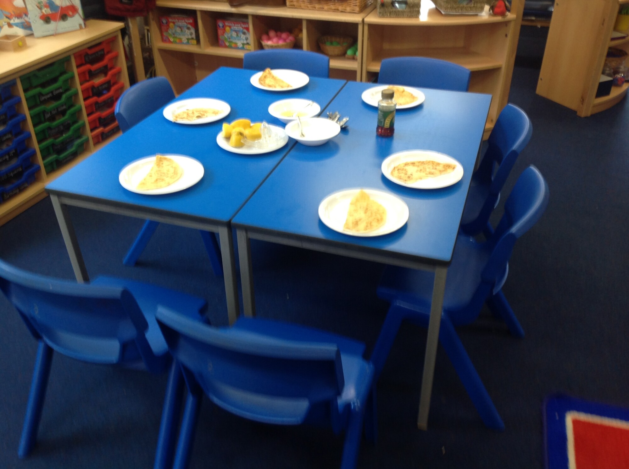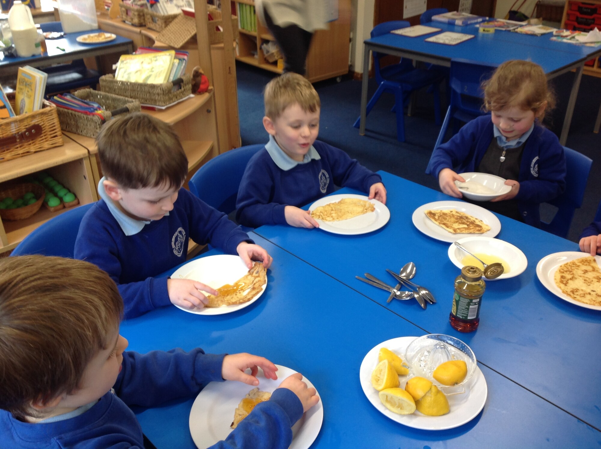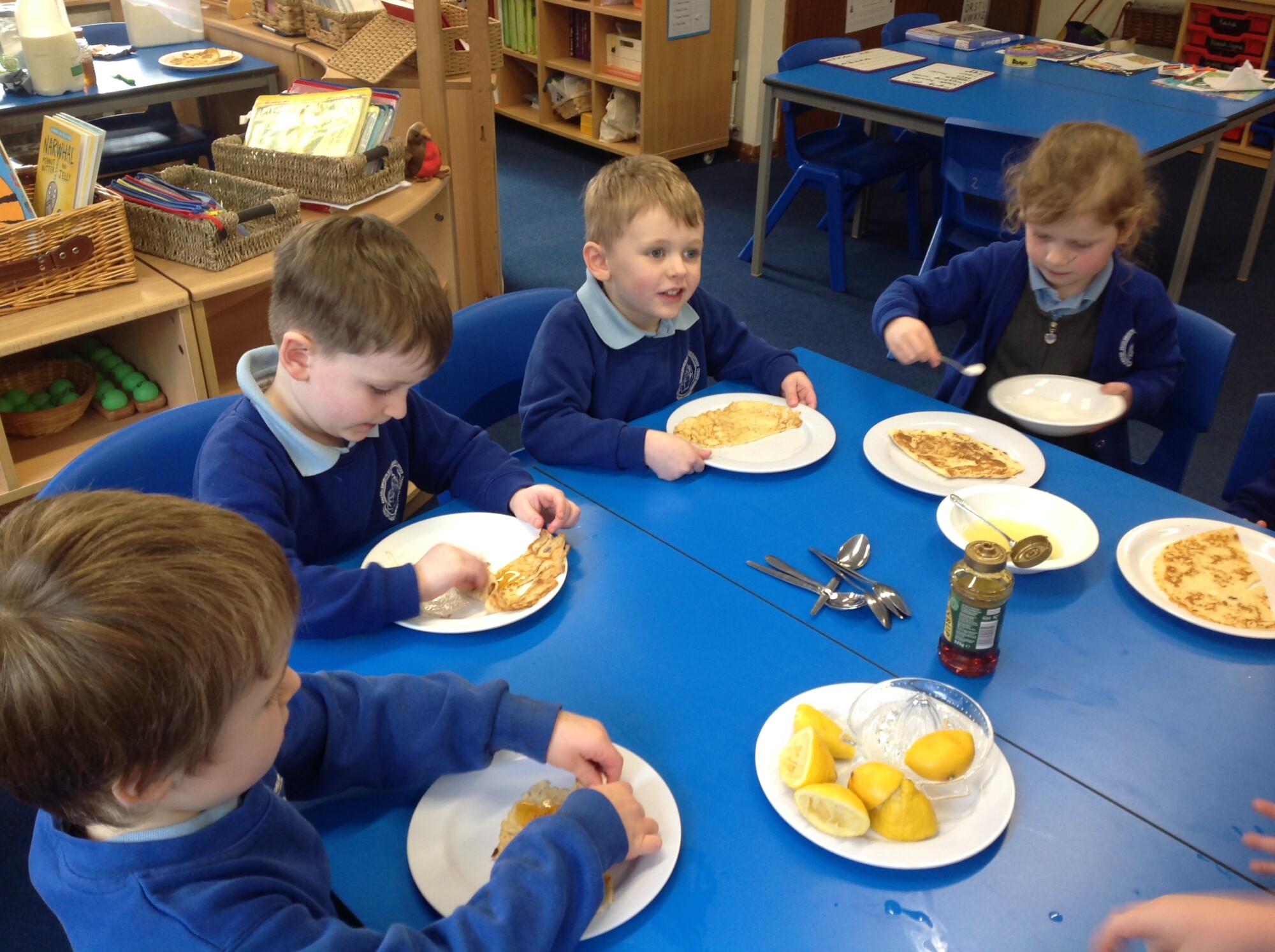 Wednesday, Rev. Mike led our worship and this week he talked about the significance of Shrove Tuesday, also known as Pancake Day, the day before the Christian period of Lent begins, a time to feast and use up foods such as eggs, sugar and milk, a time of fasting leading up to Easter. This year, Shrove Tuesday will take place in the half term holidays so we decided to use our Wednesday afternoon to make our own pancakes in class. Again, we introduced the children to the vocabulary of whisk (they were close, calling it a mixer, a stirrer, and whisker), we introduced the vocabulary of weighing scales (a measurer, a clock, a weigher). We talked about the ingredients and the toppings, using a juicer to juice the lemons and off we went - mixing and measuring - Mrs Langford cooked the pancakes and we ate them....even Mrs Bell popped in, following the delicious smell down the corridor!