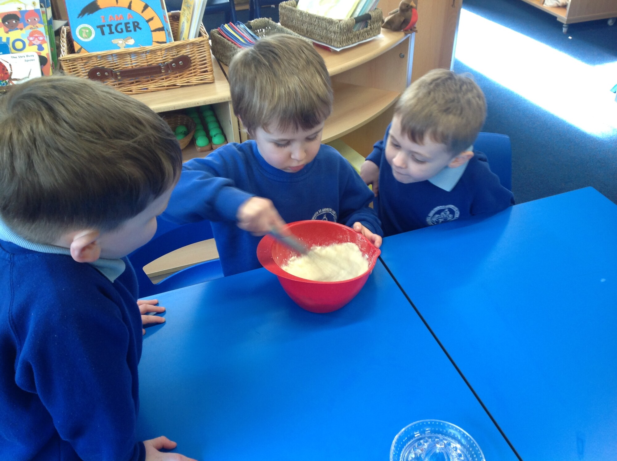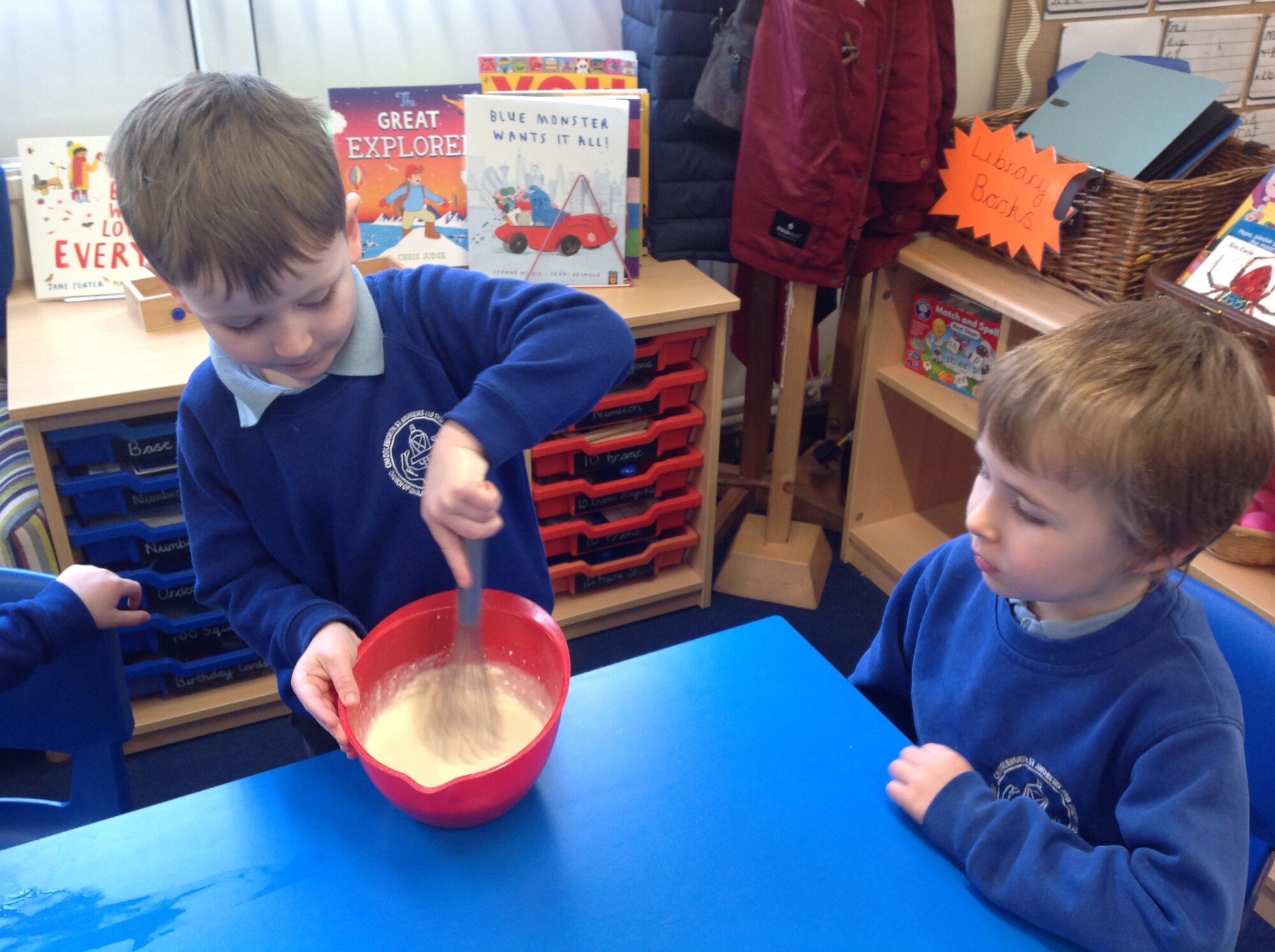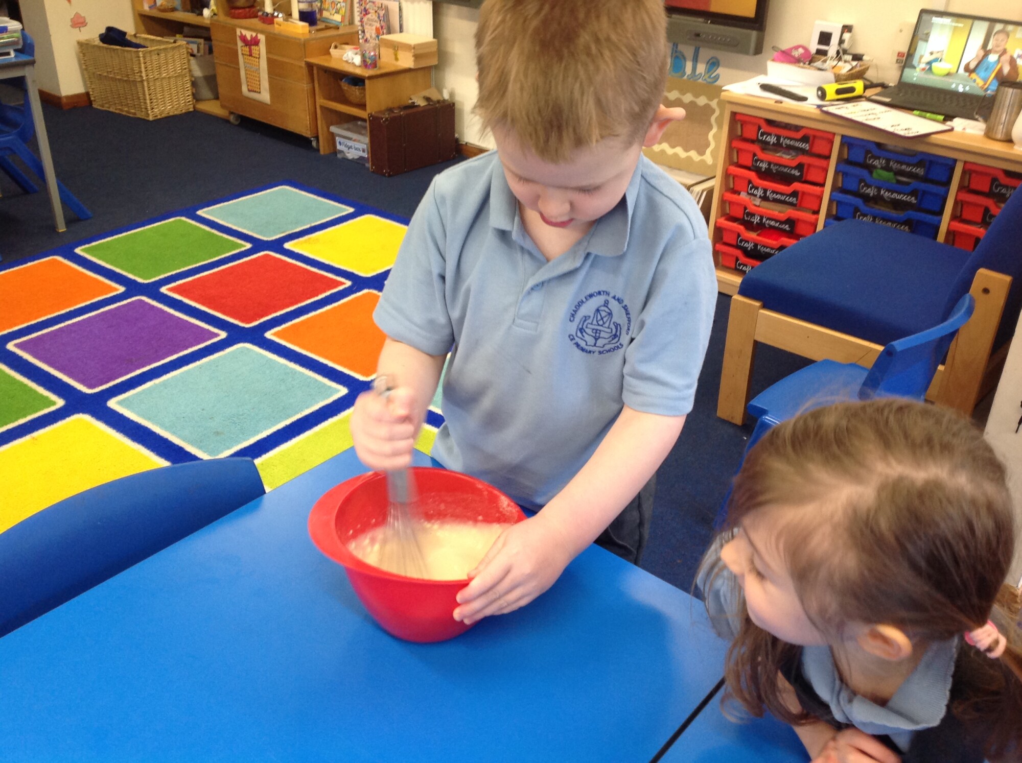 Wednesday, Rev. Mike led our worship and this week he talked about the significance of Shrove Tuesday, also known as Pancake Day, the day before the Christian period of Lent begins, a time to feast and use up foods such as eggs, sugar and milk, a time of fasting leading up to Easter. This year, Shrove Tuesday will take place in the half term holidays so we decided to use our Wednesday afternoon to make our own pancakes in class. Again, we introduced the children to the vocabulary of whisk (they were close, calling it a mixer, a stirrer, and whisker), we introduced the vocabulary of weighing scales (a measurer, a clock, a weigher). We talked about the ingredients and the toppings, using a juicer to juice the lemons and off we went - mixing and measuring - Mrs Langford cooked the pancakes and we ate them....even Mrs Bell popped in, following the delicious smell down the corridor!