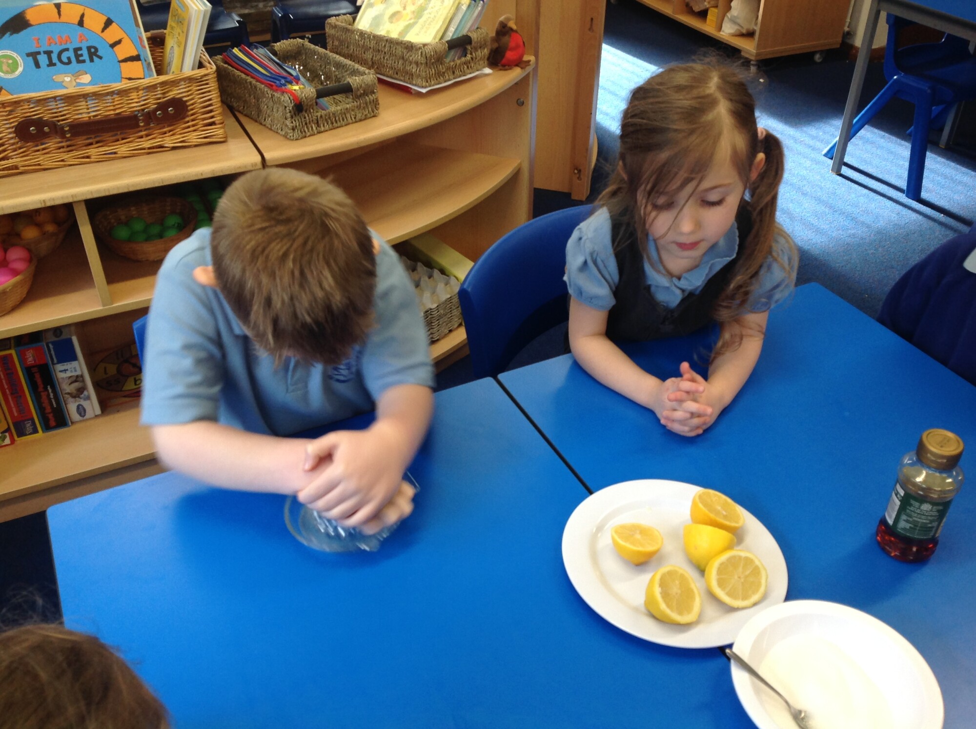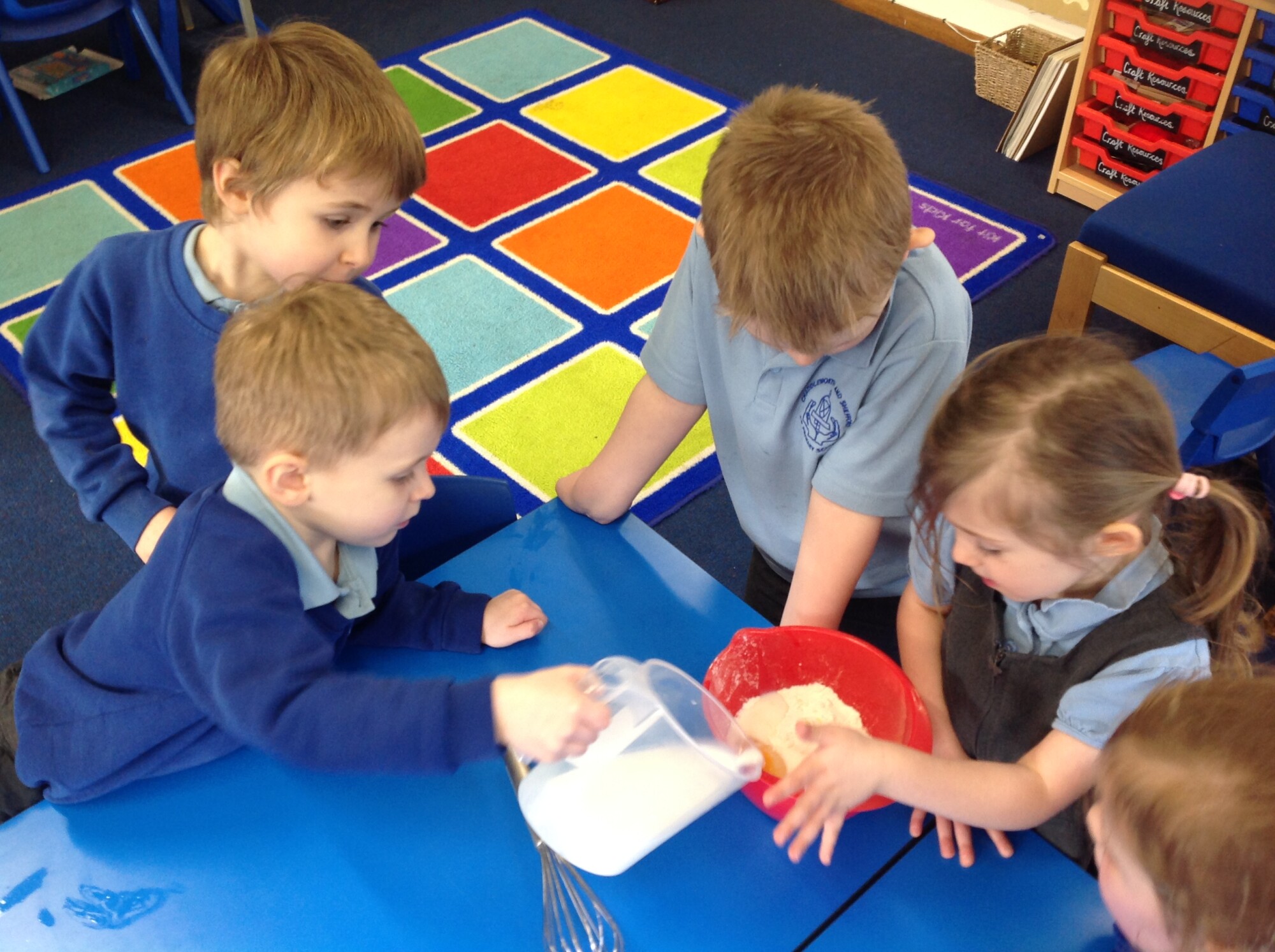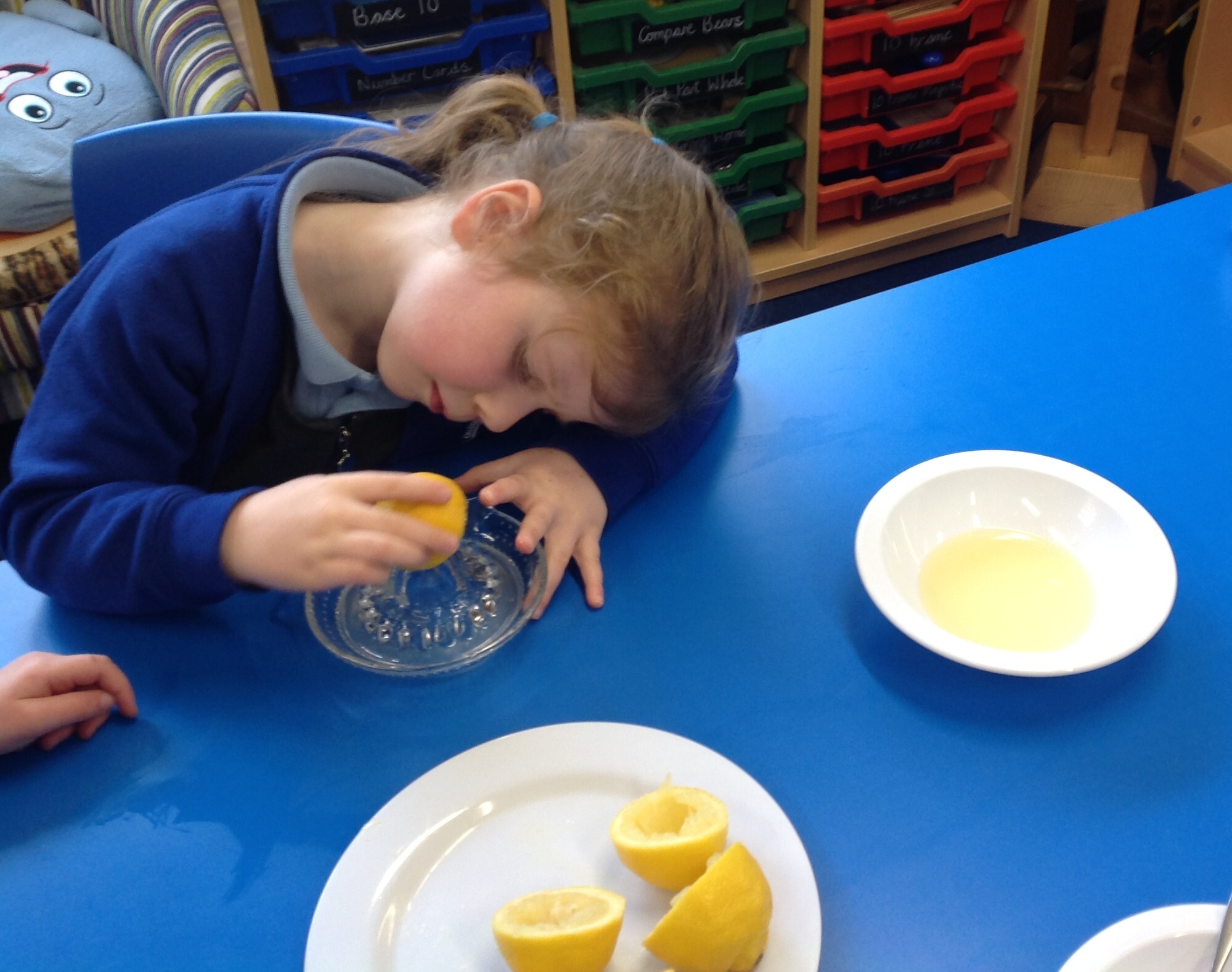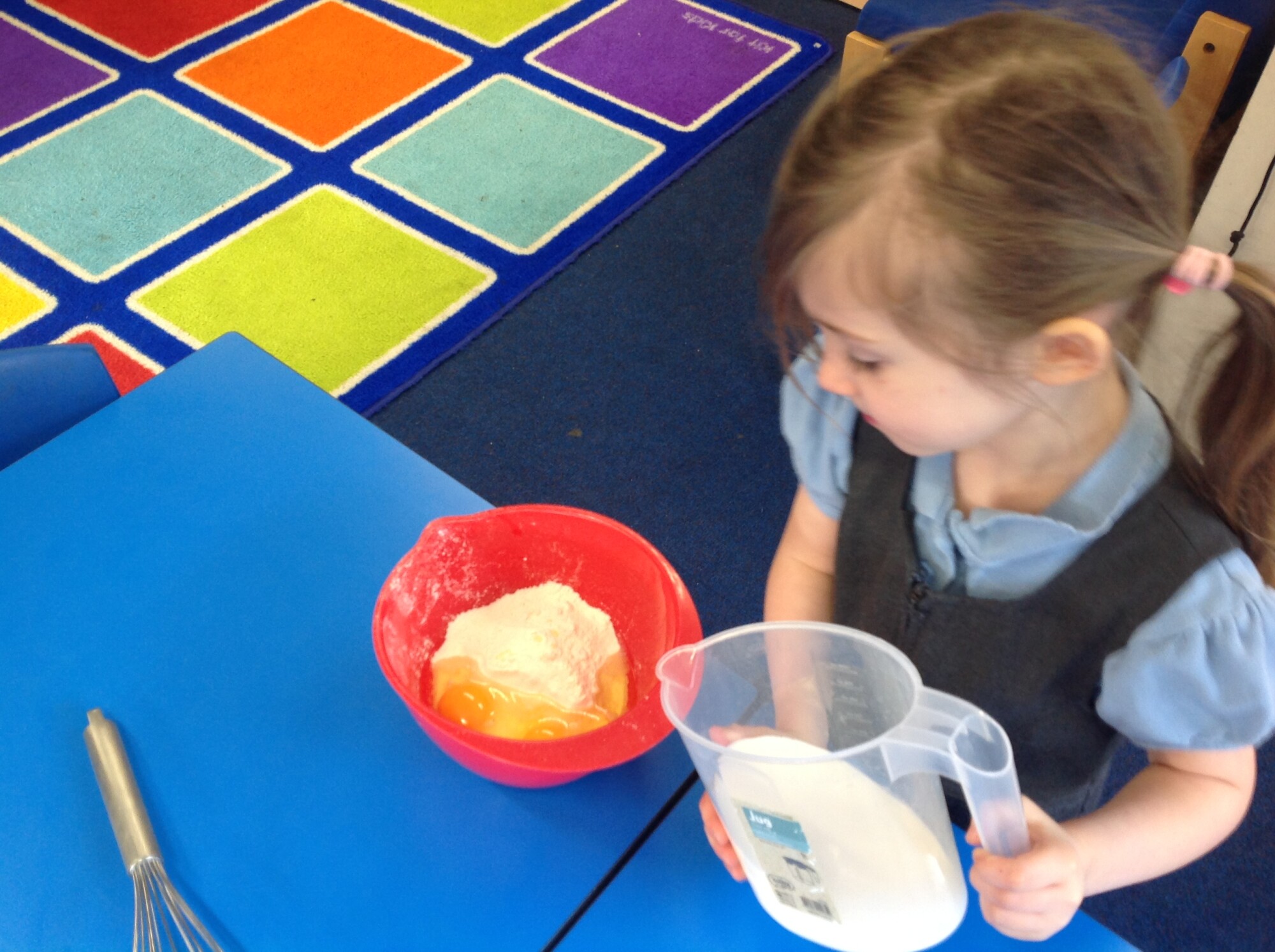 Wednesday, Rev. Mike led our worship and this week he talked about the significance of Shrove Tuesday, also known as Pancake Day, the day before the Christian period of Lent begins, a time to feast and use up foods such as eggs, sugar and milk, a time of fasting leading up to Easter. This year, Shrove Tuesday will take place in the half term holidays so we decided to use our Wednesday afternoon to make our own pancakes in class. Again, we introduced the children to the vocabulary of whisk (they were close, calling it a mixer, a stirrer, and whisker), we introduced the vocabulary of weighing scales (a measurer, a clock, a weigher). We talked about the ingredients and the toppings, using a juicer to juice the lemons and off we went - mixing and measuring - Mrs Langford cooked the pancakes and we ate them....even Mrs Bell popped in, following the delicious smell down the corridor!