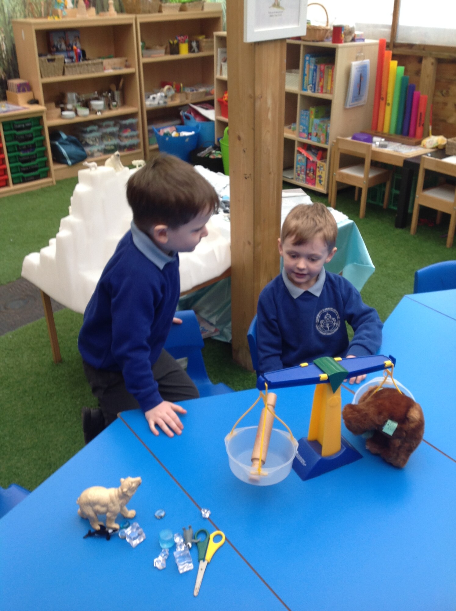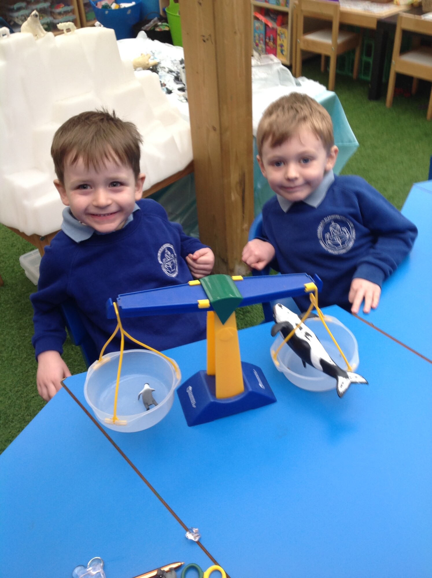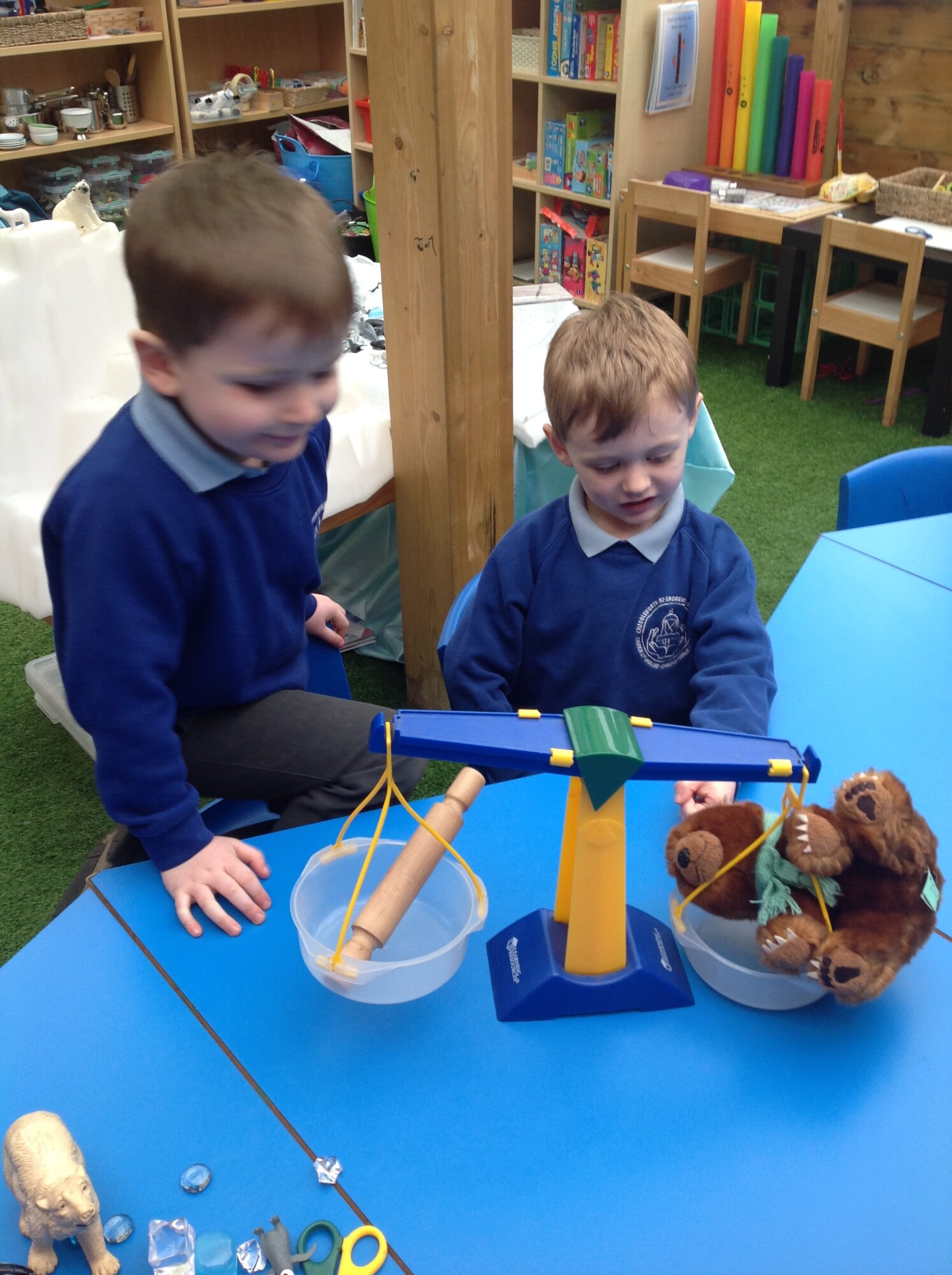 In Maths this week the children started to think about mass and weighing. They used balance scales to compare the mass of different objects. The side of the scales with the heavier object when down and the side of the scales with the lighter object went up. We talked about how they knew if an object was heavier or lighter and the used the vocabulary "lower" and "higher" to describe the position of the balance scales. The heavier object is "lower" on the balance scale and the lighter object is "higher" on the balance scale.