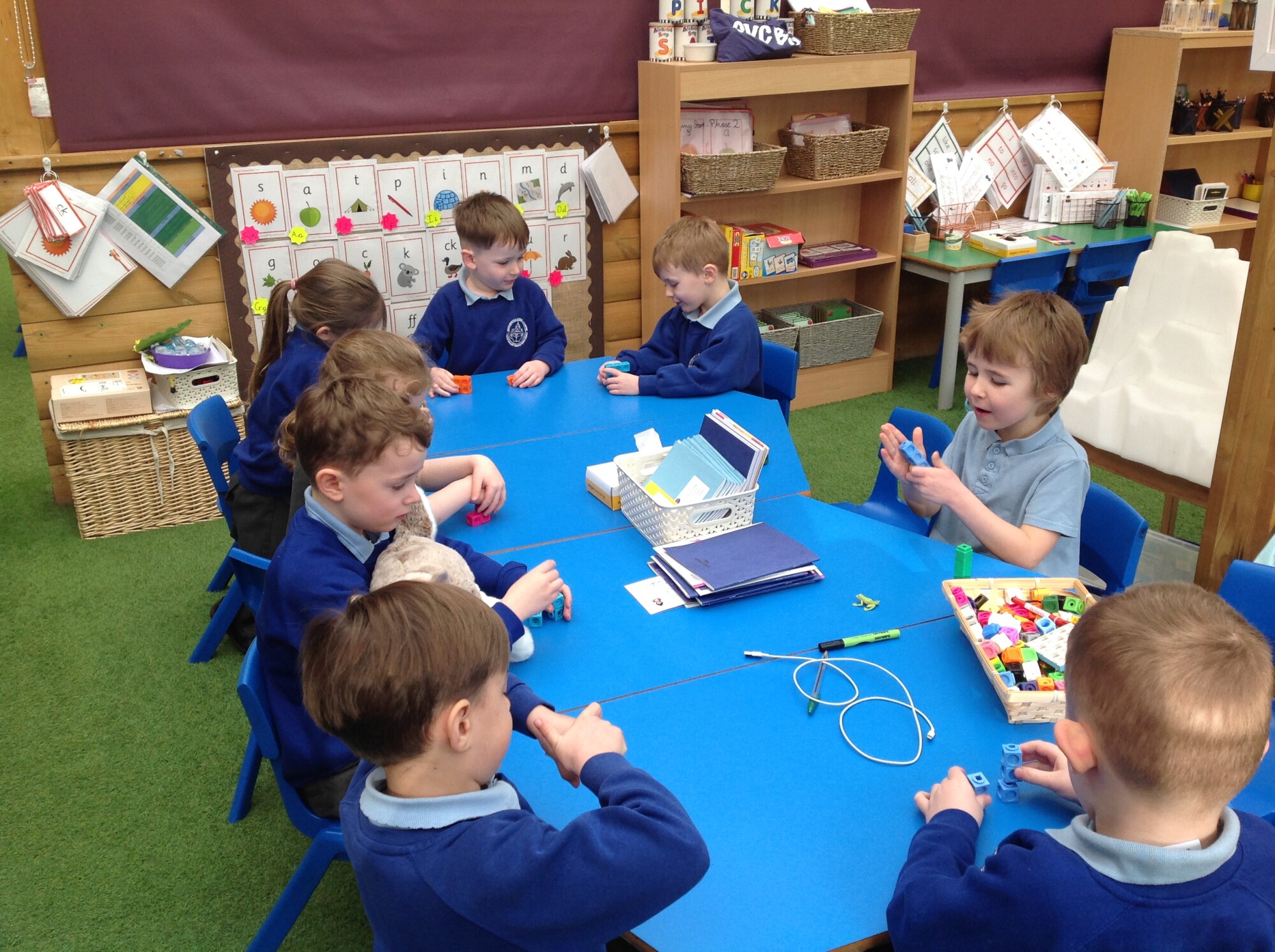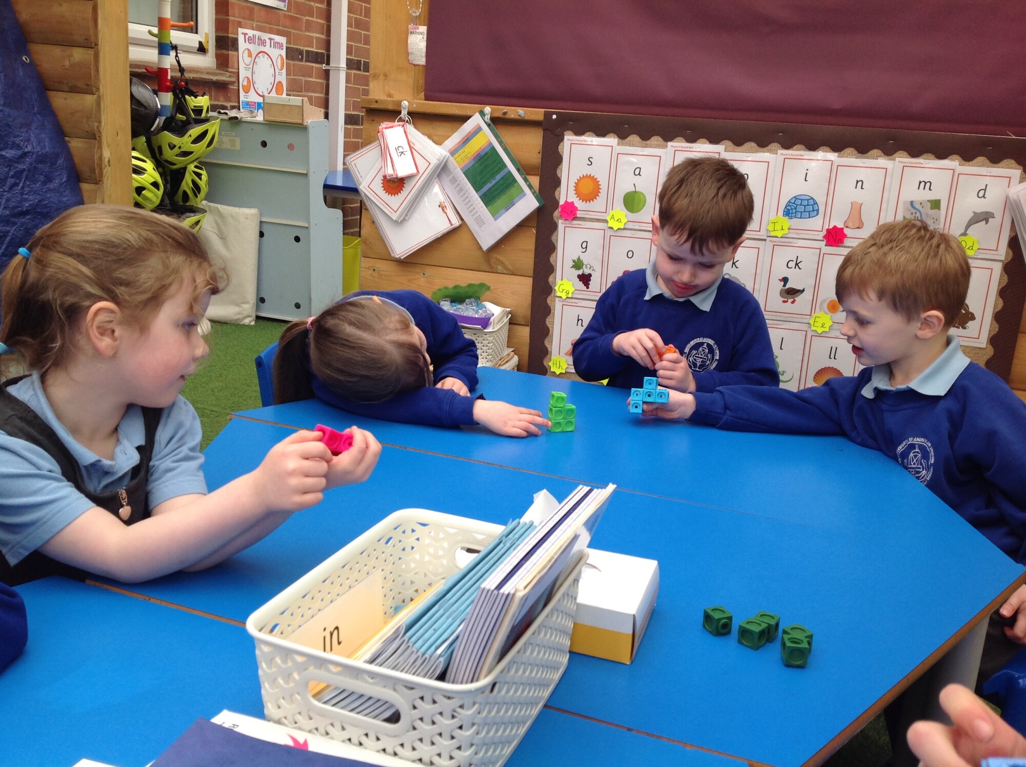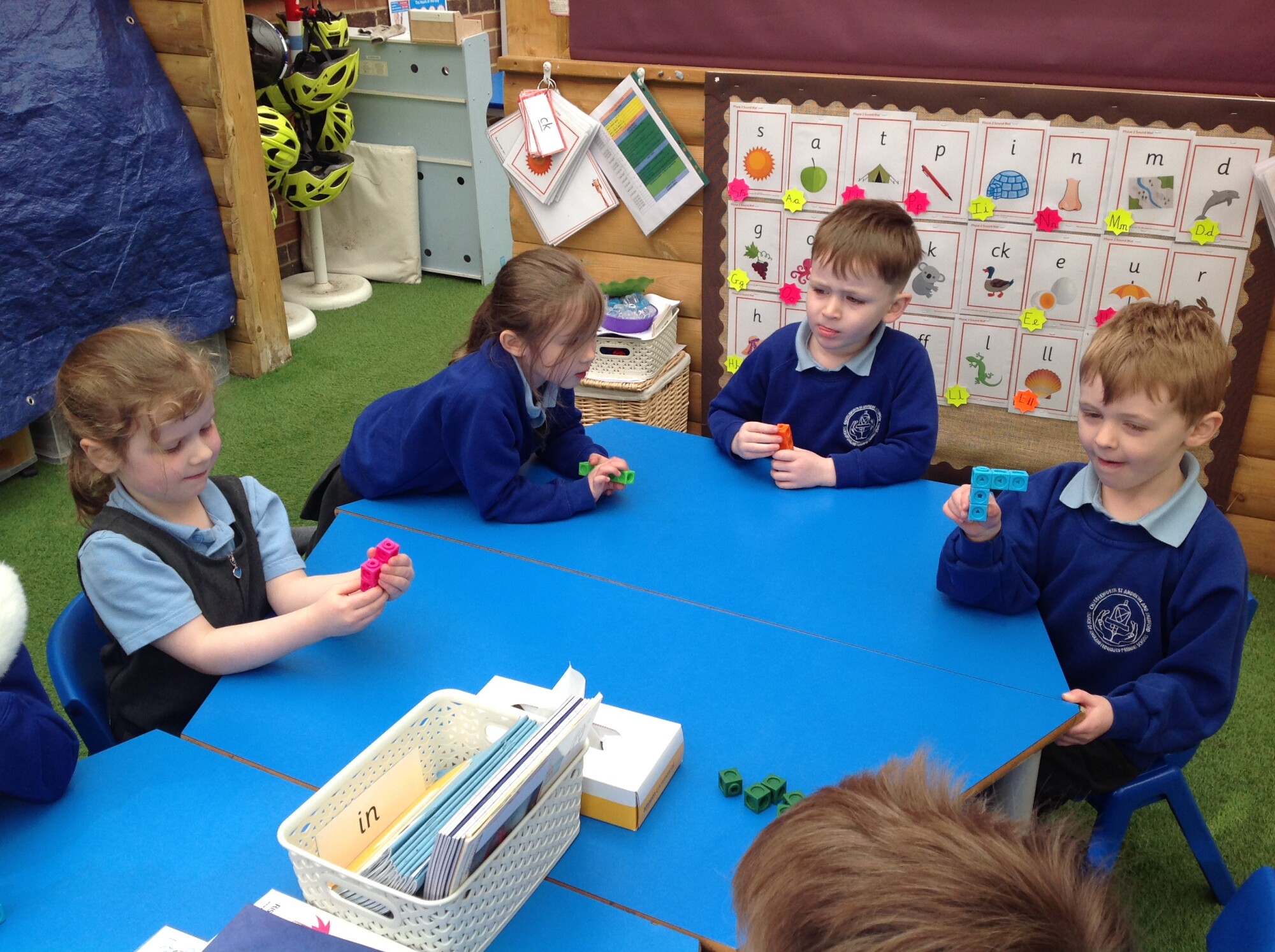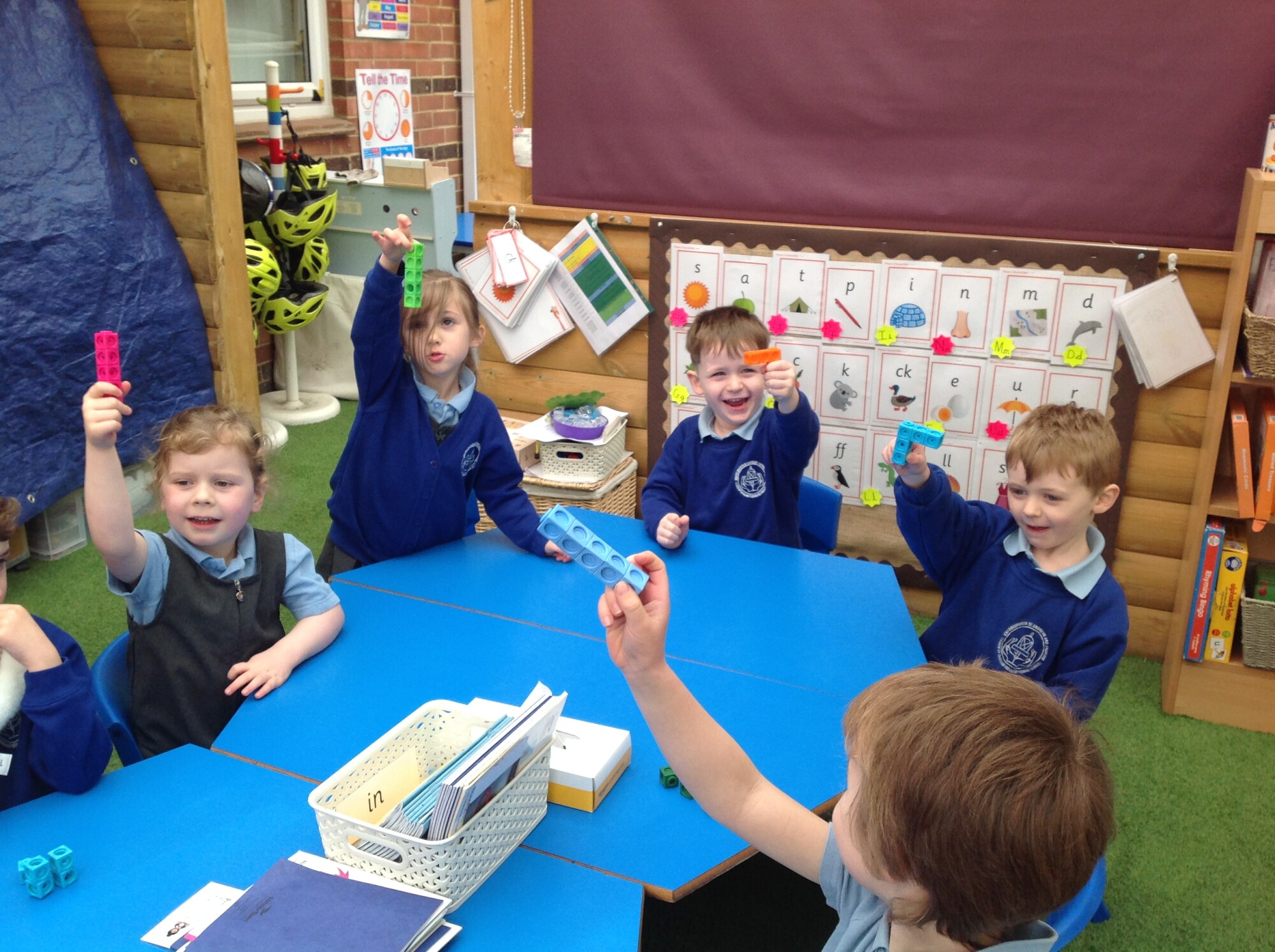In Maths this week we were 'taking 5 apart' and then putting in back together. We started off with a tower of 5 unifix cubes, we quickly discovered that we could take them apart and put them into groups e.g 4 and 1, 3 and 2, 5 and 0. However, we found that when we wanted to put them back together, we could only do it one way - back to a tower of 5. So, we brought in multilink - this was a game changer, we found so many ways of rearranging 5.