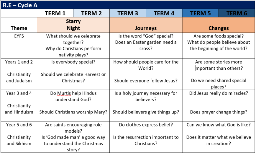 Religious Education is generally taught on a weekly basis, but is sometimes delivered through a class topic or as a whole RE day, for example if visiting a synagogue or gurdwara.
