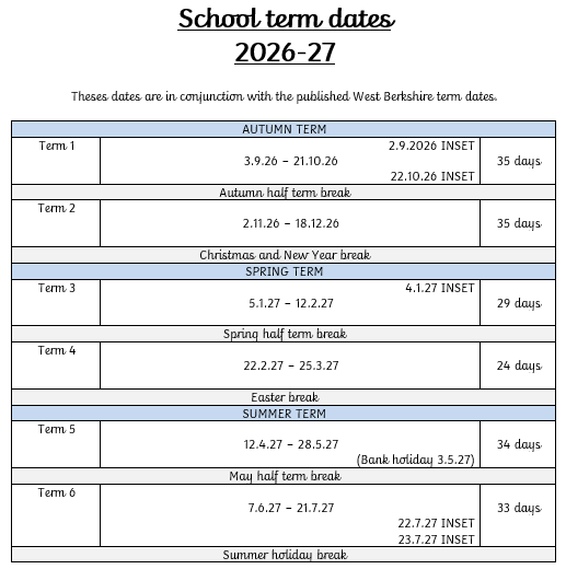 Term 1 – Thursday 3rd September 2026 – Wednesday 21st October 2026 (35 days)